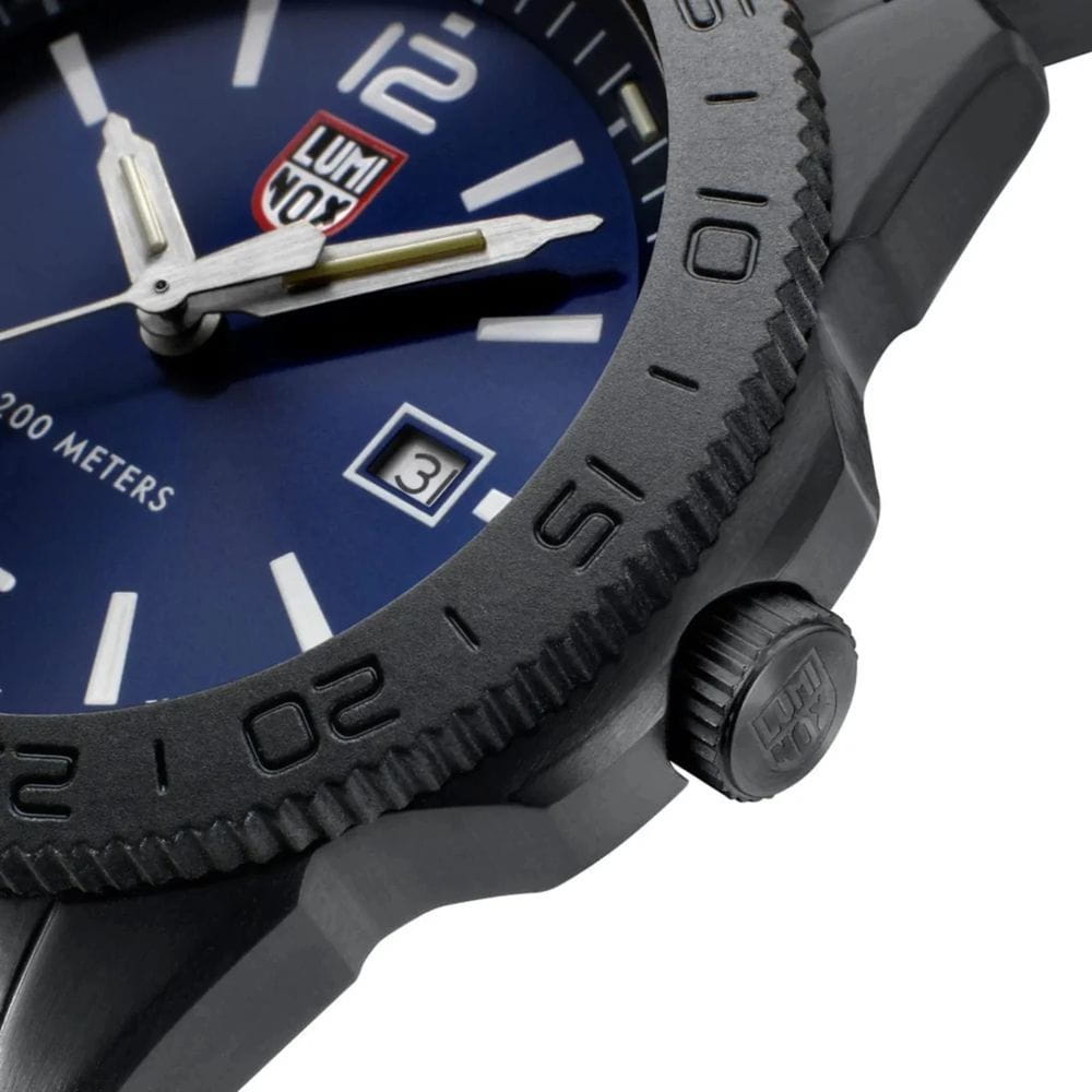 Luminox XS.3123.B — мужская модель серии Pacific Diver, сочетающая надёжность дайверских часов и современный стиль. Корпус диаметром 44 мм выполнен из нержавеющей стали с чёрным PVDPVDУльтратонкое покрытие наносится в технике вакуумного напыления, сочетает в себе нитрид титана особой прочности со слоем золота или оксида хрома. Несёт в себе декоративную или защитную функцию.-покрытием, а односторонний вращающийся безельБезельВнешний ободок, закрепляющий стекло. В спортивных часах так называется поворотное кольцо с делениями на циферблате, выполняет роль таймера – замеряет отрезки времени на шкале. Неподвижный безель – элемент декора. Однонаправленно вращающийся безель на дайверских часах позволяет фиксировать моменты погружения и выныривания на поверхность. из углеродного композита отличается прочностью и лёгкостью. Защитную функцию выполняет сапфировое стеклоСапфировое стеклоПрочный и надёжный материал из кристалла сапфира синтетического происхождения, характеризующийся особой твёрдостью и устойчивостью к царапинам и повреждениям. с антибликовым покрытиемАнтибликовое покрытиеСлой оксида металла в 0,13-0,3 микрон, благодаря которому стекло часов не бликует и не отражает свет. Антибликовое покрытие уменьшает отражение света в 10 раз, обеспечивая отличную читаемость показателей циферблата., обеспечивающим чёткую читаемость в любых условиях. Механизм — швейцарский кварцевый, с индикацией часов, минут, секунд и даты. Водозащита 200 м (20 бар) соответствует профессиональным стандартам для дайвинга. Метки и стрелки покрыты люминесцентным покрытиемЛюминесцентное покрытиеПозволяет считывать показания времени в темноте. Производители наносят на стрелки, часовые индексы, безель или поверхность циферблата светонакопительный состав, дающий холодное свечение. и дополнены системой Luminox Light Technology, которая обеспечивает постоянную подсветку до 25 лет без подзарядки. Модель укомплектована каучуковым ремешком с классической застёжкой, который подчёркивает спортивный характер и удобство при активном использовании.