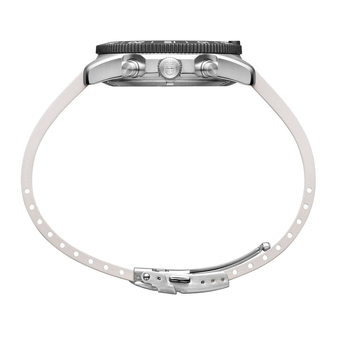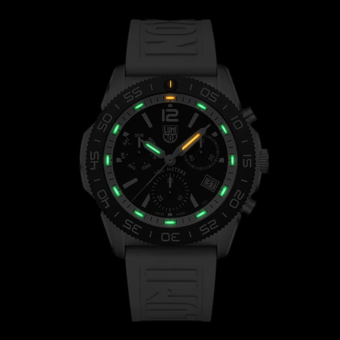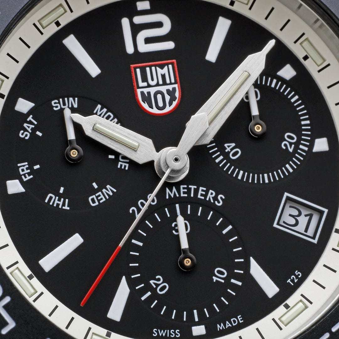 Швейцарские наручные часы Luminox Pacific Diver Chronograph XS.3141 – это идеальный симбиоз стиля и высокой функциональности. Оснащенные высокоточным кварцевым механизмом, они гарантируют безупречное времяизмерение и надежность в любом случае. Часы-хронографХронографФункция позволяет измерять отрезки времени с особой точностью: часы, минуты, секунды. Верным признаком хронографа является наличие на циферблате 3 дополнительных окошек-счётчиков. обладают функцией секундомераСекундомерСекундоме́р — прибор, способный измерять интервалы времени с точностью до долей секунды., что делает их практичными в использовании. Циферблат этих часов защищен сапфировым стекломСапфировое стеклоПрочный и надёжный материал из кристалла сапфира синтетического происхождения, характеризующийся особой твёрдостью и устойчивостью к царапинам и повреждениям. с антибликовым покрытиемАнтибликовое покрытиеСлой оксида металла в 0,13-0,3 микрон, благодаря которому стекло часов не бликует и не отражает свет. Антибликовое покрытие уменьшает отражение света в 10 раз, обеспечивая отличную читаемость показателей циферблата., которое славится своей прочностью и устойчивостью к царапинам, обеспечивая кристально чистый обзор. Корпус часов выполнен из качественной стали, что свидетельствует о долговечности и прочности изделия. Стрелки с LLTLLTLLT — это автономный механизм подсветки, основанный на использовании микроскопических газонаполненных элементов. Специальные герметичные капсулы из боросиликатного стекла, интегрированные в циферблат, генерируют свечение без необходимости подключения к внешним источникам энергии. Для их работы не требуется ни дополнительный свет, ни механическое воздействие (например, нажатие кнопки). Свечение возникает благодаря химическому процессу: реакция между тритием, заключенным в капсулах, и люминофорным покрытием создает стабильное автономное освещение. Технология обеспечивает энергетическую независимость и долговечность подсветки.-подсветкой, обеспечивают отличную видимость даже в условиях недостаточной освещенности, что делает их удобными для использования в любых условиях. Дополнительно часы располагают окошком даты в положении 4 часа, позволяющим быстро и удобно отслеживать текущую дату. Их внушительный класс водозащиты в 200 метров делает их идеальными для любителей водных видов спорта, таких как плавание и ныряние, не беспокоясь о повреждении механизма. Каучуковый ремешок, надёжно фиксирующий часы на запястье с помощью раскладной застёжкиРаскладная застёжкаТакой тип застёжки используется только на браслетах из металла. Она никогда не раскрывается полностью, происходит разделение на 2 и более частей. Раскладывающая застёжка снизит вероятность потери часов к минимуму., обеспечивает комфортное ношение в течение всего дня. Стильный вращающийся безельБезельВнешний ободок, закрепляющий стекло. В спортивных часах так называется поворотное кольцо с делениями на циферблате, выполняет роль таймера – замеряет отрезки времени на шкале. Неподвижный безель – элемент декора. Однонаправленно вращающийся безель на дайверских часах позволяет фиксировать моменты погружения и выныривания на поверхность., изготовленный из карбонаКарбонОт «carbon», «carbone» - углерод, углепластик - полимерный композиционный материал из переплетё