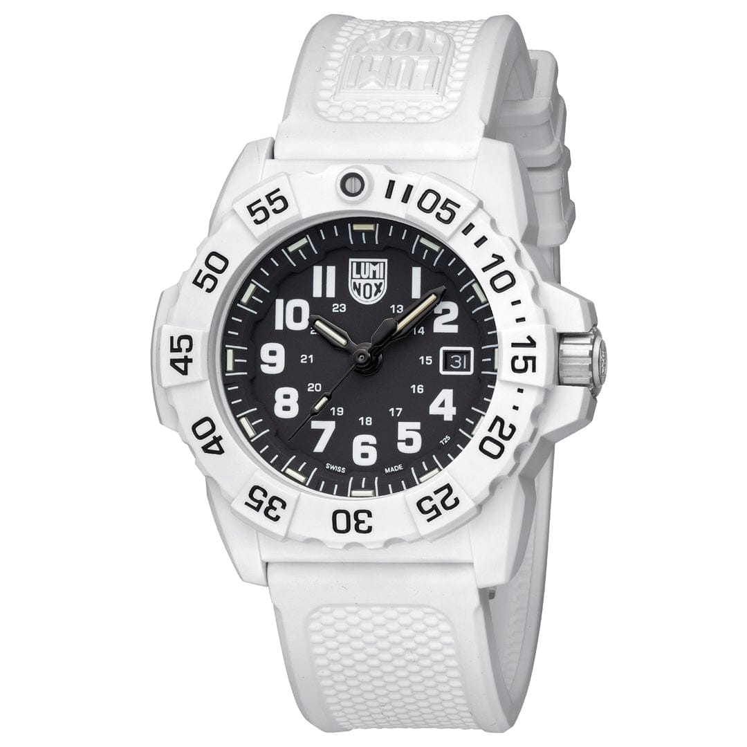 Часы Luminox XS.3507.WB — это надежные и стильные швейцарские часы с кварцевым механизмом, оснащенные калибром Ronda 515. Корпус выполнен из пластика, усиленного прессованным карбоном CARBONOX, что обеспечивает прочность и долговечность. Черный циферблат защищен минеральным стекломМинеральное стеклоМинеральное стекло представляет собой искусственно выращенный минерал кварца. Такое стекло отличается особой устойчивостью к повреждениям и царапинам. Уступает по некоторым качествам сапфировому стеклу. повышенной прочности, что делает его устойчивым к царапинам и ударам. Резиновый ремешок с классической застежкой обеспечивает комфортное ношение и надежность фиксации на запястье. Эти часы обладают впечатляющим уровнем водозащиты до 200 метров, что делает их подходящими для водных видов спорта и активного отдыха. Светящаяся метка на безелеБезельВнешний ободок, закрепляющий стекло. В спортивных часах так называется поворотное кольцо с делениями на циферблате, выполняет роль таймера – замеряет отрезки времени на шкале. Неподвижный безель – элемент декора. Однонаправленно вращающийся безель на дайверских часах позволяет фиксировать моменты погружения и выныривания на поверхность., который вращается в одном направлении, добавляет функциональности и удобства, особенно в условиях низкой освещенности. Технология LLTLLTLLT — это автономный механизм подсветки, основанный на использовании микроскопических газонаполненных элементов. Специальные герметичные капсулы из боросиликатного стекла, интегрированные в циферблат, генерируют свечение без необходимости подключения к внешним источникам энергии. Для их работы не требуется ни дополнительный свет, ни механическое воздействие (например, нажатие кнопки). Свечение возникает благодаря химическому процессу: реакция между тритием, заключенным в капсулах, и люминофорным покрытием создает стабильное автономное освещение. Технология обеспечивает энергетическую независимость и долговечность подсветки.-подсветки обеспечивает отличную видимость в темноте на протяжении 25 лет, позволяя контролировать время даже при полном отсутствии света. Часы поддерживают отображение времени в 12- и 24-часовом формате, а наличие календаря с указанием числа добавляет практичности. Заводная головка снабжена защитой и двойной уплотнительной прокладкой для обеспечения герметичности, а задняя крышка крепится на винтах для дополнительной надежности.