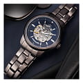 Синий циферблат позволяет наблюдать за работой автоматического механизма Seiko NH70, подчеркивая техническую элегантность модели. Стрелки и часовые метки покрыты люминесцентным составомЛюминесцентное покрытиеПозволяет считывать показания времени в темноте. Производители наносят на стрелки, часовые индексы, безель или поверхность циферблата светонакопительный состав, дающий холодное свечение., обеспечивая отличную читаемость в условиях низкой освещённости.