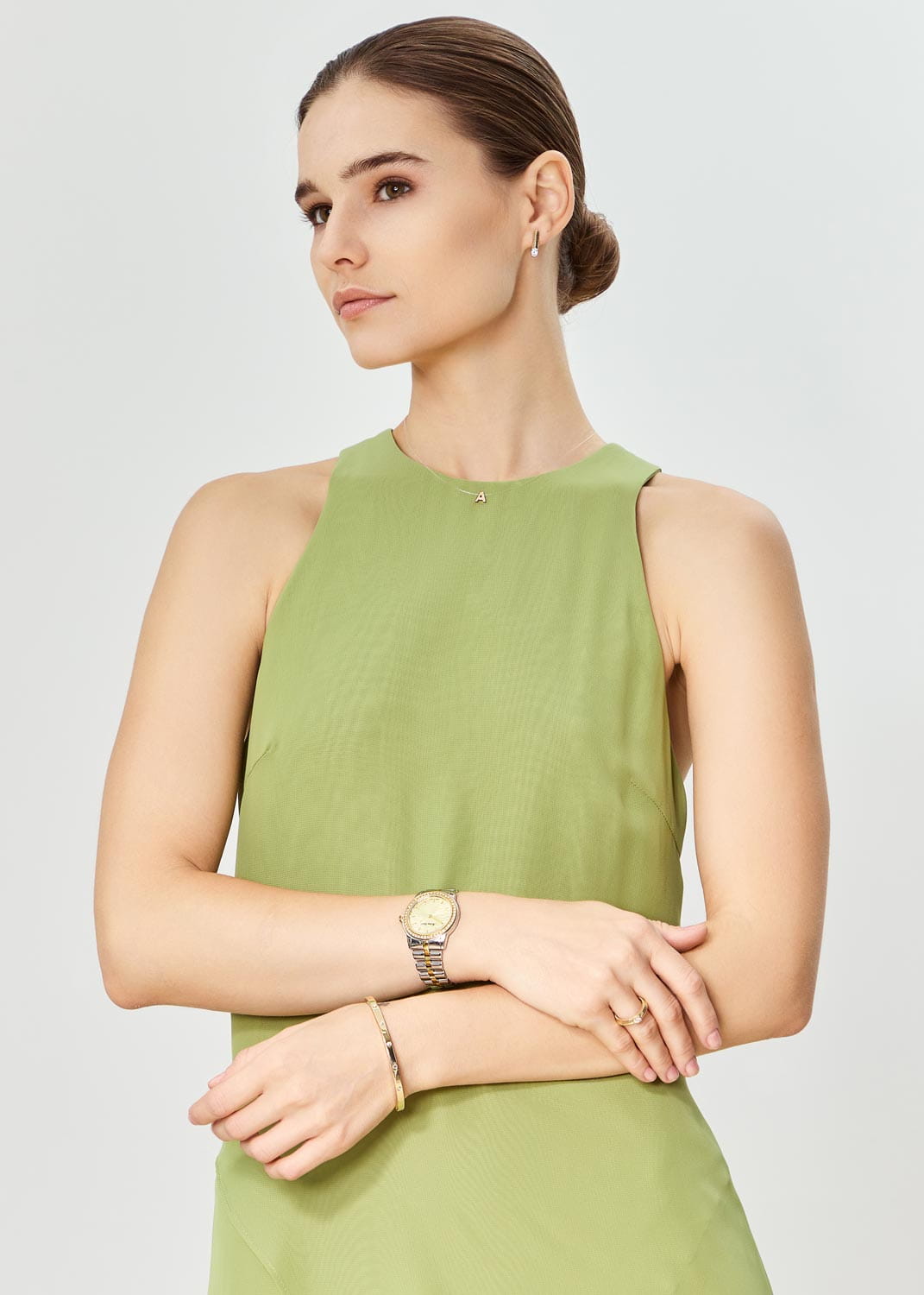 Женские кварцевые часы Mathey-Tissot Artemis D10860BQDI — это стильное сочетание элегантности и современного дизайна. Изящный корпус выполнен из стали 316L с безелемБезельВнешний ободок, закрепляющий стекло. В спортивных часах так называется поворотное кольцо с делениями на циферблате, выполняет роль таймера – замеряет отрезки времени на шкале. Неподвижный безель – элемент декора. Однонаправленно вращающийся безель на дайверских часах позволяет фиксировать моменты погружения и выныривания на поверхность. с PVD-покрытиемPVDУльтратонкое покрытие наносится в технике вакуумного напыления, сочетает в себе нитрид титана особой прочности со слоем золота или оксида хрома. Несёт в себе декоративную или защитную функцию., украшенным кристаллами, что придаст образу женственности и романтизма. Изысканный циферблат с метками в виде штрихов придает модели особый блеск и защищен минеральным стекломМинеральное стеклоМинеральное стекло представляет собой искусственно выращенный минерал кварца. Такое стекло отличается особой устойчивостью к повреждениям и царапинам. Уступает по некоторым качествам сапфировому стеклу., обеспечивающим устойчивость к царапинам. Центральные часовая, минутная стрелки. Часы оснащены надежным кварцевым механизмом. Стальной браслет с частичным PVD-покрытиемPVDУльтратонкое покрытие наносится в технике вакуумного напыления, сочетает в себе нитрид титана особой прочности со слоем золота или оксида хрома. Несёт в себе декоративную или защитную функцию. на застёжке-бабочке с кнопкамиЗастёжка "бабочка"Такой вид застёжки дополняется предохранителями, помогающими избежать случайного раскрытия браслета. Обладают изящным исполнением. , гарантирующего комфортное и безопасное ношение. Класс водозащиты: 50 метров позволит защитить корпус от случайных брызг или капель дождя. Mathey-Tissot  — отличный выбор для тех, кто ценит утонченность и качество.