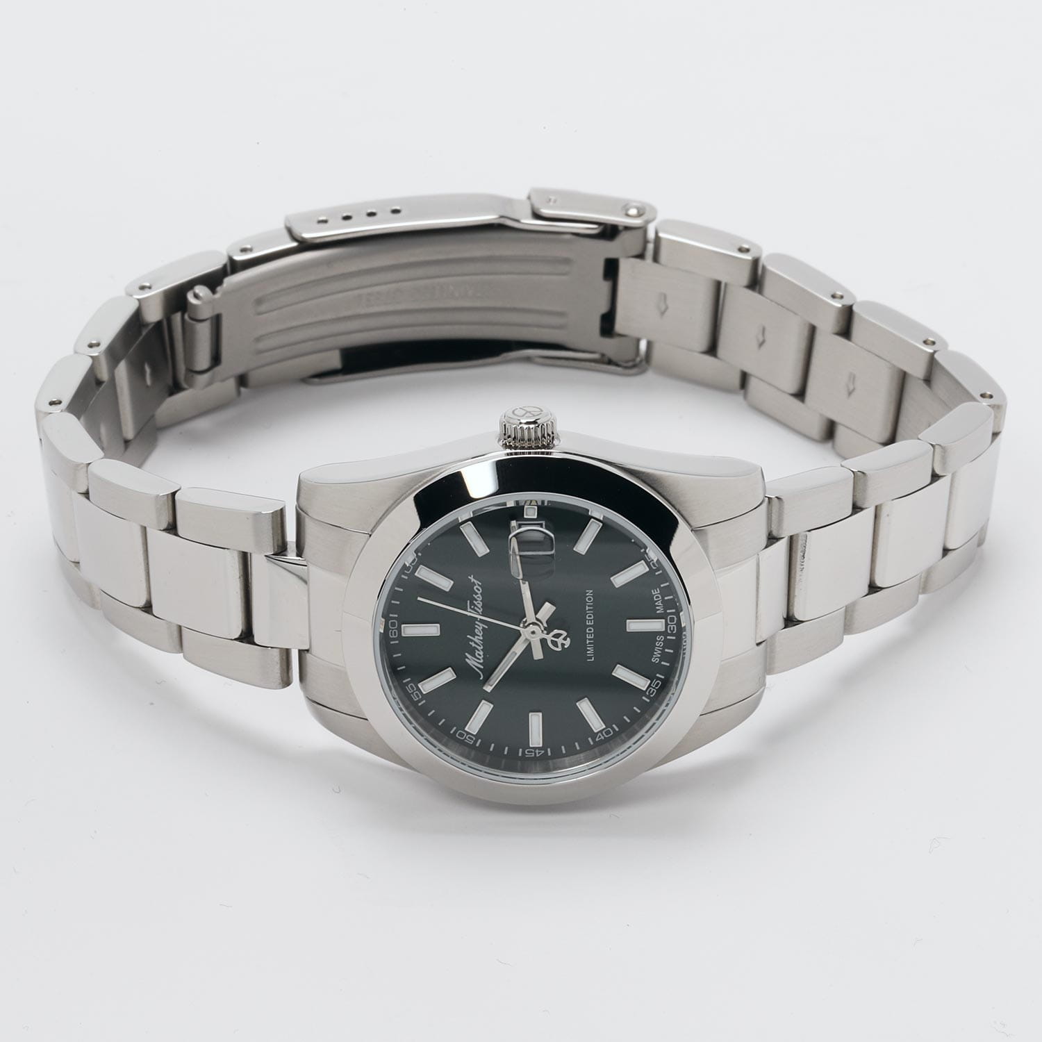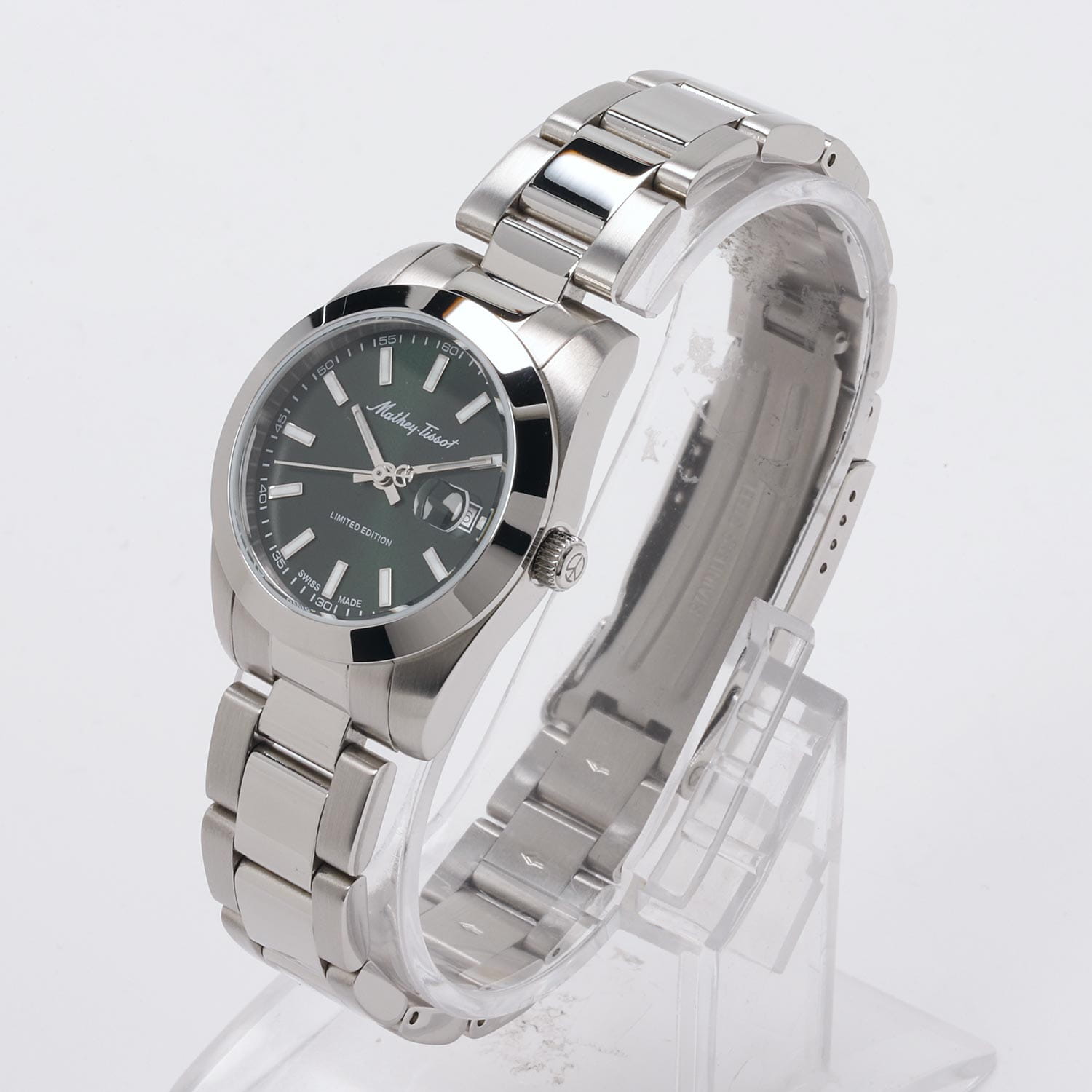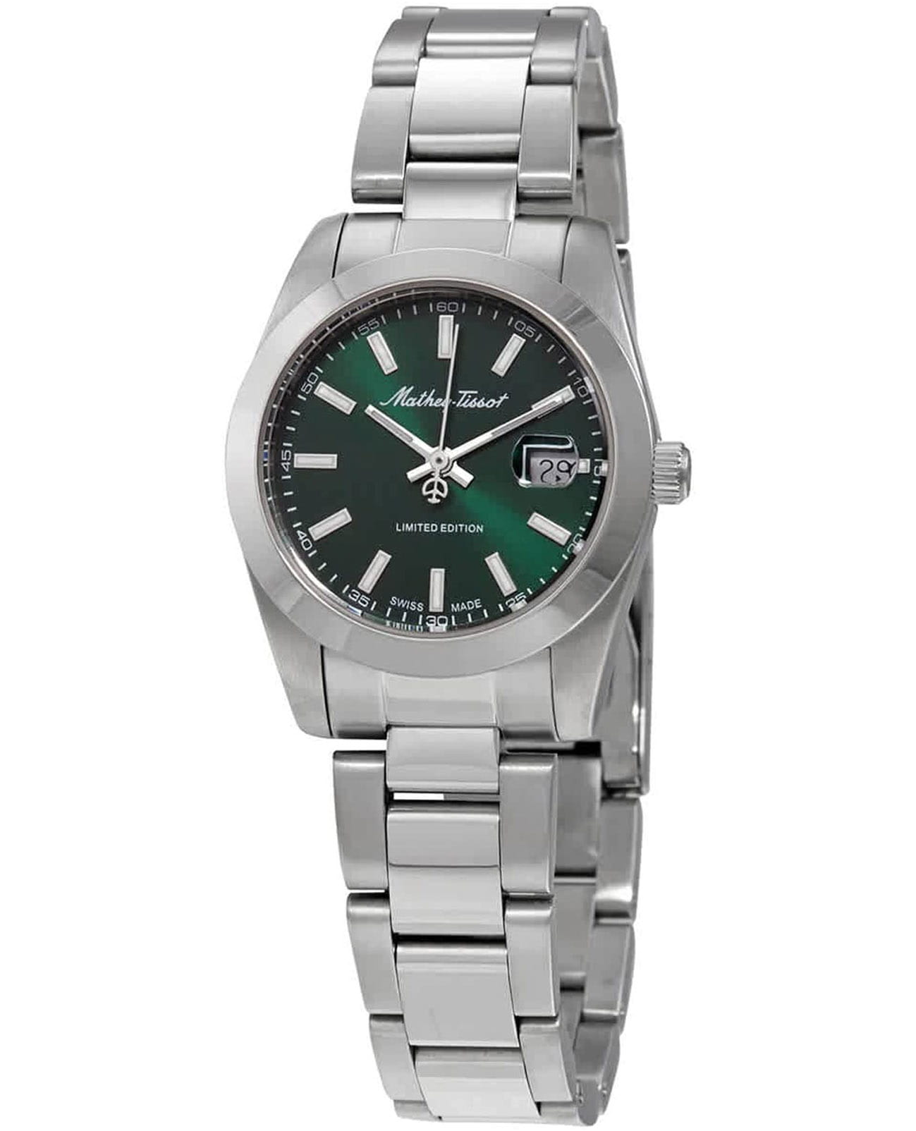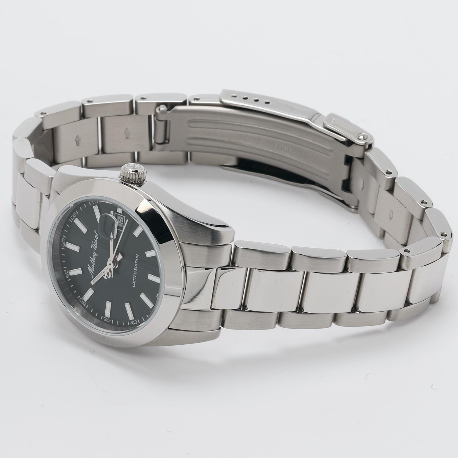 Женские кварцевые часы Mathey-Tissot Mathy D451VE — это стильное сочетание элегантности и современного дизайна. Лимитированная серия. Изящный корпус выполнен из нержавеющей стали, диаметром 32 мм, что придаст образу женственности и романтизма. Изысканный циферблат с метками в виде штрихов придает модели особый блеск. Циферблат защищен минеральным стекломМинеральное стеклоМинеральное стекло представляет собой искусственно выращенный минерал кварца. Такое стекло отличается особой устойчивостью к повреждениям и царапинам. Уступает по некоторым качествам сапфировому стеклу., обеспечивающий устойчивость к царапинам. Стрелки и метки с люминесцентным покрытиемЛюминесцентное покрытиеПозволяет считывать показания времени в темноте. Производители наносят на стрелки, часовые индексы, безель или поверхность циферблата светонакопительный состав, дающий холодное свечение.. Окошко даты находится в положении 3 часа. Часы оснащены надежным кварцевым механизмом. Стальной браслет на раскладной застёжке с фиксаторомРаскладная застёжкаТакой тип застёжки используется только на браслетах из металла. Она никогда не раскрывается полностью, происходит разделение на 2 и более частей. Раскладывающая застёжка снизит вероятность потери часов к минимуму., гарантирует комфортное и безопасное ношение. Класс водозащиты: 50 метров позволит защитить корпус от случайных брызг или капель дождя. Mathey-Tissot — отличный выбор для тех, кто ценит утонченность и качество.