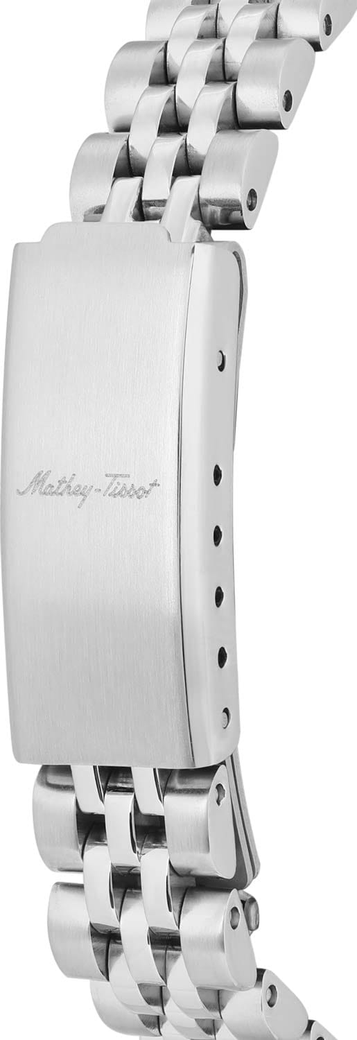 Женские кварцевые часы Mathey-Tissot Mathy D810APU — это стильное сочетание элегантности и современного дизайна. Изящный корпус выполнен из нержавеющей стали, диаметром 30 мм, что придаст образу женственности и романтизма. Изысканный циферблат с метками в виде точек украшены кристаллами, что придает модели особый блеск. Циферблат защищен минеральным стекломМинеральное стеклоМинеральное стекло представляет собой искусственно выращенный минерал кварца. Такое стекло отличается особой устойчивостью к повреждениям и царапинам. Уступает по некоторым качествам сапфировому стеклу., обеспечивающий устойчивость к царапинам. Стрелки с люминесцентным покрытиемЛюминесцентное покрытиеПозволяет считывать показания времени в темноте. Производители наносят на стрелки, часовые индексы, безель или поверхность циферблата светонакопительный состав, дающий холодное свечение.. Окошко даты находится в положении 3 часа. Часы оснащены надежным кварцевым механизмом. Стальной браслет на раскладной застёжкеРаскладная застёжкаТакой тип застёжки используется только на браслетах из металла. Она никогда не раскрывается полностью, происходит разделение на 2 и более частей. Раскладывающая застёжка снизит вероятность потери часов к минимуму., гарантирует комфортное и безопасное ношение. Класс водозащиты: 50 метров позволит защитить корпус от случайных брызг или капель дождя. Mathey-Tissot  — отличный выбор для тех, кто ценит утонченность и качество.
