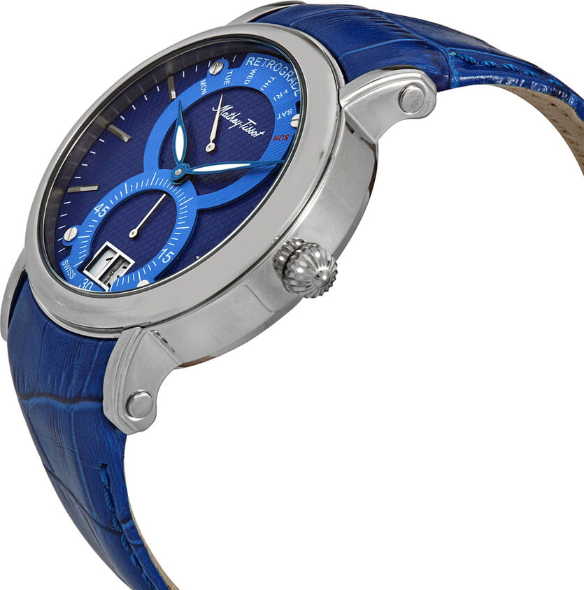 Mathey-Tissot Retrograde H7022ABU — практичные часы с ярким дизайном и ретроградным указателем дня недели станут отличным вариантом на каждый день. Изящный корпус выполнен из нержавеющей стали, диаметром 43 мм, что придаст образу элегантности и надежности. Изысканный циферблат с метками в виде штрихов придает модели особый блеск. Циферблат защищен минеральным стекломМинеральное стеклоМинеральное стекло представляет собой искусственно выращенный минерал кварца. Такое стекло отличается особой устойчивостью к повреждениям и царапинам. Уступает по некоторым качествам сапфировому стеклу., обеспечивает устойчивость к царапинам. Стрелки с люминесцентным покрытиемЛюминесцентное покрытиеПозволяет считывать показания времени в темноте. Производители наносят на стрелки, часовые индексы, безель или поверхность циферблата светонакопительный состав, дающий холодное свечение.. Окошко даты находится в положении 6 часов. Часы оснащены надежным кварцевым механизмом. Кожаный ремешок на раскладной застёжкеРаскладная застёжкаТакой тип застёжки используется только на браслетах из металла. Она никогда не раскрывается полностью, происходит разделение на 2 и более частей. Раскладывающая застёжка снизит вероятность потери часов к минимуму. гарантирует комфортное и безопасное ношение. Класс водозащиты: 50 метров позволит защитить корпус от случайных брызг или капель дождя. Mathey-Tissot — отличный выбор для тех, кто ценит утонченность и качество.