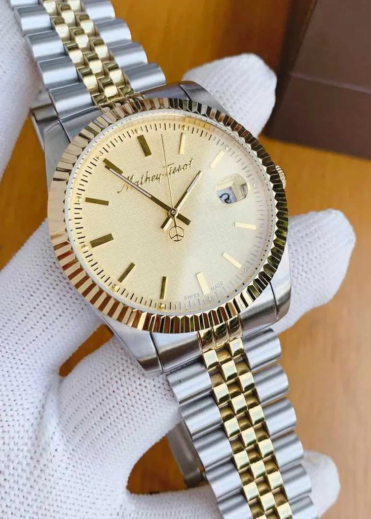 Мужские кварцевые часы Mathey-Tissot Mathy H810BDI — это стильное сочетание элегантности и современного дизайна. Изящный корпус выполнен из нержавеющей стали, диаметром 40 мм, что придаст образу элегантности и надежности. Изысканный циферблат с метками в виде штрихов придает модели особый блеск. Циферблат защищен минеральным стекломМинеральное стеклоМинеральное стекло представляет собой искусственно выращенный минерал кварца. Такое стекло отличается особой устойчивостью к повреждениям и царапинам. Уступает по некоторым качествам сапфировому стеклу., обеспечивает устойчивость к царапинам. Стрелки с люминесцентным покрытиемЛюминесцентное покрытиеПозволяет считывать показания времени в темноте. Производители наносят на стрелки, часовые индексы, безель или поверхность циферблата светонакопительный состав, дающий холодное свечение. SuperLumiNova, которое светится в темноте после непродолжительной зарядки на свету. БезельБезельВнешний ободок, закрепляющий стекло. В спортивных часах так называется поворотное кольцо с делениями на циферблате, выполняет роль таймера – замеряет отрезки времени на шкале. Неподвижный безель – элемент декора. Однонаправленно вращающийся безель на дайверских часах позволяет фиксировать моменты погружения и выныривания на поверхность. с PVD-покрытиемPVDУльтратонкое покрытие наносится в технике вакуумного напыления, сочетает в себе нитрид титана особой прочности со слоем золота или оксида хрома. Несёт в себе декоративную или защитную функцию. золотистого цвета. Окошко даты находится в положении 3 часа. Часы оснащены надежным кварцевым механизмом. Стальной браслет с частичным PVD-покрытиемPVDУльтратонкое покрытие наносится в технике вакуумного напыления, сочетает в себе нитрид титана особой прочности со слоем золота или оксида хрома. Несёт в себе декоративную или защитную функцию. на раскладной застёжке с фиксаторомРаскладная застёжкаТакой тип застёжки используется только на браслетах из металла. Она никогда не раскрывается полностью, происходит разделение на 2 и более частей. Раскладывающая застёжка снизит вероятность потери часов к минимуму., гарантирует комфортное и безопасное ношение. Рифленая заводная головка. Класс водозащиты: 50 метров позволит защитить корпус от случайных брызг или капель дождя. Mathey-Tissot — отличный выбор для тех, кто ценит утонченность и качество.