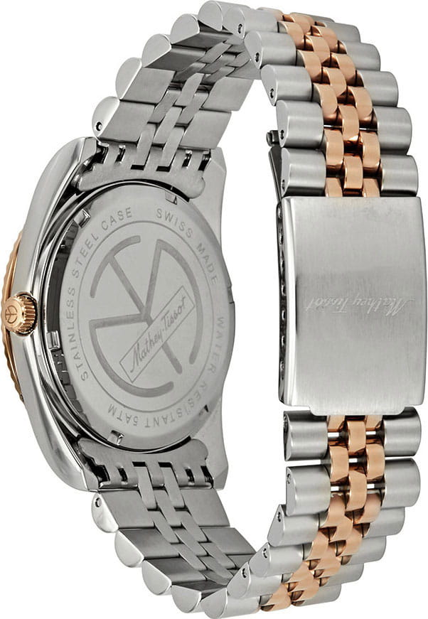 Мужские кварцевые часы Mathey-Tissot Mathy H810RA — это стильное сочетание элегантности и современного дизайна. Изящный корпус выполнен из нержавеющей стали, диаметром 40 мм, что придаст образу элегантности и надежности. Изысканный циферблат с метками в виде штрихов придает модели особый блеск. Циферблат защищен минеральным стекломМинеральное стеклоМинеральное стекло представляет собой искусственно выращенный минерал кварца. Такое стекло отличается особой устойчивостью к повреждениям и царапинам. Уступает по некоторым качествам сапфировому стеклу., обеспечивает устойчивость к царапинам. Стрелки с люминесцентным покрытиемЛюминесцентное покрытиеПозволяет считывать показания времени в темноте. Производители наносят на стрелки, часовые индексы, безель или поверхность циферблата светонакопительный состав, дающий холодное свечение., которое светится в темноте после непродолжительной зарядки на свету. БезельБезельВнешний ободок, закрепляющий стекло. В спортивных часах так называется поворотное кольцо с делениями на циферблате, выполняет роль таймера – замеряет отрезки времени на шкале. Неподвижный безель – элемент декора. Однонаправленно вращающийся безель на дайверских часах позволяет фиксировать моменты погружения и выныривания на поверхность. с PVD-покрытиемPVDУльтратонкое покрытие наносится в технике вакуумного напыления, сочетает в себе нитрид титана особой прочности со слоем золота или оксида хрома. Несёт в себе декоративную или защитную функцию. золотистого цвета. Окошко даты находится в положении 3 часа. Часы оснащены надежным кварцевым механизмом. Стальной браслет с частичным PVD-покрытиемPVDУльтратонкое покрытие наносится в технике вакуумного напыления, сочетает в себе нитрид титана особой прочности со слоем золота или оксида хрома. Несёт в себе декоративную или защитную функцию. на раскладной застёжке с фиксаторомРаскладная застёжкаТакой тип застёжки используется только на браслетах из металла. Она никогда не раскрывается полностью, происходит разделение на 2 и более частей. Раскладывающая застёжка снизит вероятность потери часов к минимуму., гарантирует комфортное и безопасное ношение. Рифленая заводная головка. Класс водозащиты: 50 метров позволит защитить корпус от случайных брызг или капель дождя. Mathey-Tissot  — отличный выбор для тех, кто ценит утонченность и качество.