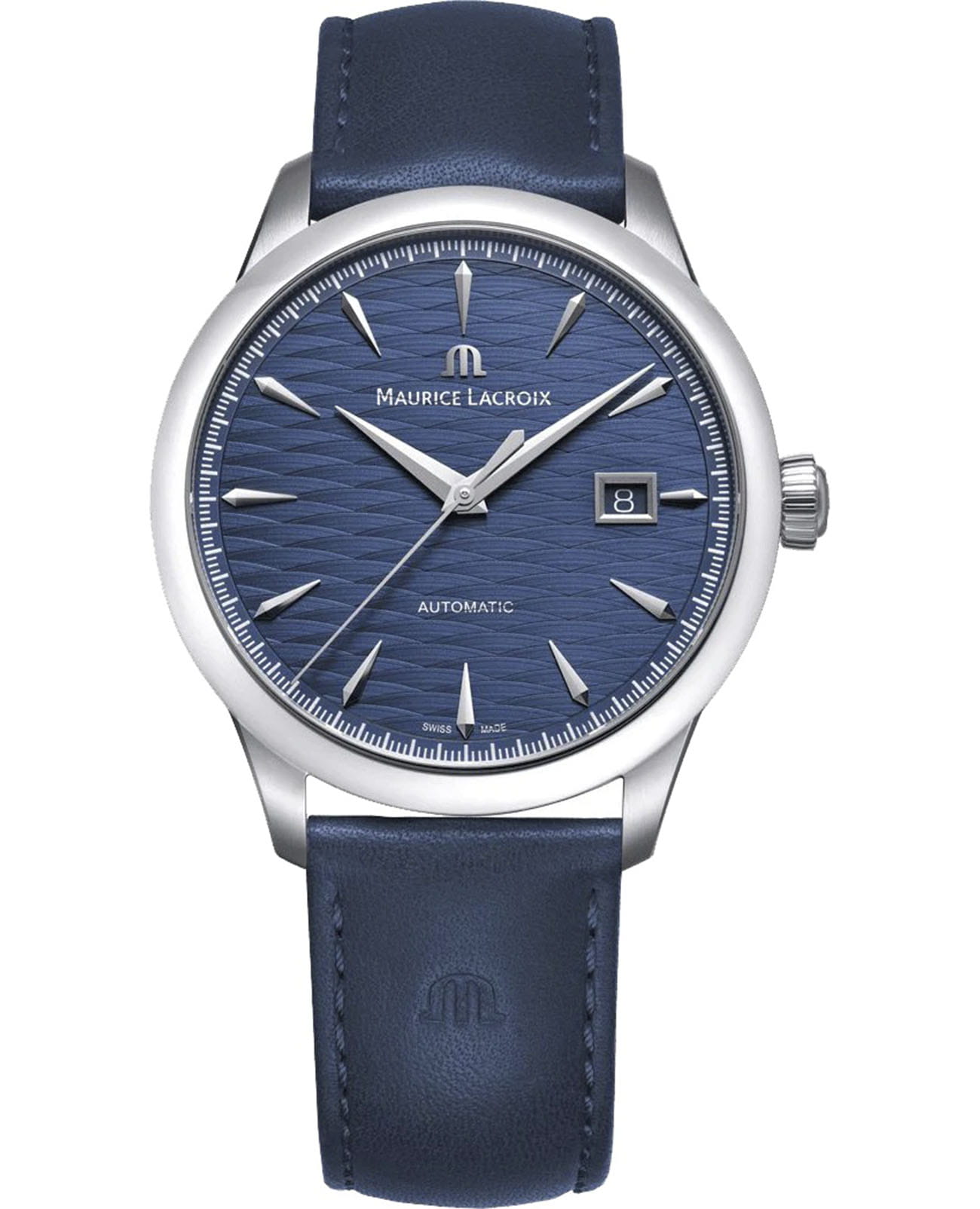 Мужские механические часы Maurice Lacroix 1975 Automatic Vagues Du Jura 756108-SS001-430-4 с автоматическим механизмом — это стильный аксессуар, сочетающий в себе швейцарское качество и функциональность. Модель оснащена калибром ML155, обеспечивающим запас хода до 42 часов, а также функцией «hacking» (остановка секундной стрелки при настройке времени). Корпус выполнен из нержавеющей стали диаметром 40 мм и толщиной 9 мм, что делает его прочным и устойчивым к царапинам. Циферблат синего цвета дополнен индикатором даты, а его поверхность защищена сапфировым стекломСапфировое стеклоПрочный и надёжный материал из кристалла сапфира синтетического происхождения, характеризующийся особой твёрдостью и устойчивостью к царапинам и повреждениям., устойчивым к повреждениям. Задняя крышка прозрачная, позволяя наблюдать за работой механизма. Браслет из натуральной кожи шириной 20 мм оснащён стандартной застёжкой, обеспечивающей комфорт и надёжную фиксацию на запястье. Часы водонепроницаемы до 100 метров (, что позволяет использовать их при плавании и других водных активностях без глубокого погружения. Это лимитированная серия, выпущенная всего 888 экземпляров, что подчёркивает её уникальность. Гарантия 2 года подтверждает качество и долговечность изделия. Эти часы станут универсальным аксессуаром для тех, кто ценит сочетание стиля, функциональности и надёжности — идеальный выбор для повседневной носки и активного образа жизни.
