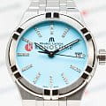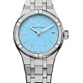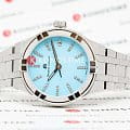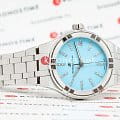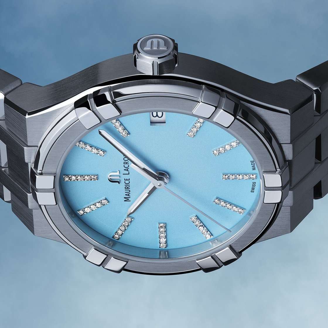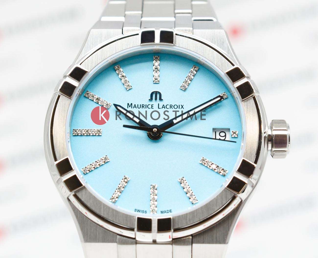 Часы Maurice Lacroix AIKON Quartz Colours Edition (артикул AI1106-SS002-450-1) — элегантная женская модель, сочетающая современный дизайн и швейцарское качество. Корпус диаметром 35 мм выполнен из нержавеющей стали с полированными и сатинированными поверхностями. Светло-голубой циферблат, украшенный 56 бриллиантами, дополнен стрелками и метками с родиевым покрытием и люминесцентным покрытиемЛюминесцентное покрытиеПозволяет считывать показания времени в темноте. Производители наносят на стрелки, часовые индексы, безель или поверхность циферблата светонакопительный состав, дающий холодное свечение.. Циферблат защищён сапфировым стекломСапфировое стеклоПрочный и надёжный материал из кристалла сапфира синтетического происхождения, характеризующийся особой твёрдостью и устойчивостью к царапинам и повреждениям. с двойным антибликовым покрытием.