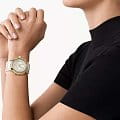 Женские американские часы с минеральным стекломМинеральное стеклоМинеральное стекло представляет собой искусственно выращенный минерал кварца. Такое стекло отличается особой устойчивостью к повреждениям и царапинам. Уступает по некоторым качествам сапфировому стеклу. Michael Kors Sidney MK7221, кварцевый механизм с высокой точностью. Корпус часов изготовлен из нержавеющей стали с PVD-покрытиемPVDУльтратонкое покрытие наносится в технике вакуумного напыления, сочетает в себе нитрид титана особой прочности со слоем золота или оксида хрома. Несёт в себе декоративную или защитную функцию.. БезельБезельВнешний ободок, закрепляющий стекло. В спортивных часах так называется поворотное кольцо с делениями на циферблате, выполняет роль таймера – замеряет отрезки времени на шкале. Неподвижный безель – элемент декора. Однонаправленно вращающийся безель на дайверских часах позволяет фиксировать моменты погружения и выныривания на поверхность. украшен кристаллами. 12-ти и 24-х часовой формат времени, число и день недели отображаются на отдельных циферблатах. Циферблат с узнаваемым принтом бренда и метками в виде штрихов. Стрелки с люминесцентным покрытиемЛюминесцентное покрытиеПозволяет считывать показания времени в темноте. Производители наносят на стрелки, часовые индексы, безель или поверхность циферблата светонакопительный состав, дающий холодное свечение.. Рифленая заводная головка. Класс водозащиты: 50 метров, позволит защитить корпус от случайных брызг или капель дождя. Ремешок из экокожи на стандартной застежке.