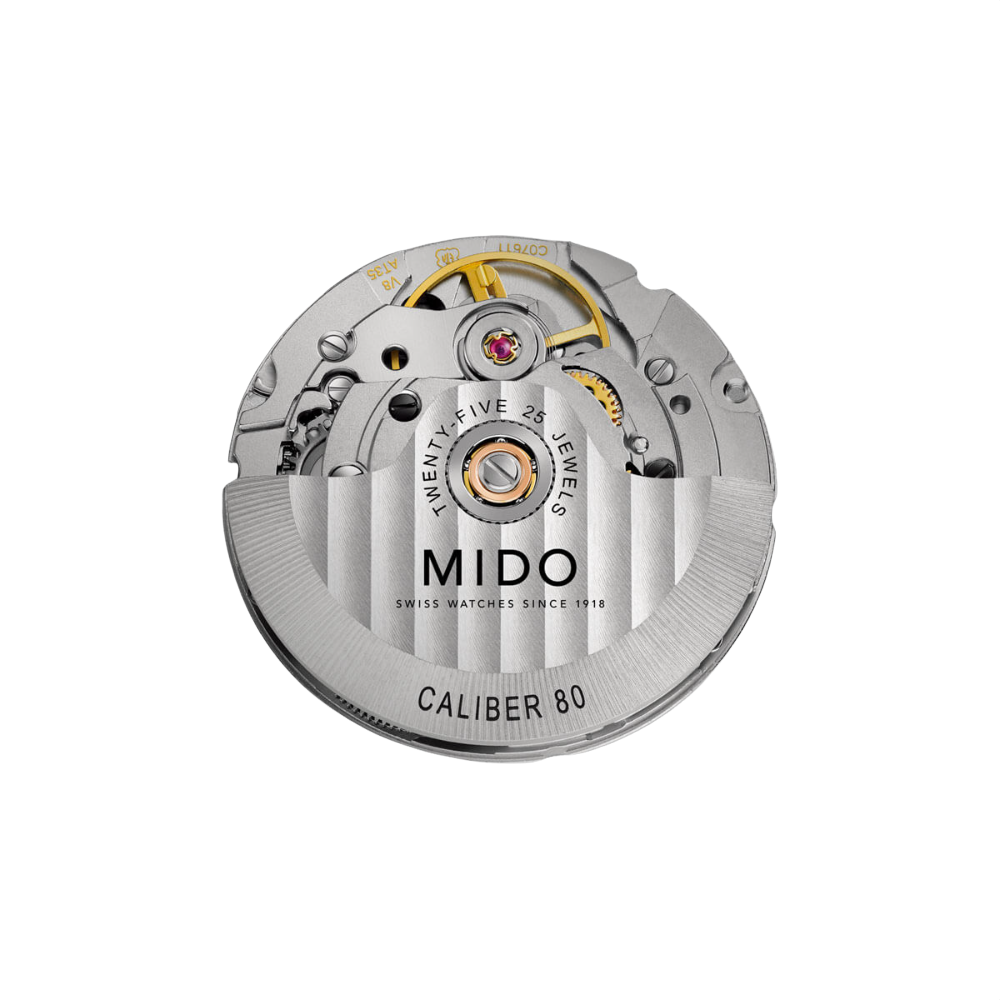 Часы оснащены швейцарским автоматическим механизмом Mido Caliber 80 с технологией Powermatic 80Powermatic 80Эксклюзивный калибр от швейцарской компании ETA с увеличенным запасом хода до 80 часов за счёт удлинённой заводной пружины. Характеризуется улучшенной системой спуска со сниженным трением., обеспечивающей запас хода до 80 часов. Функциональность дополняется отображением даты на позиции «6 часов».