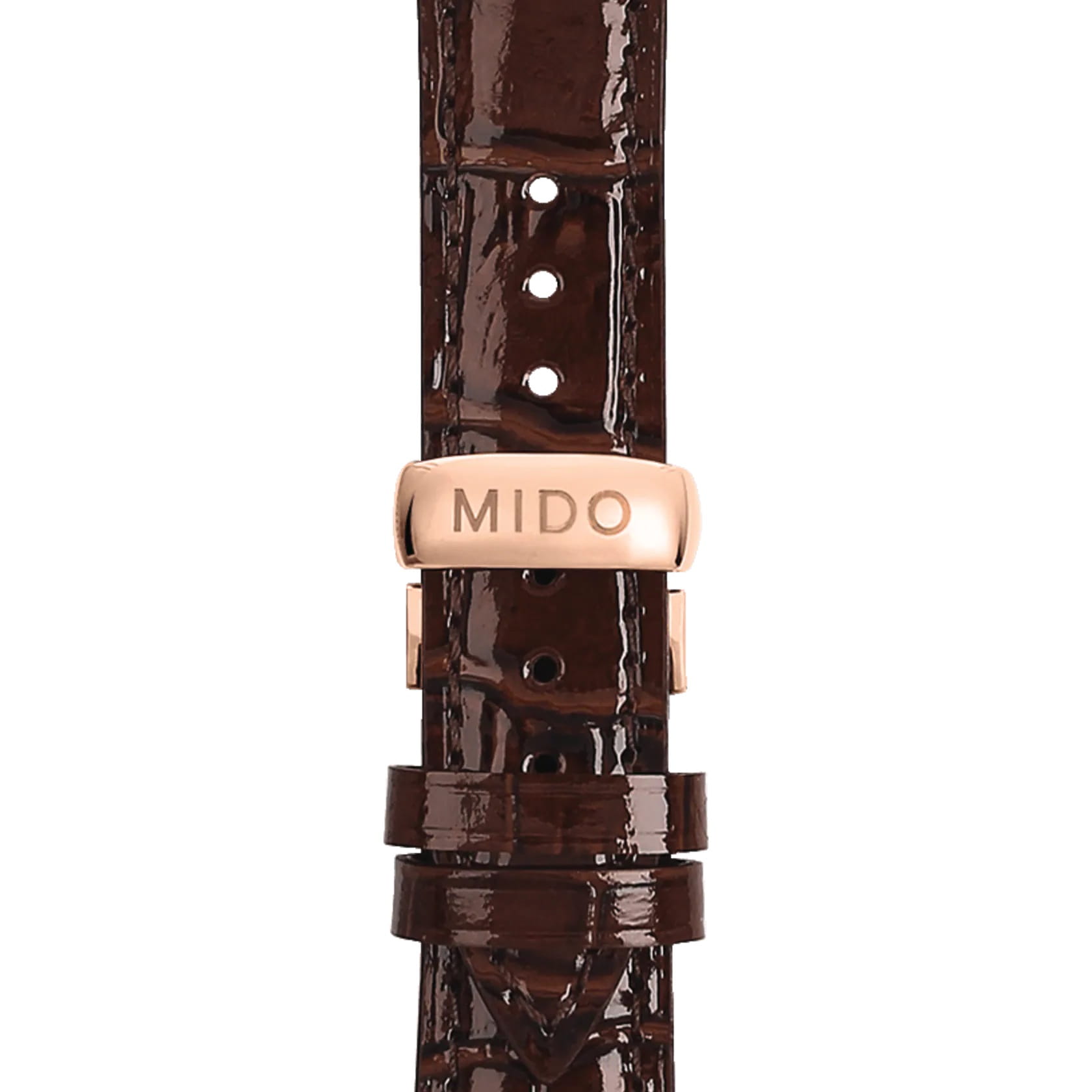 Mido Baroncelli Diamonds M007.207.36.291.00 – элегантные женские часы, сочетающие классический стиль и современные технологии. Корпус диаметром 33 мм и толщиной 9,4 мм выполнен из нержавеющей стали с PVD-покрытиемPVDУльтратонкое покрытие наносится в технике вакуумного напыления, сочетает в себе нитрид титана особой прочности со слоем золота или оксида хрома. Несёт в себе декоративную или защитную функцию. розового золота, обеспечивая прочность и стильный внешний вид. Бежево-коричневый циферблат украшен бриллиантами, окружающими окошко даты на позиции «6 часов», добавляя изысканности и блеска, а его поверхность защищена сапфировым стекломСапфировое стеклоПрочный и надёжный материал из кристалла сапфира синтетического происхождения, характеризующийся особой твёрдостью и устойчивостью к царапинам и повреждениям. с антибликовым покрытиемАнтибликовое покрытиеСлой оксида металла в 0,13-0,3 микрон, благодаря которому стекло часов не бликует и не отражает свет. Антибликовое покрытие уменьшает отражение света в 10 раз, обеспечивая отличную читаемость показателей циферблата., устойчивым к царапинам.
