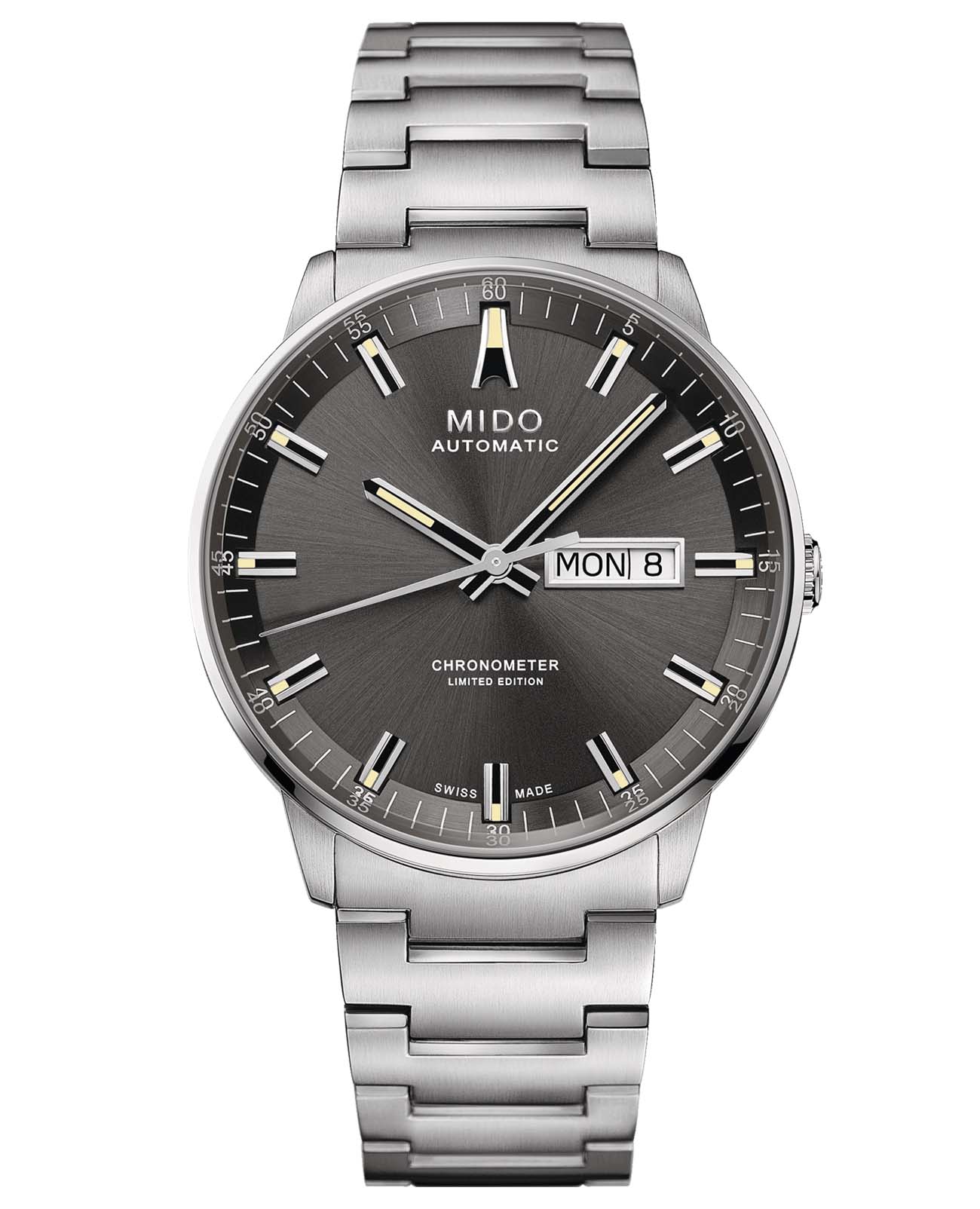 Эти швейцарские часы Commander являются современным прочтением культовой модели: современное написание логотипа MIDO и градуированный циферблат, закрытый сапфировым стекломСапфировое стеклоПрочный и надёжный материал из кристалла сапфира синтетического происхождения, характеризующийся особой твёрдостью и устойчивостью к царапинам и повреждениям. со скошенной кромкой. Его автоматический механизм сертифицирован COSCСертификат COSCОфициальный сертификат, подтверждающий то, что часы ходят с особо высокой точностью. Для получения документа часы подвергаются тестовым испытаниям, разработанным швейцарским институтом тестирования хронометров COSC. Допустимая норма для механических часов -4/+6 секунд в день, для кварцевых моделей +/- 0,07 секунд в день. как хронометр и обеспечивает запас хода до 80 часов. Лимитированная серия - 1889 экземпляра.
