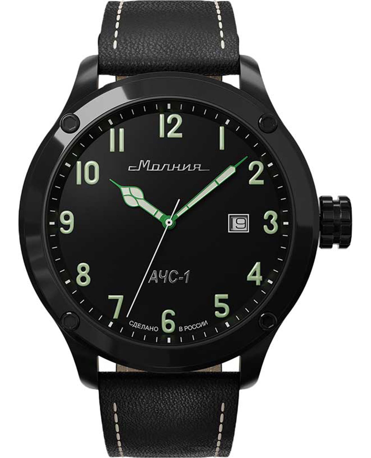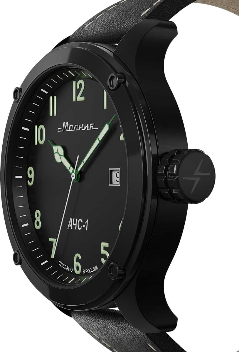 Мужские механические часы с автоподзаводом — это надёжный аксессуар от легендарного бренда «МОЛНИЯ», созданного на Челябинском часовом заводе. Корпус диаметром 44 мм выполнен из нержавеющей стали с IP-покрытиемIP-покрытиеМетод ионного напыления. Демонстрирует повышенную устойчивость к истиранию, окислению и химическим веществам. Под воздействием высокого давления и температуры около 1500°C молекулы металла надёжно соединяются с частицами корпуса часов.. Циферблат чёрного цвета оформлен стрелками и индексами со светонакопительным составом Super-LumiNova. Окошко даты расположено в положении 3 часов. Циферблат защищён сапфировым стекломСапфировое стеклоПрочный и надёжный материал из кристалла сапфира синтетического происхождения, характеризующийся особой твёрдостью и устойчивостью к царапинам и повреждениям.. Механизм — японский автоматический калибр Miyota 8215. Часы оснащены кожаным ремешком чёрного цвета с классической пряжкой. Водонепроницаемость 100 м позволяет использовать часы для плавания и повседневного ношения. Идеальный выбор для тех, кто ценит российское качество и мужественный дизайн.