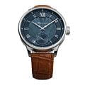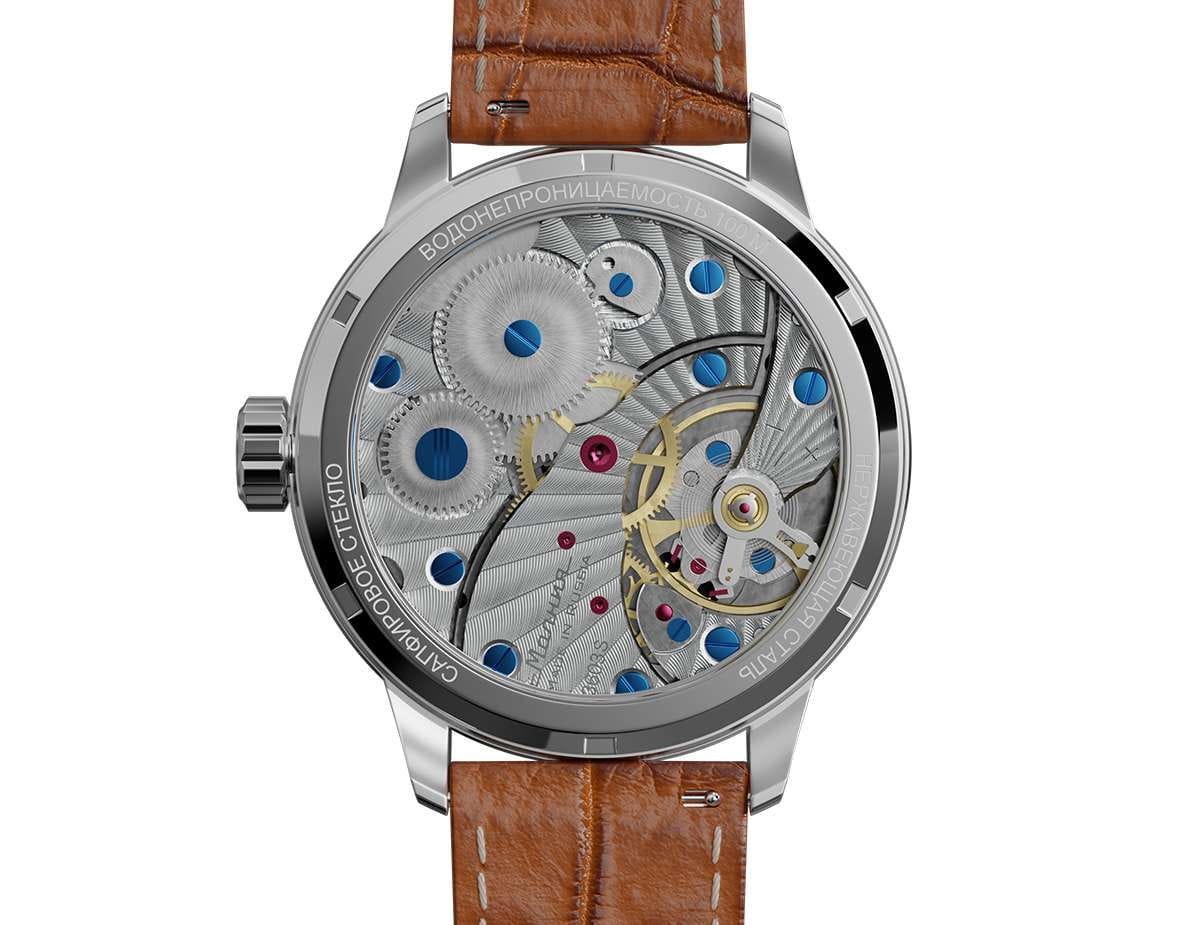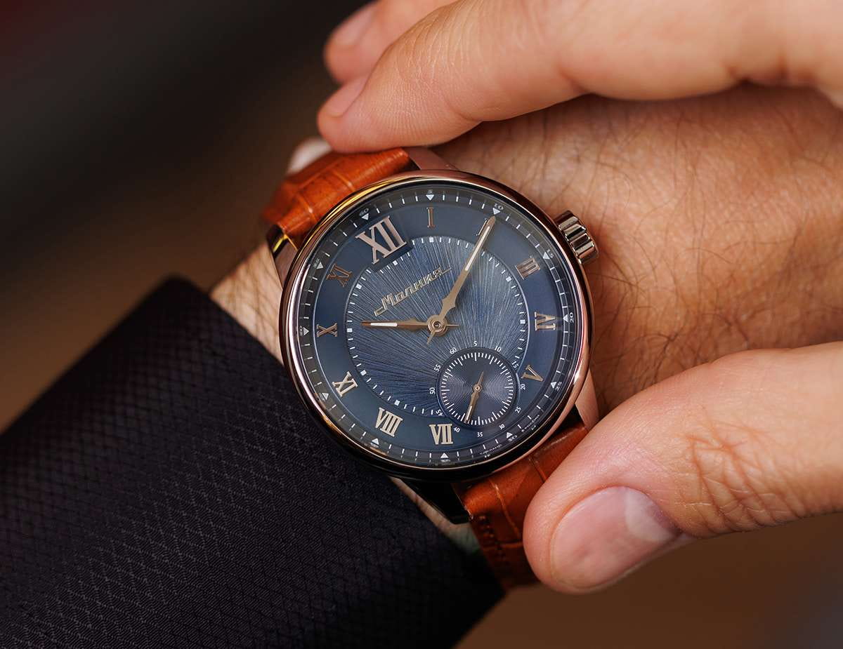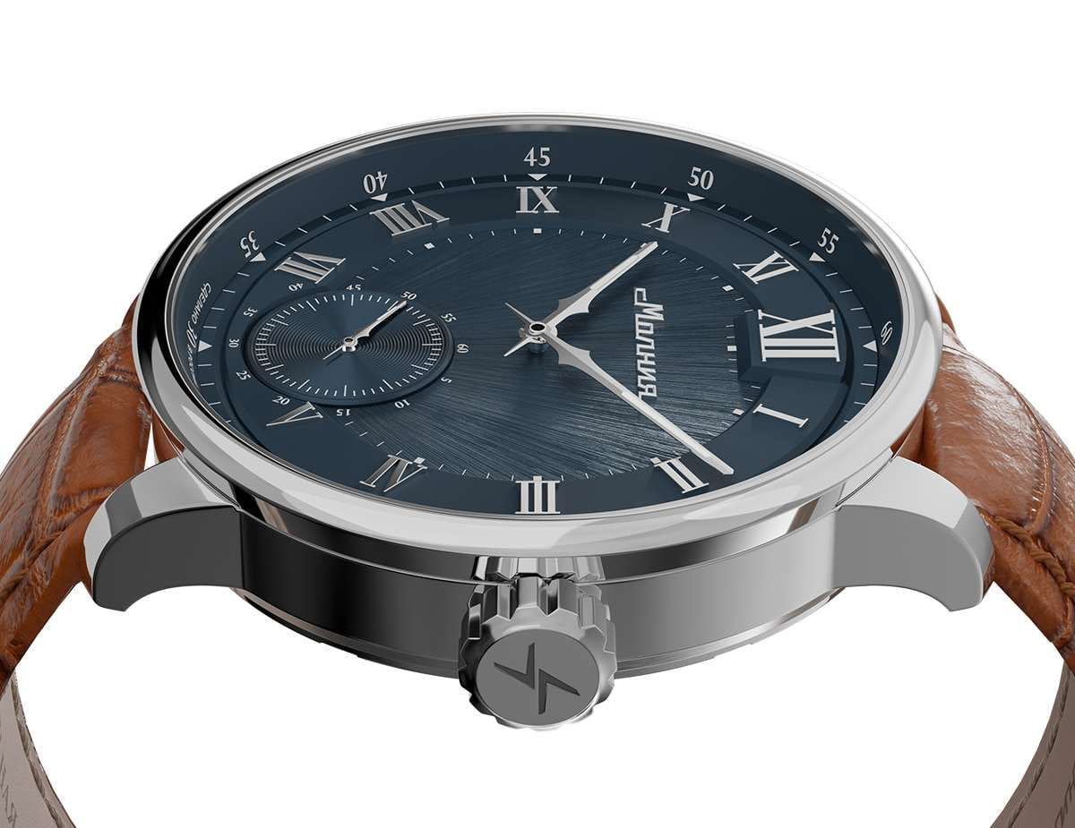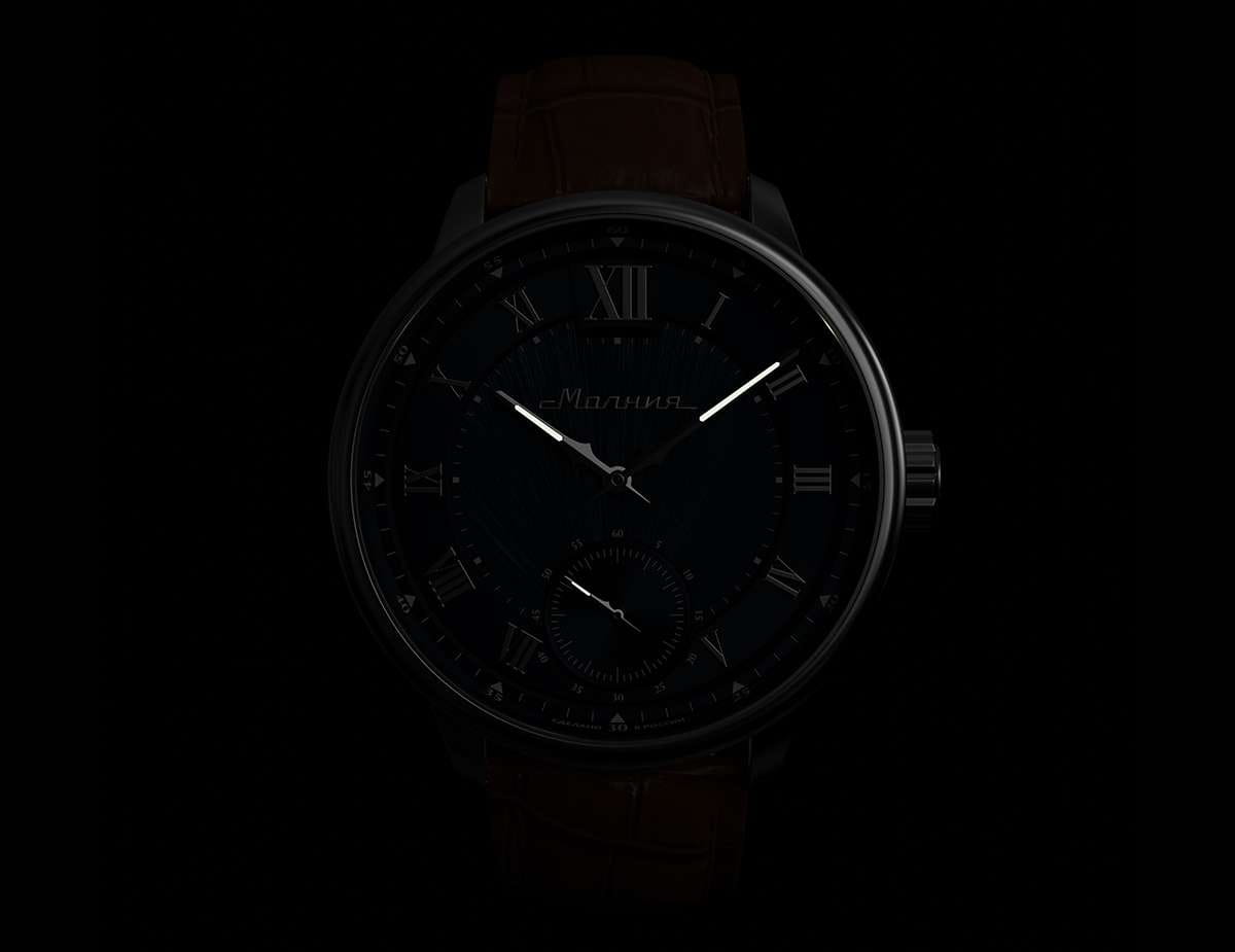 Мужские механические часы с ручным подзаводом — это аксессуар от легендарного бренда «МОЛНИЯ», созданный на Челябинском часовом заводе. Корпус диаметром 41 мм и толщиной 12 мм выполнен из нержавеющей стали 316L с зеркальной полировкой. БезельБезельВнешний ободок, закрепляющий стекло. В спортивных часах так называется поворотное кольцо с делениями на циферблате, выполняет роль таймера – замеряет отрезки времени на шкале. Неподвижный безель – элемент декора. Однонаправленно вращающийся безель на дайверских часах позволяет фиксировать моменты погружения и выныривания на поверхность. также выполнен из стали с зеркальной отделкой. Циферблат синего цвета оформлен римскими цифрами и стальными индексами. Малая секундная стрелка вынесена на позицию 6 часов. Циферблат защищён сапфировым стекломСапфировое стеклоПрочный и надёжный материал из кристалла сапфира синтетического происхождения, характеризующийся особой твёрдостью и устойчивостью к царапинам и повреждениям. толщиной 2,5 мм. Механизм — мануфактурный калибр 3603, собранный вручную, с запасом хода до 40 часов. Прозрачная задняя крышка позволяет наблюдать за работой механизма. Часы оснащены светло-коричневым кожаным ремешком шириной 20 мм с раскладной застёжкойРаскладная застёжкаТакой тип застёжки используется только на браслетах из металла. Она никогда не раскрывается полностью, происходит разделение на 2 и более частей. Раскладывающая застёжка снизит вероятность потери часов к минимуму. и системой быстрой замены. Водонепроницаемость 100 м позволяет использовать часы для плавания и повседневного ношения. Идеальный выбор для тех, кто ценит российское качество и традиции.