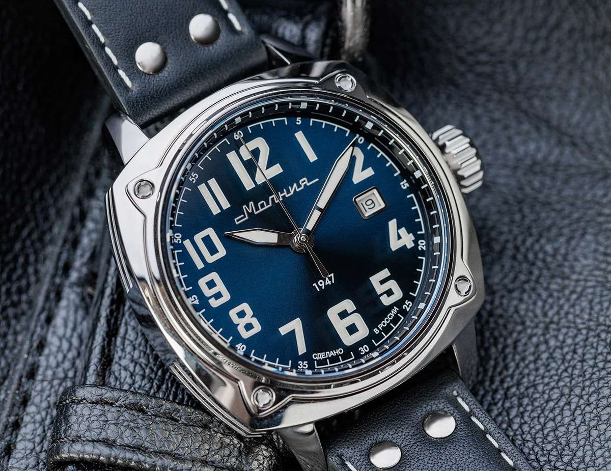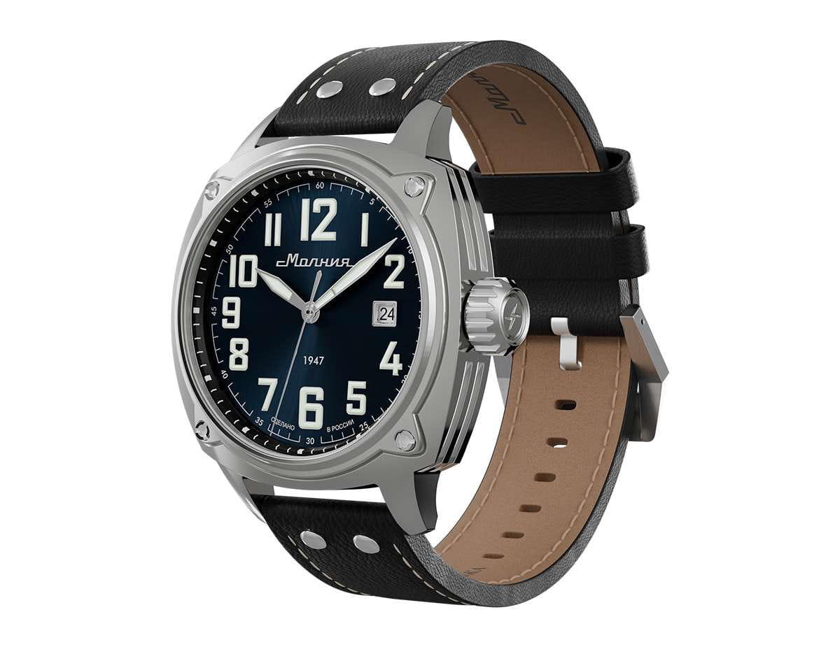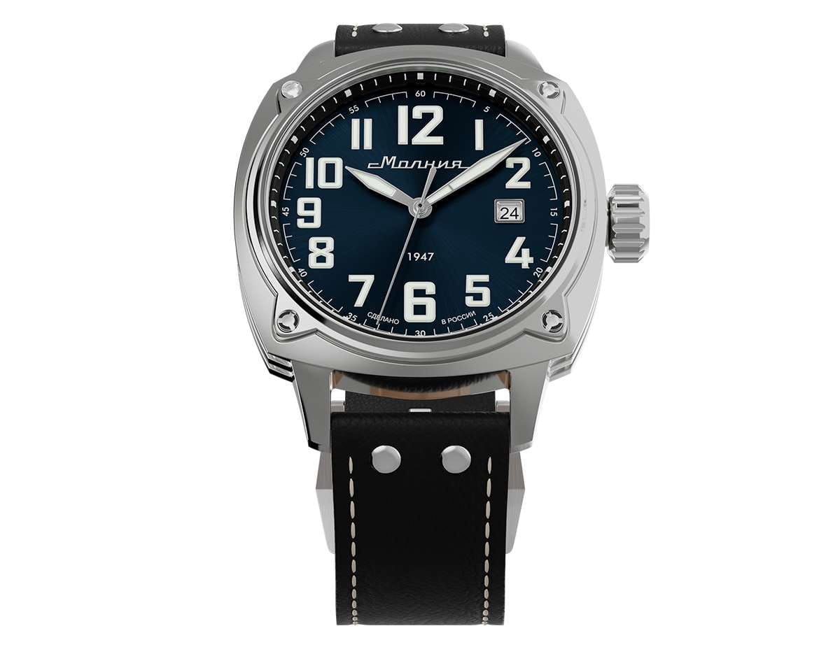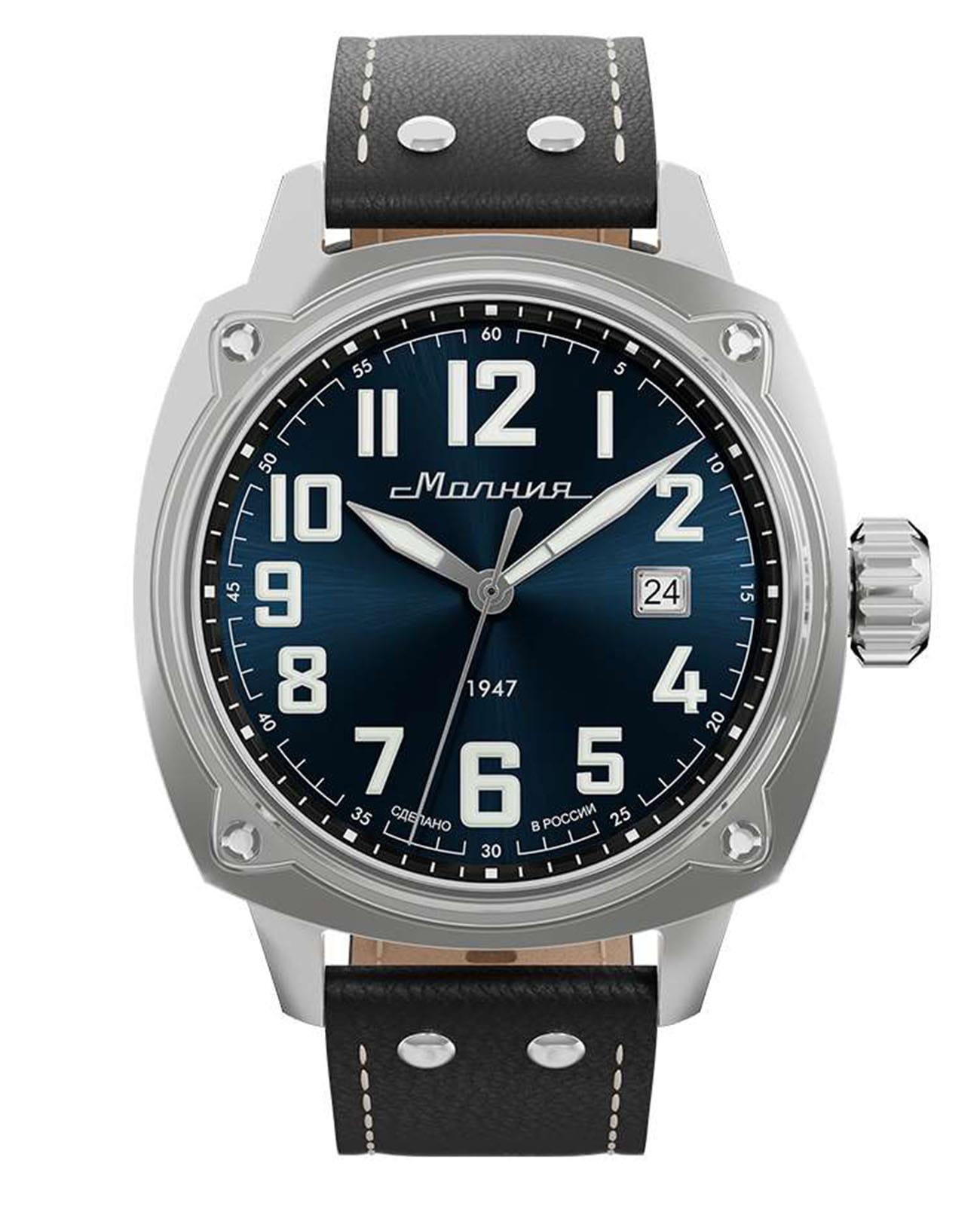 Мужские механические часы с автоподзаводом — это надёжный аксессуар от легендарного бренда «МОЛНИЯ», созданный на Челябинском часовом заводе. Корпус диаметром 42 мм выполнен из нержавеющей стали 316L с зеркальной полировкой. БезельБезельВнешний ободок, закрепляющий стекло. В спортивных часах так называется поворотное кольцо с делениями на циферблате, выполняет роль таймера – замеряет отрезки времени на шкале. Неподвижный безель – элемент декора. Однонаправленно вращающийся безель на дайверских часах позволяет фиксировать моменты погружения и выныривания на поверхность. также выполнен из стали с зеркальной отделкой. Циферблат синего цвета оформлен индексами и стрелками. Окошко даты расположено в положении 3 часов. Стрелки и метки с люминесцентным покрытиемЛюминесцентное покрытиеПозволяет считывать показания времени в темноте. Производители наносят на стрелки, часовые индексы, безель или поверхность циферблата светонакопительный состав, дающий холодное свечение. Super-LumiNova, обеспечивающим хорошую читаемость в темноте. Циферблат защищён сапфировым стекломСапфировое стеклоПрочный и надёжный материал из кристалла сапфира синтетического происхождения, характеризующийся особой твёрдостью и устойчивостью к царапинам и повреждениям. с антибликовым покрытиемАнтибликовое покрытиеСлой оксида металла в 0,13-0,3 микрон, благодаря которому стекло часов не бликует и не отражает свет. Антибликовое покрытие уменьшает отражение света в 10 раз, обеспечивая отличную читаемость показателей циферблата.. Механизм — японский автоматический калибр Miyota 8215 с функцией и запасом хода до 42 часов. Прозрачная задняя крышка позволяет наблюдать за работой механизма. Часы оснащены кожаным ремешком чёрного цвета с белой отстрочкой и классической пряжкой. Водонепроницаемость 100 м позволяет использовать часы для плавания и повседневного ношения. Идеальный выбор для тех, кто ценит качество, точность и стиль.