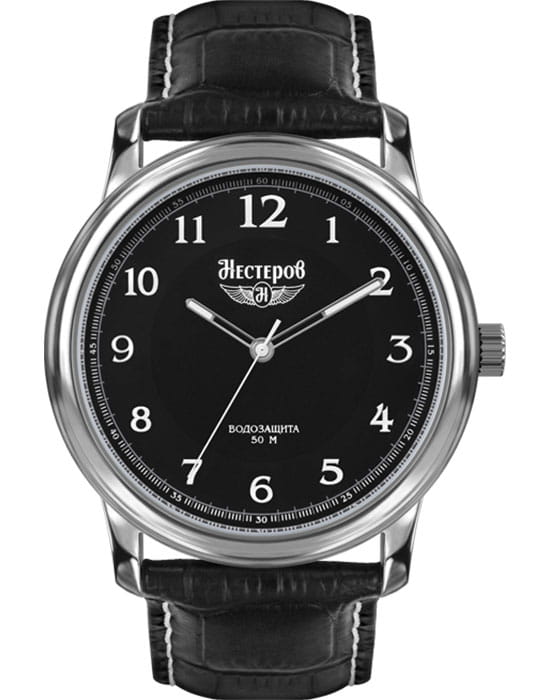 Модель Нестеров H0282B02-01E — это гармоничное сочетание классического дизайна и надёжности, вдохновлённое авиационной тематикой.  Корпус диаметром 44 мм выполнен из нержавеющей стали, подчёркивая прочность и элегантность конструкции.  Чёрный циферблат с арабскими цифрами и стрелками, покрытыми люминесцентным покрытиемЛюминесцентное покрытиеПозволяет считывать показания времени в темноте. Производители наносят на стрелки, часовые индексы, безель или поверхность циферблата светонакопительный состав, дающий холодное свечение., обеспечивает отличную читаемость в любых условиях.