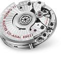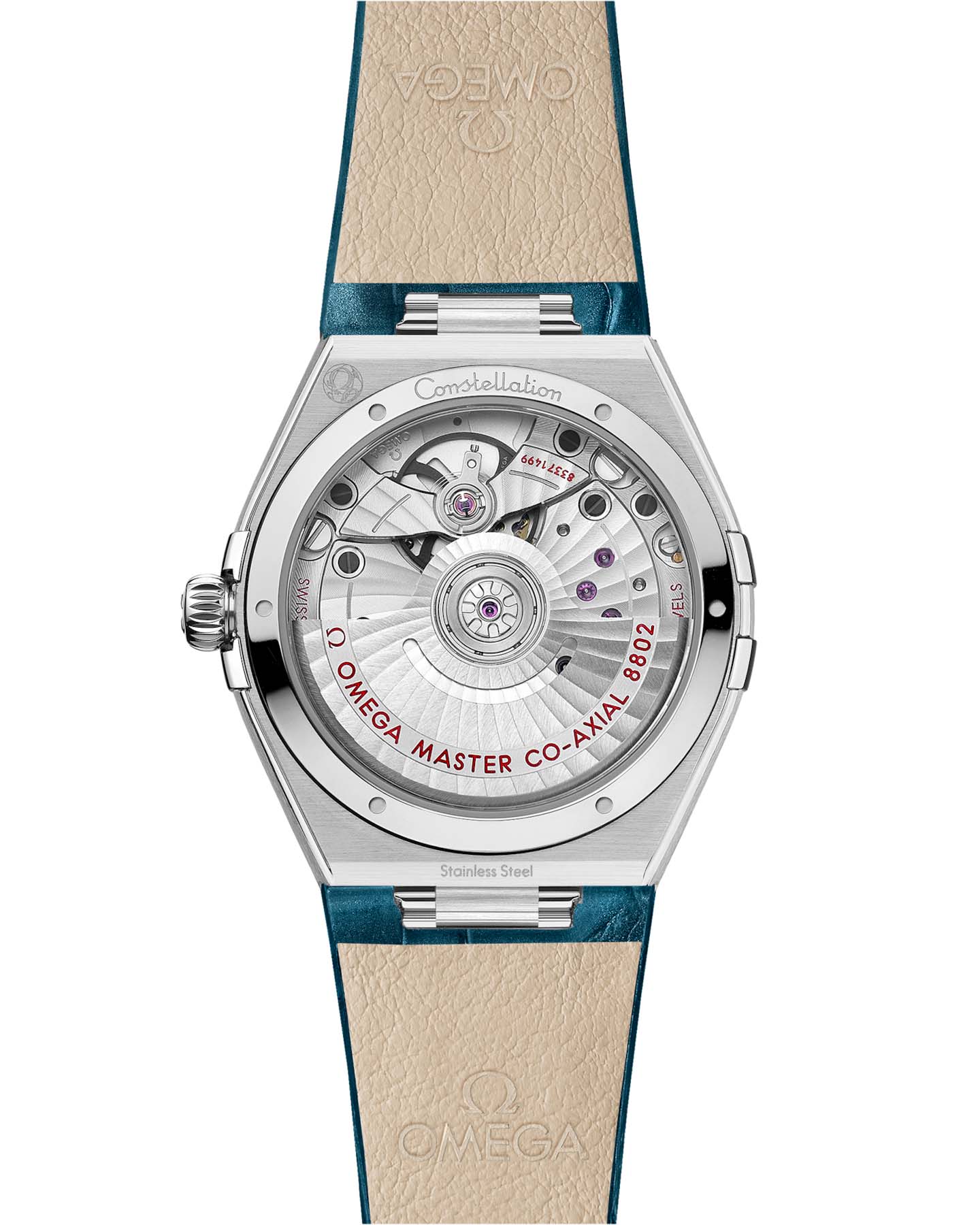 . Часы, представленные на ремешке павлиньего цвета, приводятся в движение коаксиальным хронометром OMEGA 8802, который виден через куполообразное сапфировое стеклоСапфировое стеклоПрочный и надёжный материал из кристалла сапфира синтетического происхождения, характеризующийся особой твёрдостью и устойчивостью к царапинам и повреждениям., устойчивое к царапинам.