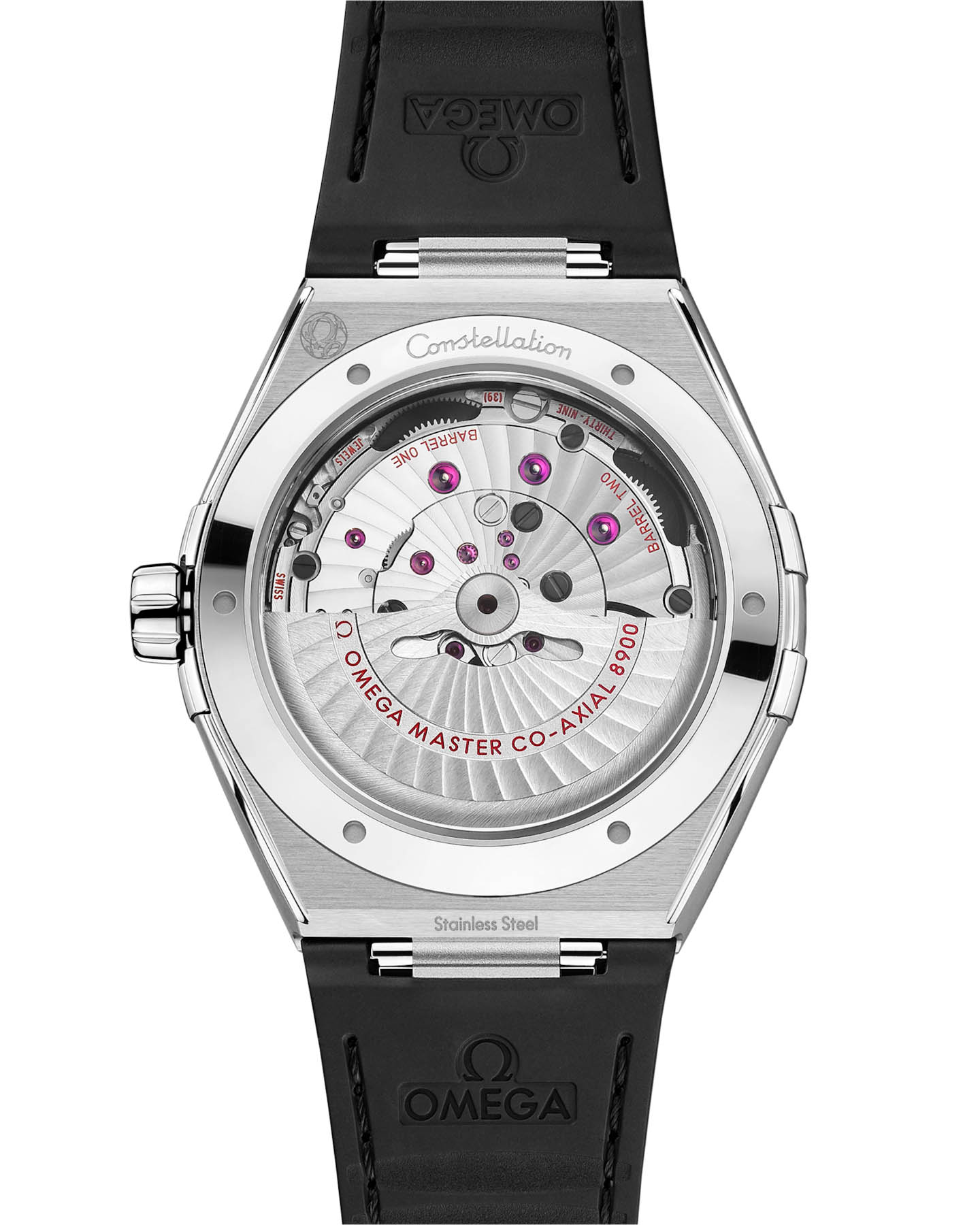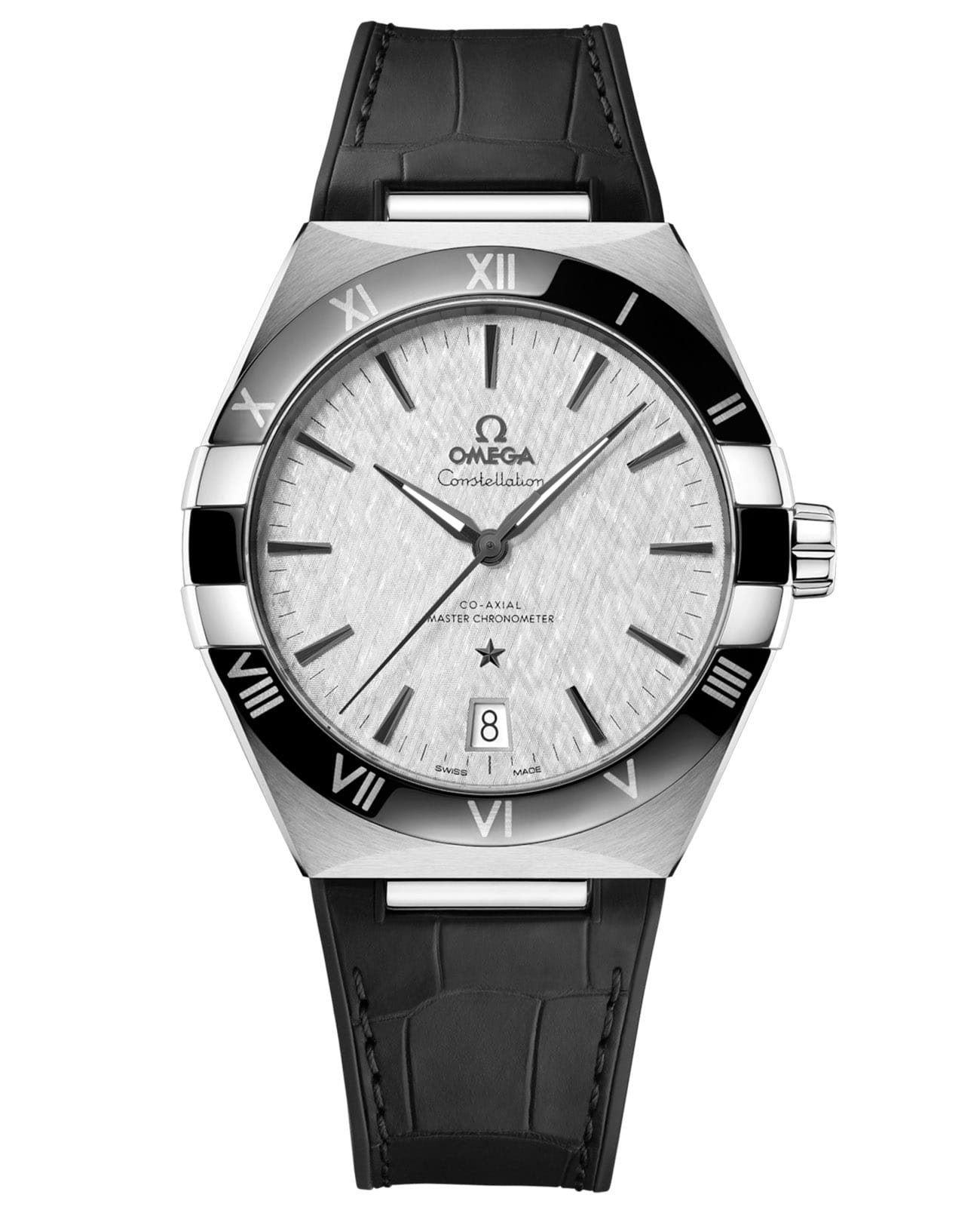 Драматичный и неизменный дизайн OMEGA Constellation характеризуется знаменитыми полумесяцами, а также «скобами» на боковой стороне корпуса. Модель из нержавеющей стали диаметром 41 мм оснащена полированным безелемБезельВнешний ободок, закрепляющий стекло. В спортивных часах так называется поворотное кольцо с делениями на циферблате, выполняет роль таймера – замеряет отрезки времени на шкале. Неподвижный безель – элемент декора. Однонаправленно вращающийся безель на дайверских часах позволяет фиксировать моменты погружения и выныривания на поверхность. из черной керамики с римскими цифрами из Liquidmetal™, циферблатом из серого родиевого сплава с шелковым тиснением и окошком даты в положении «6 часов». Стрелки, логотип OMEGA, звезда Constellation и граненые индексы окрашены в черный цвет. Часы представлены на черном кожаном ремешке с каучуковой подкладкой и оснащены коаксиальным хронометром OMEGA Master Chronometer Calibre 8900, который виден через куполообразное сапфировое стеклоСапфировое стеклоПрочный и надёжный материал из кристалла сапфира синтетического происхождения, характеризующийся особой твёрдостью и устойчивостью к царапинам и повреждениям., устойчивое к царапинам.