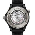 Часы Seamaster Professional Diver 300M, появившиеся на свет в 1993 году, привлекли внимание огромного количества ценителей часового искусства. Нынешняя коллекция вобрала в себя знаменитое океанское наследие, привнеся в него лучшие инновации и дизайнерские решения OMEGA. Эта модель диаметром 43,5 мм в корпусе из черной керамики и титана Grade 5 имеет черный керамический безельБезельВнешний ободок, закрепляющий стекло. В спортивных часах так называется поворотное кольцо с делениями на циферблате, выполняет роль таймера – замеряет отрезки времени на шкале. Неподвижный безель – элемент декора. Однонаправленно вращающийся безель на дайверских часах позволяет фиксировать моменты погружения и выныривания на поверхность. с дайверской шкалой из белой эмали. На циферблате из матовой черной керамики [ZrO2] лазером выгравирован волнообразный узор. Скелетонизированные стрелки и выпуклые индексы с титановым PVD-покрытиемPVDУльтратонкое покрытие наносится в технике вакуумного напыления, сочетает в себе нитрид титана особой прочности со слоем золота или оксида хрома. Несёт в себе декоративную или защитную функцию. имеют углубления, заполненные белым люминесцентным составомЛюминесцентное покрытиеПозволяет считывать показания времени в темноте. Производители наносят на стрелки, часовые индексы, безель или поверхность циферблата светонакопительный состав, дающий холодное свечение. Super-LumiNova, а гелиевому клапану придана коническая форма. Часы дополнены интегрированным черным каучуковым ремешком с застежкой из черной керамики [ZrO2] с полированными и матовыми поверхностями и оснащены калибром OMEGA Master Chronometer 8806, который виден сквозь сапфировое стеклоСапфировое стеклоПрочный и надёжный материал из кристалла сапфира синтетического происхождения, характеризующийся особой твёрдостью и устойчивостью к царапинам и повреждениям. задней крышки с волнистым краем.