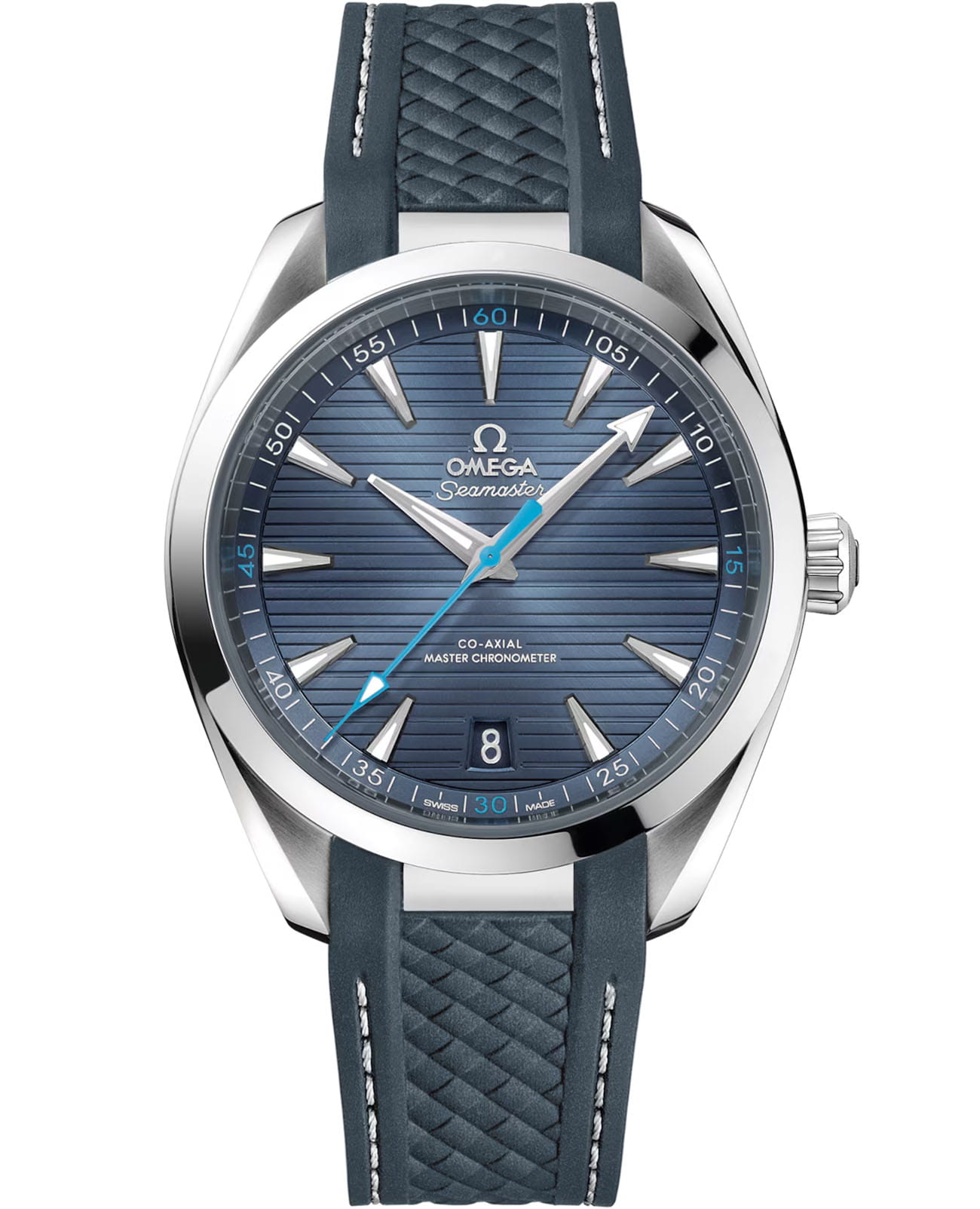 Omega Seamaster Aqua Terra выполнены в симметричном корпусе из нержавеющей стали с завинчивающейся задней крышкой, украшенной волновым узором. Циферблат дополнен окошком даты на 6 часах и оформлен в виде горизонтального рисунка, вдохновлённого текстурой тикового дерева палуб яхт. Стрелки и метки оснащены люминесцентным покрытиемЛюминесцентное покрытиеПозволяет считывать показания времени в темноте. Производители наносят на стрелки, часовые индексы, безель или поверхность циферблата светонакопительный состав, дающий холодное свечение. Super-LumiNova для лучшей читаемости в темноте. Калибр Omega 8900 сертифицирован как Master Chronometer — гарантия высочайшей точности и устойчивости к магнитным полям. Запас хода составляет 60 часов. Защиту циферблата обеспечивает сапфировое стеклоСапфировое стеклоПрочный и надёжный материал из кристалла сапфира синтетического происхождения, характеризующийся особой твёрдостью и устойчивостью к царапинам и повреждениям. с антибликовым покрытиемАнтибликовое покрытиеСлой оксида металла в 0,13-0,3 микрон, благодаря которому стекло часов не бликует и не отражает свет. Антибликовое покрытие уменьшает отражение света в 10 раз, обеспечивая отличную читаемость показателей циферблата.. Водозащита позволяет использовать часы в воде без риска повреждения. Часы установлены на структурированный резиновый ремешок с дополнительным стальным звеном для интеграции с корпусом. Вес модели — около 107 грамм. Это сочетание премиального качества, технологичности и классического дизайна.
