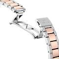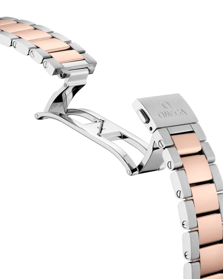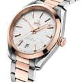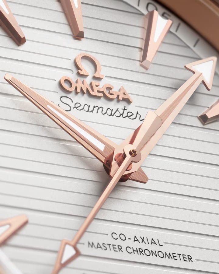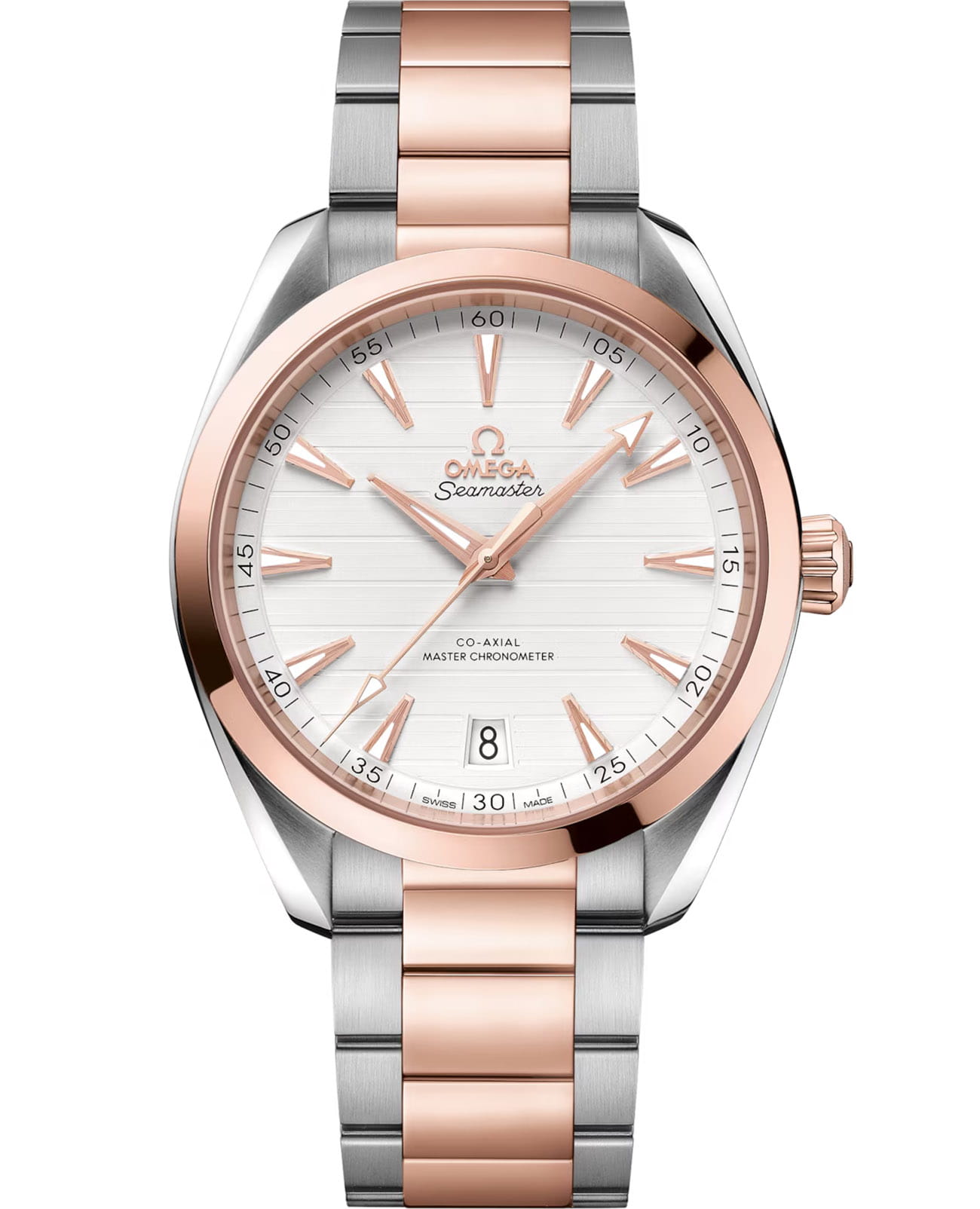 Omega Seamaster Aqua Terra выполнены в симметричном корпусе из нержавеющей стали и золота 18K Moonshine™ с завинчивающейся задней крышкой, декоративным волнистым узором. Циферблат дополнил окошком даты на 6 часов и логотипом OMEGA в центре. Стрелки и метки оснащены Super-LumiNova для лучшей читаемости в темноте. Механизм Калибр Omega 8900 сертифицирован как Master Chronometer — гарантия высочайшей точности и устойчивости к магнитным полям. Запас хода составляет 60 часов. Защита циферблата обеспечивается сапфировое стеклоСапфировое стеклоПрочный и надёжный материал из кристалла сапфира синтетического происхождения, характеризующийся особой твёрдостью и устойчивостью к царапинам и повреждениям. с антибликовым покрытиемАнтибликовое покрытиеСлой оксида металла в 0,13-0,3 микрон, благодаря которому стекло часов не бликует и не отражает свет. Антибликовое покрытие уменьшает отражение света в 10 раз, обеспечивая отличную читаемость показателей циферблата.. Водозащита Позволяет использовать часы в воде без повреждений. Часы установлены на интегрированном браслете с полированными и матовыми звеньями. Это сочетание премиального качества, технологичности и классического дизайна.