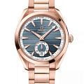 Мужские наручные часы Omega Seamaster Aqua Terra выполнены в корпусе из 18K Sedna™ золота , диаметром 41 мм , толщиной 13,2 мм , ширина между ушками — 20 мм , общий вес составляет около 229 граммов. Циферблат с горизонтальным узором «тиковое дерево» имеет окошко даты в положении 6 часов и дополнительный циферблат малой секундной стрелки с черным кольцом. Стрелки и индексы выполнены из 18К Sedna™ золота и покрыты белым люминесцентным составом Super-LumiNovaЛюминесцентное покрытиеПозволяет считывать показания времени в темноте. Производители наносят на стрелки, часовые индексы, безель или поверхность циферблата светонакопительный состав, дающий холодное свечение., обеспечивающим читаемость в темноте. Минутная шкала и малый циферблат дополнительно обработаны пескоструйным методом для повышения контраста. Стекло — выпуклое сапфировое стекло сапфировое стеклоСапфировое стеклоПрочный и надёжный материал из кристалла сапфира синтетического происхождения, характеризующийся особой твёрдостью и устойчивостью к царапинам и повреждениям. с двусторонним антибликовым покрытием антибликовое покрытиеАнтибликовое покрытиеСлой оксида металла в 0,13-0,3 микрон, благодаря которому стекло часов не бликует и не отражает свет. Антибликовое покрытие уменьшает отражение света в 10 раз, обеспечивая отличную читаемость показателей циферблата., задняя крышка прозрачная, украшена волнообразным узором. Механизм — механический с автоподзаводом , калибр OMEGA Master Chronometer 8917 , сертифицированный METAS и COSC. Обладает запасом хода до 60 часов , антимагнитными свойствами и точностью от 0 до +5 секунд в сутки благодаря коаксиальному спуску и балансу из кремния. Мосты и платина механизма имеют родиевое покрытие и декор Женевские волны. Водозащита — 15 АТМ (150 метров) , что позволяет использовать часы в воде, включая плавание. Часы оснащены золотым браслетом с полированной и матовой отделкой звеньев, застёжка — раскладная, с функцией быстрого регулирования. Это технологичная модель для делового и активного образа жизни, сочетающая морское наследие, швейцарское качество и современные стандарты исполнения.