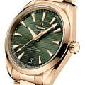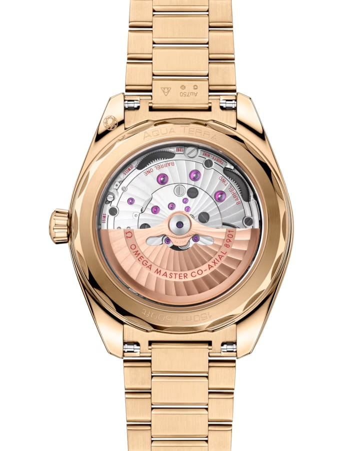 Omega Seamaster Aqua Terra выполнены в симметричном корпусе из 18-каратного золота Sedna™ с завинчивающейся задней крышкой, украшенным волнистым узором. Циферблат дополнен окошком даты на 6 часов, вдохновлён текстурой тикового дерева на палубе яхты. Стрелки и метки оснащены Super-LumiNova для лучшей читаемости в темноте. Механизм Калибр Omega 8901 сертифицирован как Master Chronometer — гарантия высочайшей точности и устойчивости к магнитным полям. Запас хода составляет 60 часов. Защита циферблата обеспечивается сапфировое стеклоСапфировое стеклоПрочный и надёжный материал из кристалла сапфира синтетического происхождения, характеризующийся особой твёрдостью и устойчивостью к царапинам и повреждениям. с антибликовым покрытиемАнтибликовое покрытиеСлой оксида металла в 0,13-0,3 микрон, благодаря которому стекло часов не бликует и не отражает свет. Антибликовое покрытие уменьшает отражение света в 10 раз, обеспечивая отличную читаемость показателей циферблата.. Водозащита Позволяет использовать водные часы без повреждений. Часы установлены на браслете из 18-каратного золота с . Это сочетание премиального качества, технологичности и классического дизайна.