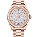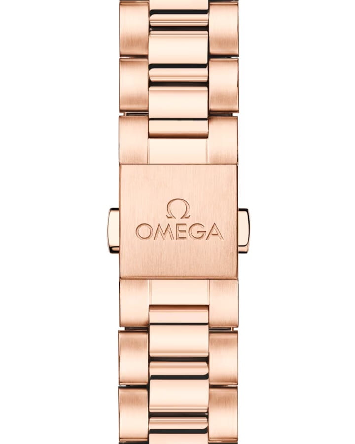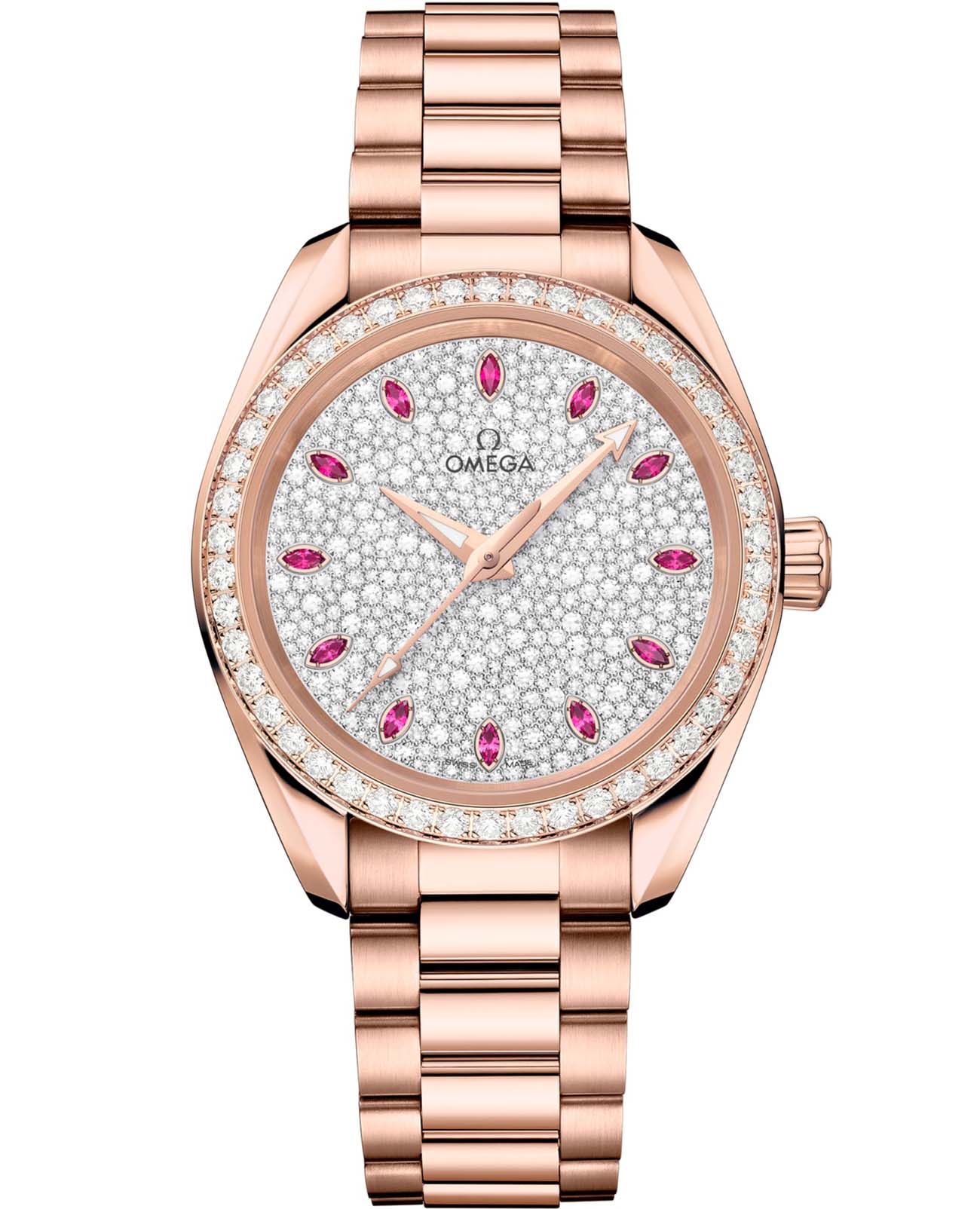 Часы Omega Seamaster Aqua Terra выполнены в симметричном корпусе из полированного 18K Sedna™ золота с завинчивающейся задней крышкой, украшенной волновым узором. Безель инкрустирован бриллиантами, что добавляет модели роскошный акцент. Циферблат нежно-розового цвета дополнен 12 часовыми метками из рубина и стрелками из 18K Sedna™ золота, оснащёнными люминесцентным покрытиемЛюминесцентное покрытиеПозволяет считывать показания времени в темноте. Производители наносят на стрелки, часовые индексы, безель или поверхность циферблата светонакопительный состав, дающий холодное свечение. Super-LumiNova для лучшей читаемости в темноте. Калибр Omega 8807 сертифицирован как Master Chronometer — гарантия высочайшей точности и устойчивости к магнитным полям. Запас хода составляет 55 часов. Защиту циферблата обеспечивает сапфировое стеклоСапфировое стеклоПрочный и надёжный материал из кристалла сапфира синтетического происхождения, характеризующийся особой твёрдостью и устойчивостью к царапинам и повреждениям. с антибликовым покрытиемАнтибликовое покрытиеСлой оксида металла в 0,13-0,3 микрон, благодаря которому стекло часов не бликует и не отражает свет. Антибликовое покрытие уменьшает отражение света в 10 раз, обеспечивая отличную читаемость показателей циферблата. с обеих сторон. Водозащита позволяет использовать часы в воде без риска повреждения. Часы установлены на браслет из 18K Sedna™ золота с закруглёнными звеньями и раскладной застёжкойРаскладная застёжкаТакой тип застёжки используется только на браслетах из металла. Она никогда не раскрывается полностью, происходит разделение на 2 и более частей. Раскладывающая застёжка снизит вероятность потери часов к минимуму.. Вес модели — около 160 грамм. Это сочетание премиального качества, технологичности и классического дизайна.