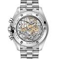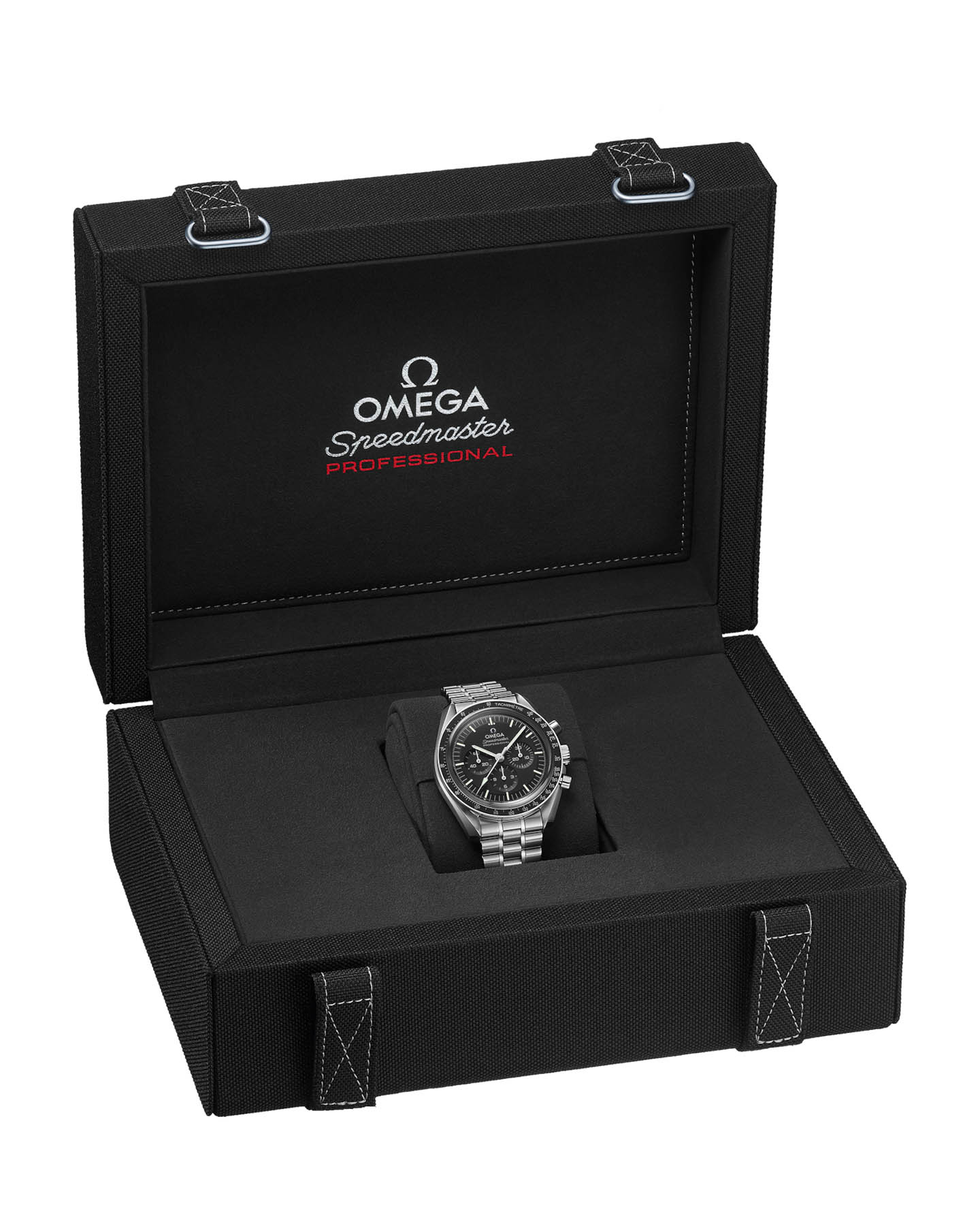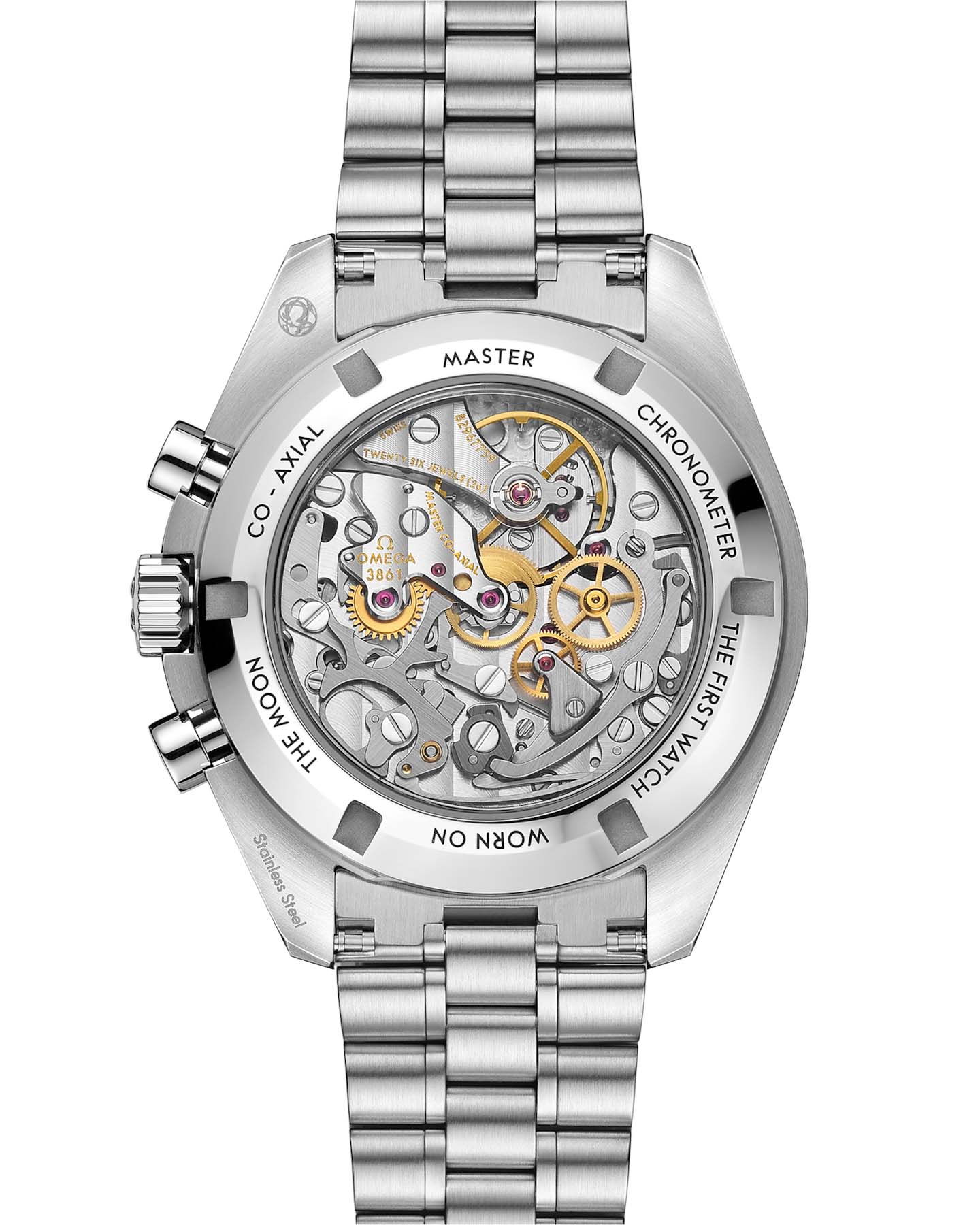 Speedmaster Moonwatch – культовые часы, заслужившие мировое признание. Шесть миссий на Луну сделали их символом новаторского духа OMEGA. Moonwatch представлены с пятизвенным браслетом с матовой отделкой и 42-миллиметровым корпусом из нержавеющей стали Сапфировое стеклоСапфировое стеклоПрочный и надёжный материал из кристалла сапфира синтетического происхождения, характеризующийся особой твёрдостью и устойчивостью к царапинам и повреждениям. установлено с лицевой и задней стороны корпуса. Дизайн повторяет черты Speedmaster 4-го поколения - первых часов на Луне. Асимметричный корпус сочетается с черным многоуровневым циферблатом и характерной точкой у отметки 90 на безелеБезельВнешний ободок, закрепляющий стекло. В спортивных часах так называется поворотное кольцо с делениями на циферблате, выполняет роль таймера – замеряет отрезки времени на шкале. Неподвижный безель – элемент декора. Однонаправленно вращающийся безель на дайверских часах позволяет фиксировать моменты погружения и выныривания на поверхность. из анодированного алюминия. В основе - механизм OMEGA Co-Axial Master Chronometer 3861, управляющий счетчиком малой секундной стрелки, 30-минутным и 12-часовым счетчиками, а также центральной хронографнойХронографФункция позволяет измерять отрезки времени с особой точностью: часы, минуты, секунды. Верным признаком хронографа является наличие на циферблате 3 дополнительных окошек-счётчиков. стрелкой.