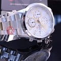 Серебристый аксессуар имеет люминесцентную подсветкуЛюминесцентное покрытиеПозволяет считывать показания времени в темноте. Производители наносят на стрелки, часовые индексы, безель или поверхность циферблата светонакопительный состав, дающий холодное свечение., что позволяет пользоваться часами в темноте. Полезными функциями являются секундомер и отображение даты. Японский кварцевый механизм обеспечивает высокую точность хода. Модель сделана из стали 316L, материал ценится за привлекательный внешний вид, устойчивость к повреждениям. Минеральное стекло не допускает появления царапин.