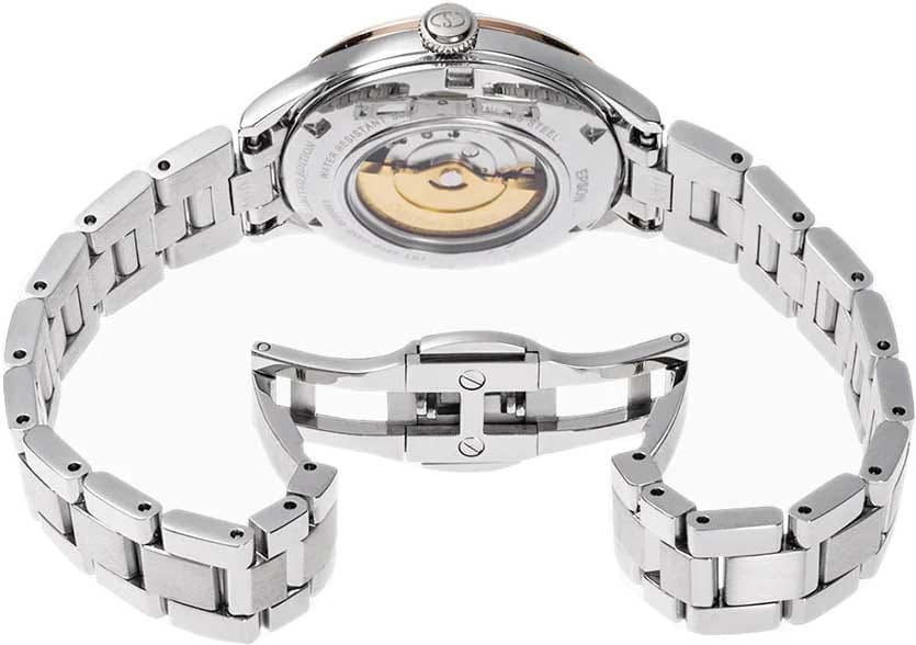 Женские механические часы с автоподзаводом Orient RE-ND0020L — японская надёжность и элегантный дизайн с открытой сердцевиной механизма. Корпус из нержавеющей стали, диаметром 30,5 мм. БезельБезельВнешний ободок, закрепляющий стекло. В спортивных часах так называется поворотное кольцо с делениями на циферблате, выполняет роль таймера – замеряет отрезки времени на шкале. Неподвижный безель – элемент декора. Однонаправленно вращающийся безель на дайверских часах позволяет фиксировать моменты погружения и выныривания на поверхность. из нержавеющей стали с IP-покрытиемIP-покрытиеМетод ионного напыления. Демонстрирует повышенную устойчивость к истиранию, окислению и химическим веществам. Под воздействием высокого давления и температуры около 1500°C молекулы металла надёжно соединяются с частицами корпуса часов.. Циферблат — голубой градиентный с римскими цифрами. Стекло — минеральноеМинеральное стеклоМинеральное стекло представляет собой искусственно выращенный минерал кварца. Такое стекло отличается особой устойчивостью к повреждениям и царапинам. Уступает по некоторым качествам сапфировому стеклу., устойчивое к мелким повреждениям. Браслет стальной на застёжке «бабочка» с кнопкамиЗастёжка "бабочка"Такой вид застёжки дополняется предохранителями, помогающими избежать случайного раскрытия браслета. Обладают изящным исполнением. . Водонепроницаемость 50 м. Идеальный выбор для тех, кто ценит японское качество и изысканный стиль.