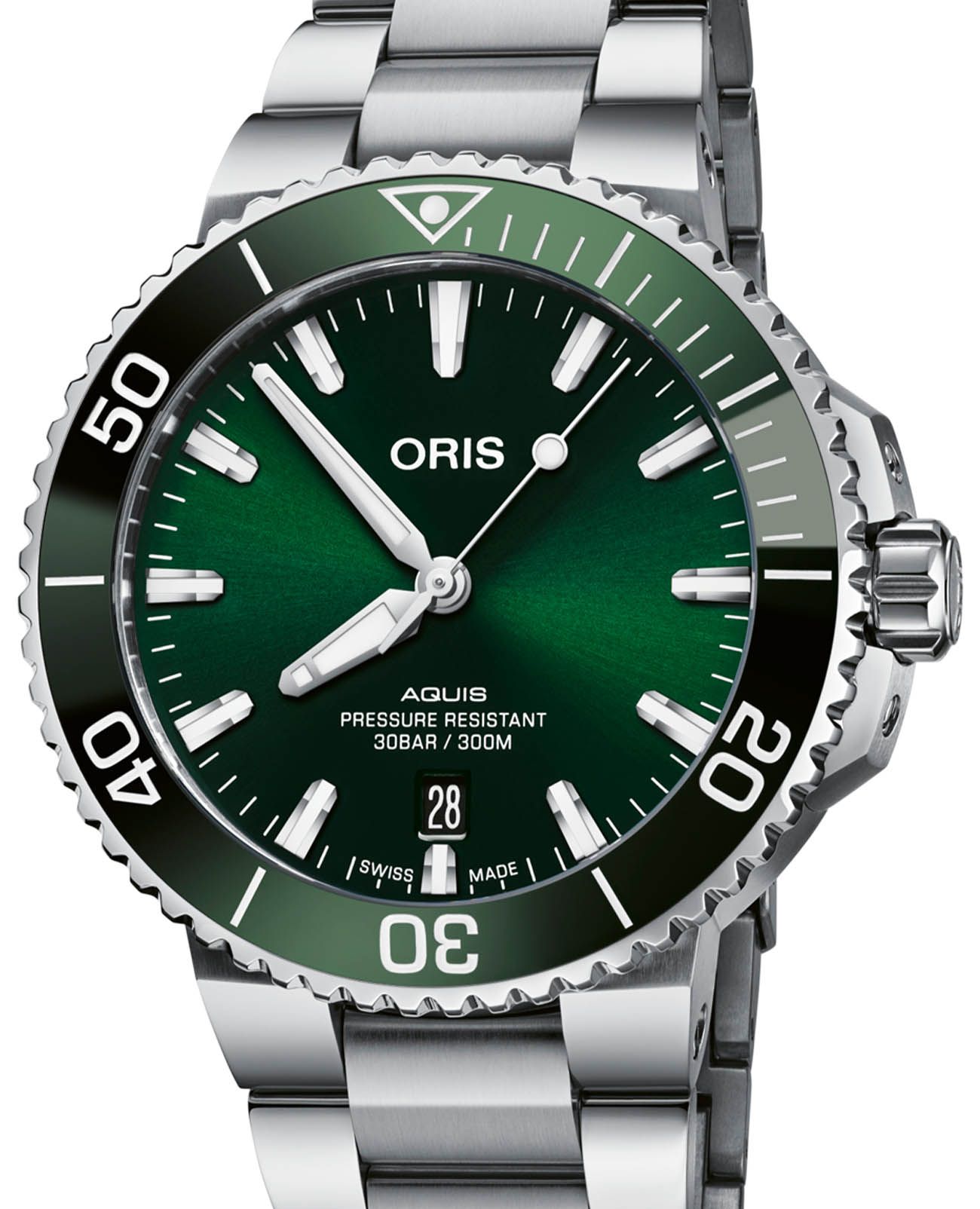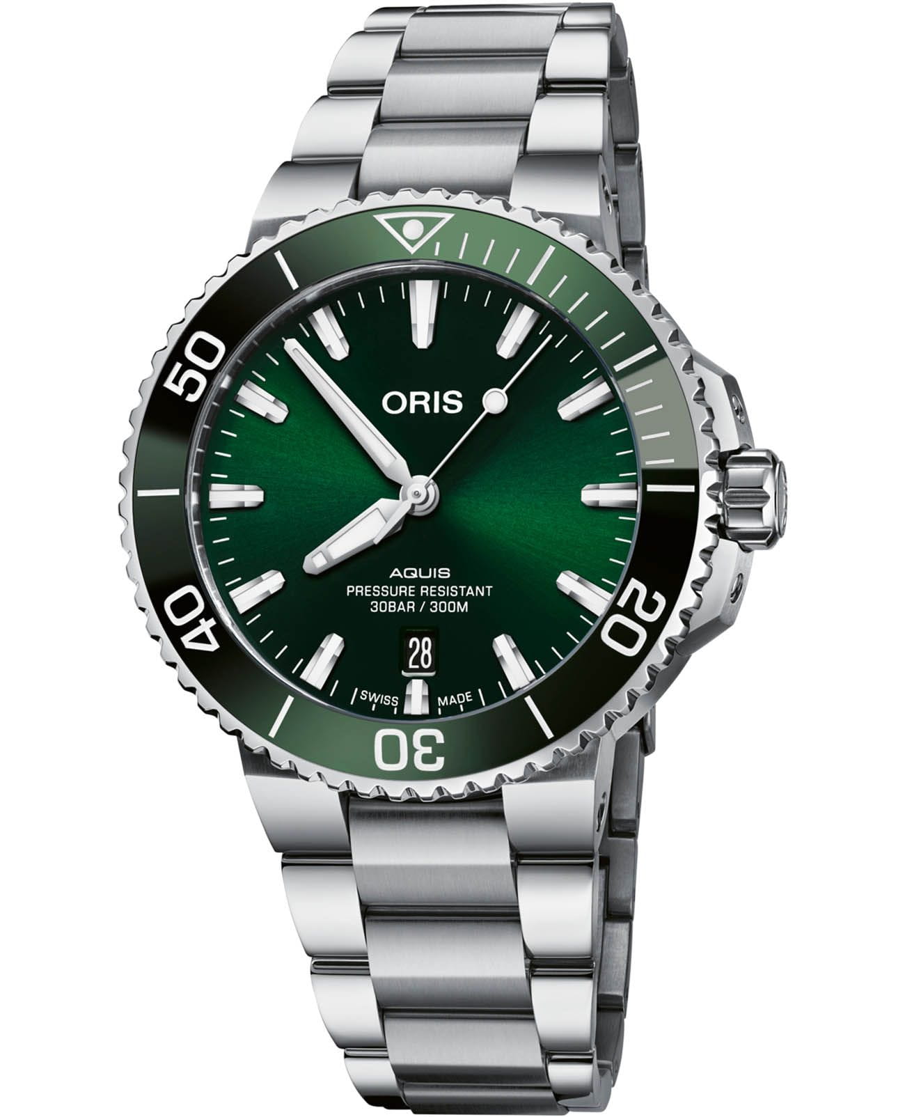 Швейцарские мужские часы ORIS AQUIS — это идеальное сочетание элегантного дизайна и профессиональных характеристик для активного образа жизни. Модель 01 733 7766 4157-07 8 22 05PEB из коллекции AQUIS создана для тех, кто ценит точность, надежность и стиль. Корпус диаметром 41.5 мм изготовлен из высококачественной нержавеющей стали с керамическим ободком, на котором расположена минутная шкала. Циферблат защищен выпуклым сапфировым стеклом с антибликовым покрытиемСапфировое стеклоПрочный и надёжный материал из кристалла сапфира синтетического происхождения, характеризующийся особой твёрдостью и устойчивостью к царапинам и повреждениям., обеспечивающим превосходную видимость в любых условиях освещения. Завинчивающаяся прозрачная задняя крышка из минерального стекла открывает вид на механизм, а завинчивающаяся заводная головка гарантирует повышенную водонепроницаемость. Механизм Oris 733 — это автоматический механизм с автоподзаводом, работающий от движения руки. Запас хода составляет 38 часов. Часы оснащены центральной секундной стрелкой и окошком даты в положении «6 часов», что делает их функциональными для повседневного использования. Стрелки и индексы на циферблате имеют люминесцентное покрытиеЛюминесцентное покрытиеПозволяет считывать показания времени в темноте. Производители наносят на стрелки, часовые индексы, безель или поверхность циферблата светонакопительный состав, дающий холодное свечение., позволяющее легко определять время даже в темноте. Минутные маркеры по внешнему ободу и светящиеся индексы создают четкую и удобную для восприятия компоновку. Браслет из нержавеющей стали шириной 22 мм оснащен надежной раскладной застёжкойРаскладная застёжкаТакой тип застёжки используется только на браслетах из металла. Она никогда не раскрывается полностью, происходит разделение на 2 и более частей. Раскладывающая застёжка снизит вероятность потери часов к минимуму., которая обеспечивает комфортную фиксацию на запястье. Вращающийся в одном направлении безель с черным кольцом помогает точно отслеживать продолжительность погружений. Часы обладают впечатляющей водонепроницаемостью до 30 бар (300 метров), что делает их идеальными для плавания, ныряния и погружений с аквалангом.
