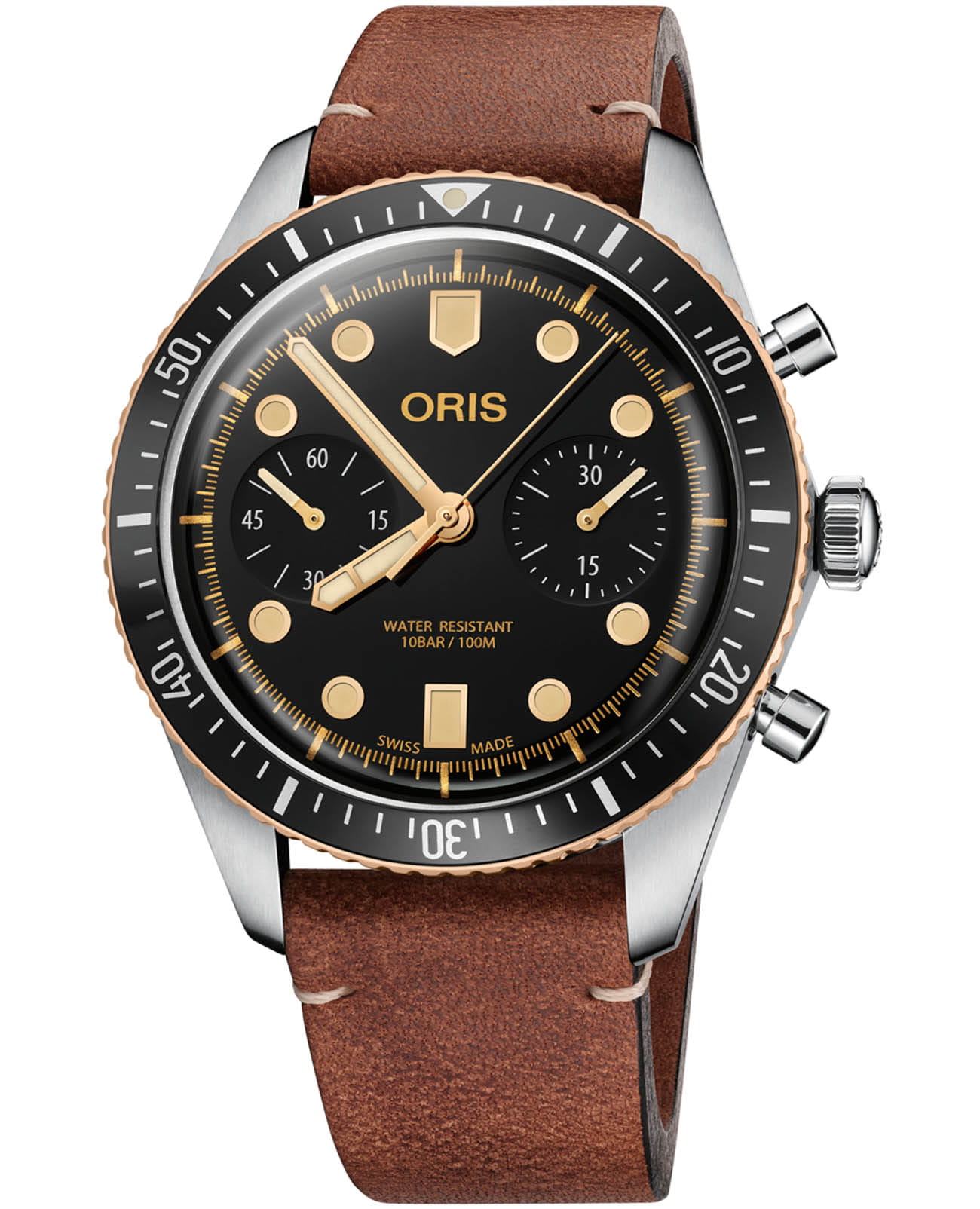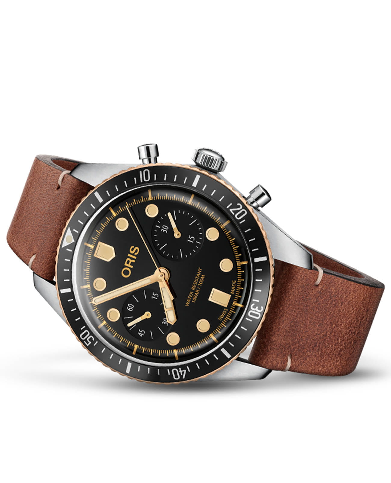 Швейцарские мужские часы ORIS DIVERS SIXTY-FIVE — это воплощение классического дизайна ретро-дайверских часов с современными технологиями. Модель 01 771 7744 4354-07 8 21 18 из коллекции Divers Sixty-Five создана для тех, кто ценит уникальность, точность и надежность. Корпус диаметром 43 мм выполнен из многокомпонентного материала: сочетания бронзы и нержавеющей стали, что придает часам не только прочность, но и особый винтажный шарм. Поворотный ободок с минутной шкалой помогает точно отслеживать продолжительность погружений. Циферблат защищен выпуклым сапфировое стеклоСапфировое стеклоПрочный и надёжный материал из кристалла сапфира синтетического происхождения, характеризующийся особой твёрдостью и устойчивостью к царапинам и повреждениям. с антибликовым покрытиемАнтибликовое покрытиеСлой оксида металла в 0,13-0,3 микрон, благодаря которому стекло часов не бликует и не отражает свет. Антибликовое покрытие уменьшает отражение света в 10 раз, обеспечивая отличную читаемость показателей циферблата., обеспечивающим отличную читаемость показаний даже при ярком освещении. Механизм Oris 771 (на базе SW 510) — это автоматический механизм с автоподзаводом, работающий от движения руки. Запас хода составляет 48 часов. Часы оснащены функциями хронографаХронографФункция позволяет измерять отрезки времени с особой точностью: часы, минуты, секунды. Верным признаком хронографа является наличие на циферблате 3 дополнительных окошек-счётчиков.: центральная секундная стрелка хронографа с шагом в 1/4 секунды, два дополнительных циферблата с маленькой секундной стрелкой постоянного вращения и 30-минутным счетчиком. Также предусмотрена функция коррекции даты и остановка секундной стрелки при подводке времени. Стрелки и индексы покрыты составом Super-LumiNova, люминесцентное покрытиеЛюминесцентное покрытиеПозволяет считывать показания времени в темноте. Производители наносят на стрелки, часовые индексы, безель или поверхность циферблата светонакопительный состав, дающий холодное свечение., что обеспечивает превосходную видимость в темноте. Вращающийся в одном направлении безель с минутной шкалой добавляет функциональности для подводных погружений. Кожаный ремешок на стандартной застёжке. Завинчивающаяся задняя крышка из нержавеющей стали с специальной гравировкой и завинчивающаяся заводная головка обеспечивают водонепроницаемость до 10 бар (WR100), что делает эти часы идеальными для плавания и других водных видов спорта.