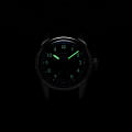 Многокомпонентный корпус из нержавеющей стали. Сапфировое стеклоСапфировое стеклоПрочный и надёжный материал из кристалла сапфира синтетического происхождения, характеризующийся особой твёрдостью и устойчивостью к царапинам и повреждениям., выпуклое с обеих сторон, внутреннее антибликовое покрытие. Нержавеющая сталь, завинчивающаяся прозрачная задняя крышка из минерального стеклаМинеральное стеклоМинеральное стекло представляет собой искусственно выращенный минерал кварца. Такое стекло отличается особой устойчивостью к повреждениям и царапинам. Уступает по некоторым качествам сапфировому стеклу.. Стрелки с люминесцентным покрытиемЛюминесцентное покрытиеПозволяет считывать показания времени в темноте. Производители наносят на стрелки, часовые индексы, безель или поверхность циферблата светонакопительный состав, дающий холодное свечение.. Кожаный ремень.