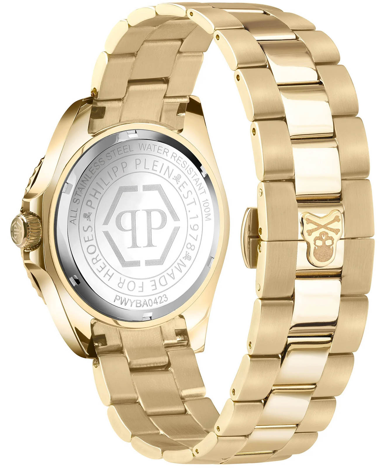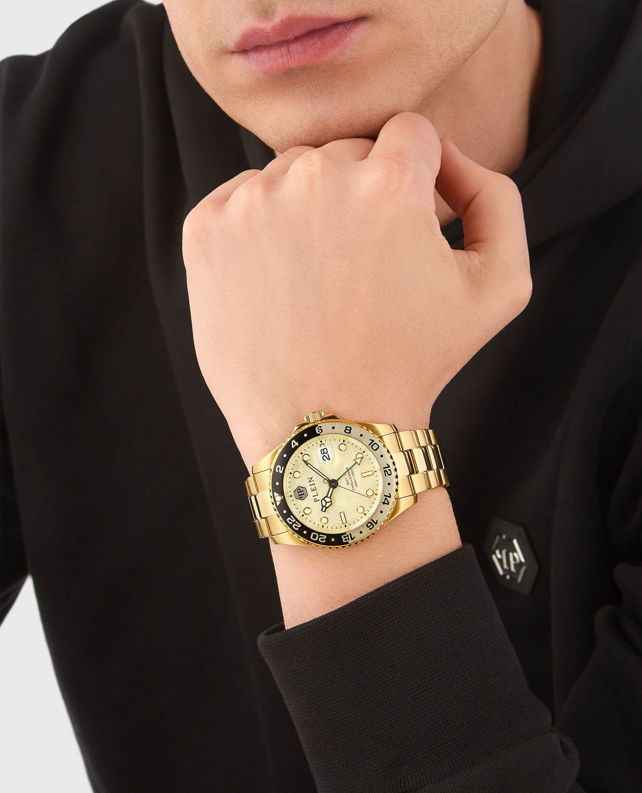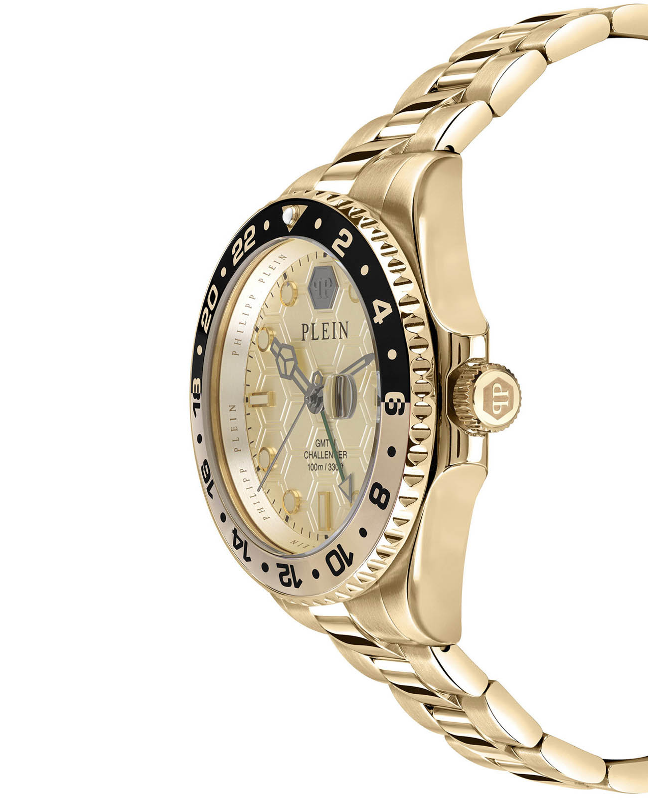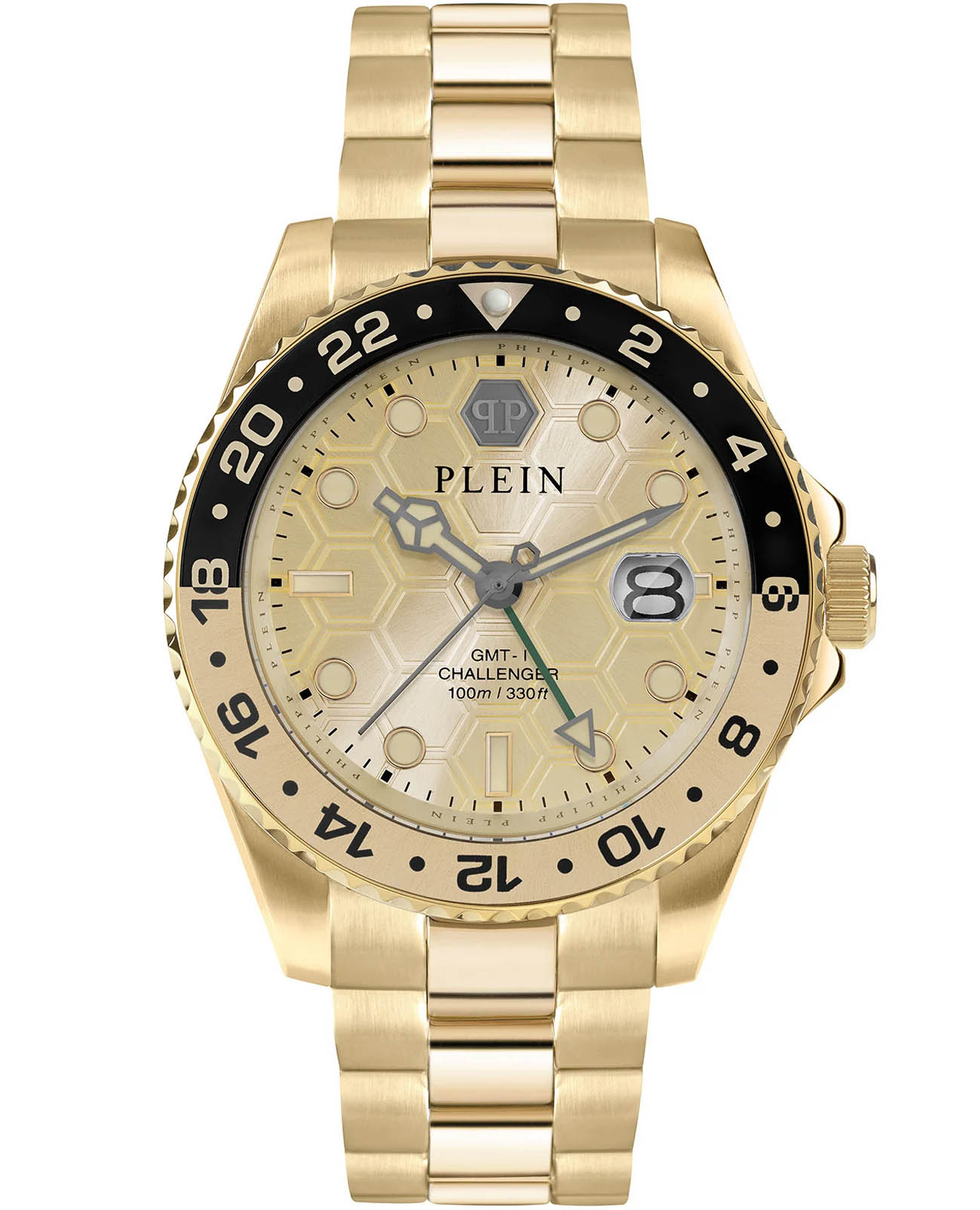 Мужские часы Philipp Plein GMT-I Challenger PWYBA0423 с надежным кварцевым механизмом. Корпус и браслет часов изготовлены из нержавеющей стали с IP-покрытиемIP-покрытиеМетод ионного напыления. Демонстрирует повышенную устойчивость к истиранию, окислению и химическим веществам. Под воздействием высокого давления и температуры около 1500°C молекулы металла надёжно соединяются с частицами корпуса часов.. Минеральное стеклоМинеральное стеклоМинеральное стекло представляет собой искусственно выращенный минерал кварца. Такое стекло отличается особой устойчивостью к повреждениям и царапинам. Уступает по некоторым качествам сапфировому стеклу. устойчивое к мелким механическим повреждениям. Влагозащита: 100 метров, позволит плавать, нырять и заниматься другими водными видами спорта. Стрелки и метки с люминесцентным покрытиемЛюминесцентное покрытиеПозволяет считывать показания времени в темноте. Производители наносят на стрелки, часовые индексы, безель или поверхность циферблата светонакопительный состав, дающий холодное свечение.. Окошко даты находится в положении 3 часа. Вращающийся безельБезельВнешний ободок, закрепляющий стекло. В спортивных часах так называется поворотное кольцо с делениями на циферблате, выполняет роль таймера – замеряет отрезки времени на шкале. Неподвижный безель – элемент декора. Однонаправленно вращающийся безель на дайверских часах позволяет фиксировать моменты погружения и выныривания на поверхность. с PVD-покрытиемPVDУльтратонкое покрытие наносится в технике вакуумного напыления, сочетает в себе нитрид титана особой прочности со слоем золота или оксида хрома. Несёт в себе декоративную или защитную функцию.. Стальной браслет на застёжке-бабочке с кнопкамиЗастёжка "бабочка"Такой вид застёжки дополняется предохранителями, помогающими избежать случайного раскрытия браслета. Обладают изящным исполнением. .