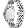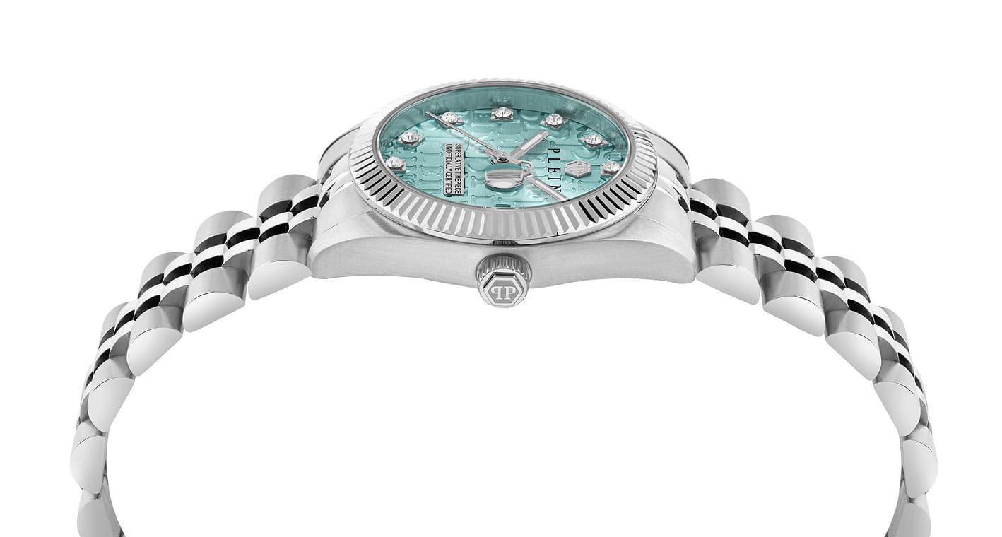 Philipp Plein DATE SUPERLATIVE PWNFA0225 - дерзкое заявление любви к роскоши и бунтарскому стилю. Диаметр круглого корпуса из прочной нержавеющей стали равен 28 мм. Стальной браслет на застёжке «бабочка» с кнопкамиЗастёжка "бабочка"Такой вид застёжки дополняется предохранителями, помогающими избежать случайного раскрытия браслета. Обладают изящным исполнением. обеспечивает надёжную фиксацию и комфортное ношение. Метки в виде кристаллов Preciosa. Минеральное стеклоМинеральное стеклоМинеральное стекло представляет собой искусственно выращенный минерал кварца. Такое стекло отличается особой устойчивостью к повреждениям и царапинам. Уступает по некоторым качествам сапфировому стеклу. защищает циферблат от царапин. Люминесцентное покрытиеЛюминесцентное покрытиеПозволяет считывать показания времени в темноте. Производители наносят на стрелки, часовые индексы, безель или поверхность циферблата светонакопительный состав, дающий холодное свечение. стрелок и меток позволит следить за временем даже в полной темноте. Граненая заводная головка. Влагозащита: 50 метров, позволит защитить корпус от случайных брызг или капель дождя. Идеальный аксессуар для тех, кто ценит индивидуальность и не боится выделяться из толпы.