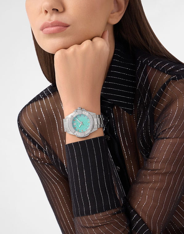 Philipp Plein Plein Majesty PWOFA0425 - дерзкое заявление любви к роскоши и бунтарскому стилю. Диаметр круглого корпуса из прочной нержавеющей стали равен 38 мм. Стальной браслет на застёжке-бабочке с кнопкамиЗастёжка "бабочка"Такой вид застёжки дополняется предохранителями, помогающими избежать случайного раскрытия браслета. Обладают изящным исполнением. обеспечивает надёжную фиксацию и комфортное ношение. Метки в виде кристаллов Preciosa. Минеральное стеклоМинеральное стеклоМинеральное стекло представляет собой искусственно выращенный минерал кварца. Такое стекло отличается особой устойчивостью к повреждениям и царапинам. Уступает по некоторым качествам сапфировому стеклу. защищает циферблат от царапин. Люминесцентное покрытиеЛюминесцентное покрытиеПозволяет считывать показания времени в темноте. Производители наносят на стрелки, часовые индексы, безель или поверхность циферблата светонакопительный состав, дающий холодное свечение. стрелок и меток позволит следить за временем даже в полной темноте. Влагозащита: 50 метров, позволит защитить корпус от случайных брызг или капель дождя. Идеальный аксессуар для тех, кто ценит индивидуальность и не боится выделяться из толпы.