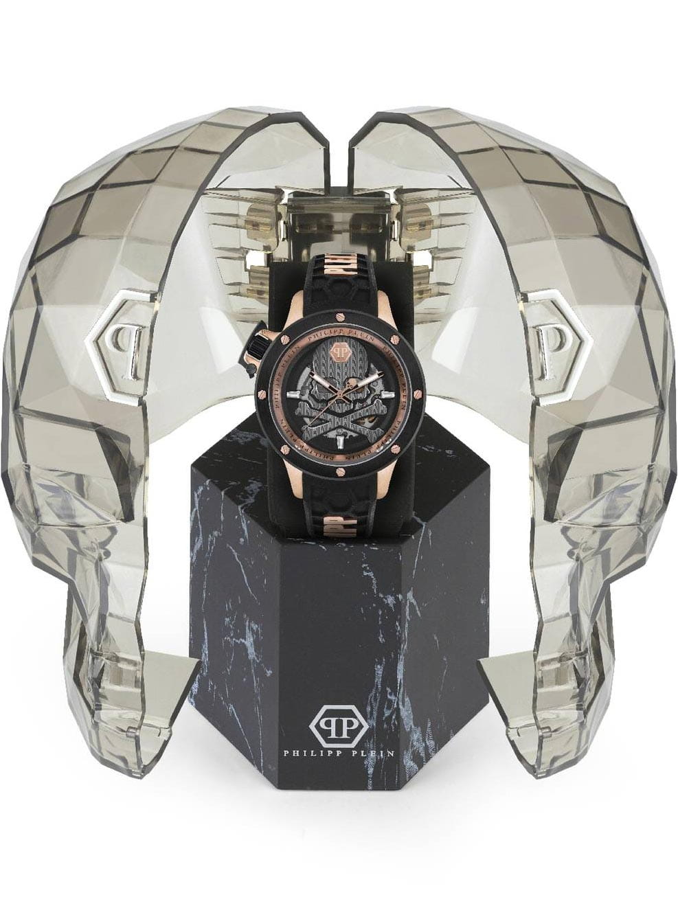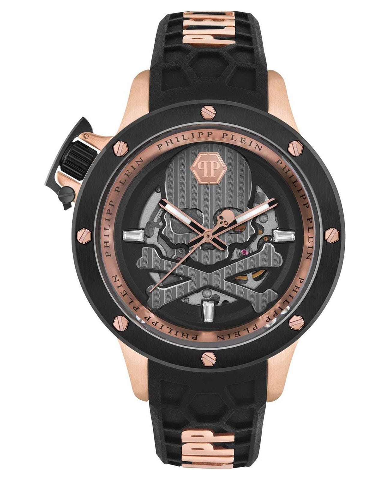 Яркие мужские часы с минеральным стекломМинеральное стеклоМинеральное стекло представляет собой искусственно выращенный минерал кварца. Такое стекло отличается особой устойчивостью к повреждениям и царапинам. Уступает по некоторым качествам сапфировому стеклу. Philipp Plein Plein Rich PWUAA0623, механический механизм с автоподзаводом. Класс водозащиты: 50 метров, позволит защитить корпус от случайных брызг или капель дождя. Корпус часов изготовлен из стали с IP-покрытиемIP-покрытиеМетод ионного напыления. Демонстрирует повышенную устойчивость к истиранию, окислению и химическим веществам. Под воздействием высокого давления и температуры около 1500°C молекулы металла надёжно соединяются с частицами корпуса часов. и украшен кристаллами. Стрелки с люминесцентным покрытиемЛюминесцентное покрытиеПозволяет считывать показания времени в темноте. Производители наносят на стрелки, часовые индексы, безель или поверхность циферблата светонакопительный состав, дающий холодное свечение..