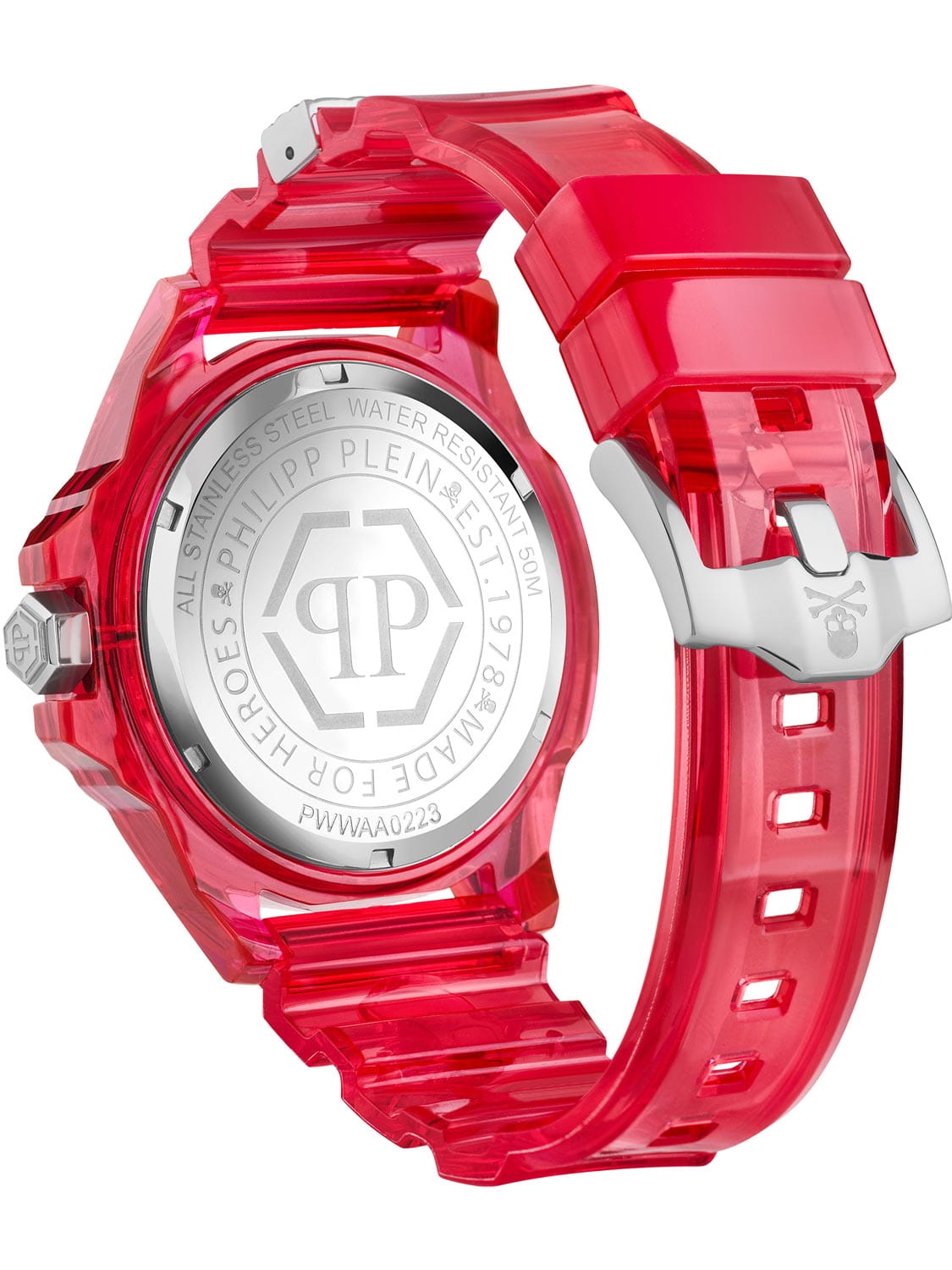 Модель Philipp Plein PWWAA0223 из коллекции The $kull Scuba Duba Edition — это выразительный аксессуар, сочетающий в себе смелый дизайн и функциональность. Корпус диаметром 44 мм выполнен из пластика, подчёркивая современный стиль модели. Чёрный циферблат с фирменным черепом Philipp Plein придаёт часам характерный вид.