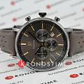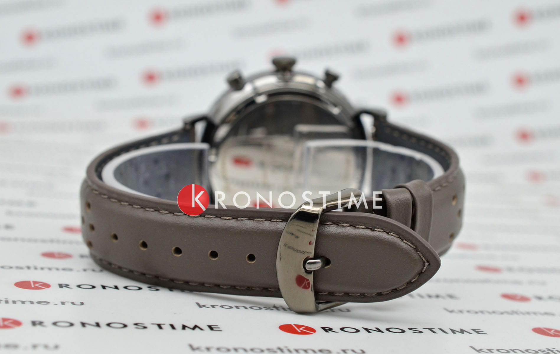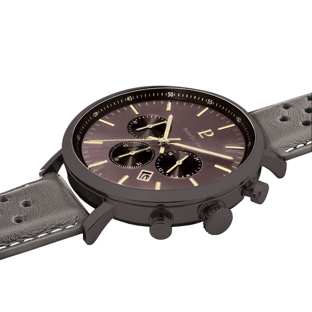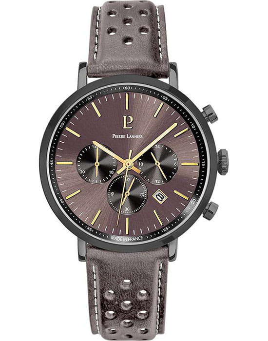 Pierre Lannier Baron 220H490 — выразительный мужской хронограф с индустриальной эстетикой. Диаметр корпуса — 43 мм, выполнен из нержавеющей стали с антрацитовым PVDPVDУльтратонкое покрытие наносится в технике вакуумного напыления, сочетает в себе нитрид титана особой прочности со слоем золота или оксида хрома. Несёт в себе декоративную или защитную функцию.-покрытием, придающим мужественный и современный вид . Циферблат графитового оттенка с эффектом «солнечного луча» украшен тремя функциональными счётчиками: 24‑часовые, секунднометрические и минутные — дополнены аккуратным окном даты между «4 и 5 часами». Чёткие часовые метки и стрелки в золотистом исполнении создают чёткий контраст с тёмным фоном . Циферблат защищён минеральным стекломМинеральное стеклоМинеральное стекло представляет собой искусственно выращенный минерал кварца. Такое стекло отличается особой устойчивостью к повреждениям и царапинам. Уступает по некоторым качествам сапфировому стеклу., устойчивым к повседневным воздействиям. Механизм — надёжный японский кварцевый Miyota (JS25) с функцией хронографа, простой в использовании и обслуживании Ремешок выполнен из перфорированной серой кожи классической ширины 20 мм, обеспечивая комфорт и дыхание коже. Завершён традиционной пряжкой. Водозащита до 5 ATM (≈50 м) позволяет спокойно носить часы в условиях случайных брызг и дождя Baron  — это гармония строгого индустриального стиля, универсальности и точной функциональности хронографа, подчеркнутых качественным PVD-покрытием и практичными материалами.