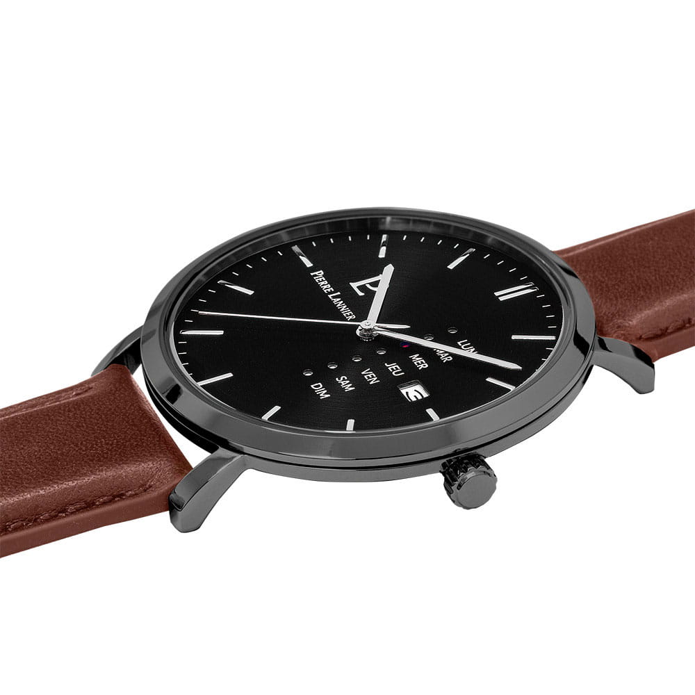 Мужские кварцевые часы Pierre Lannier Data 243H434. Минеральное стеклоМинеральное стеклоМинеральное стекло представляет собой искусственно выращенный минерал кварца. Такое стекло отличается особой устойчивостью к повреждениям и царапинам. Уступает по некоторым качествам сапфировому стеклу. устойчивое к мелким механическим повреждениям. Центральные часовая и минутная стрелки. Апертура даты в позиции 3 часов. Отображение дня недели. Корпус выполнен из нержавеющей стали с IP-покрытиемIP-покрытиеМетод ионного напыления. Демонстрирует повышенную устойчивость к истиранию, окислению и химическим веществам. Под воздействием высокого давления и температуры около 1500°C молекулы металла надёжно соединяются с частицами корпуса часов.. Водостойкость: 30 метров, позволит защитить корпус от случайных брызг или капель дождя. Кожаный ремешок на стандартной застёжке.