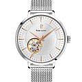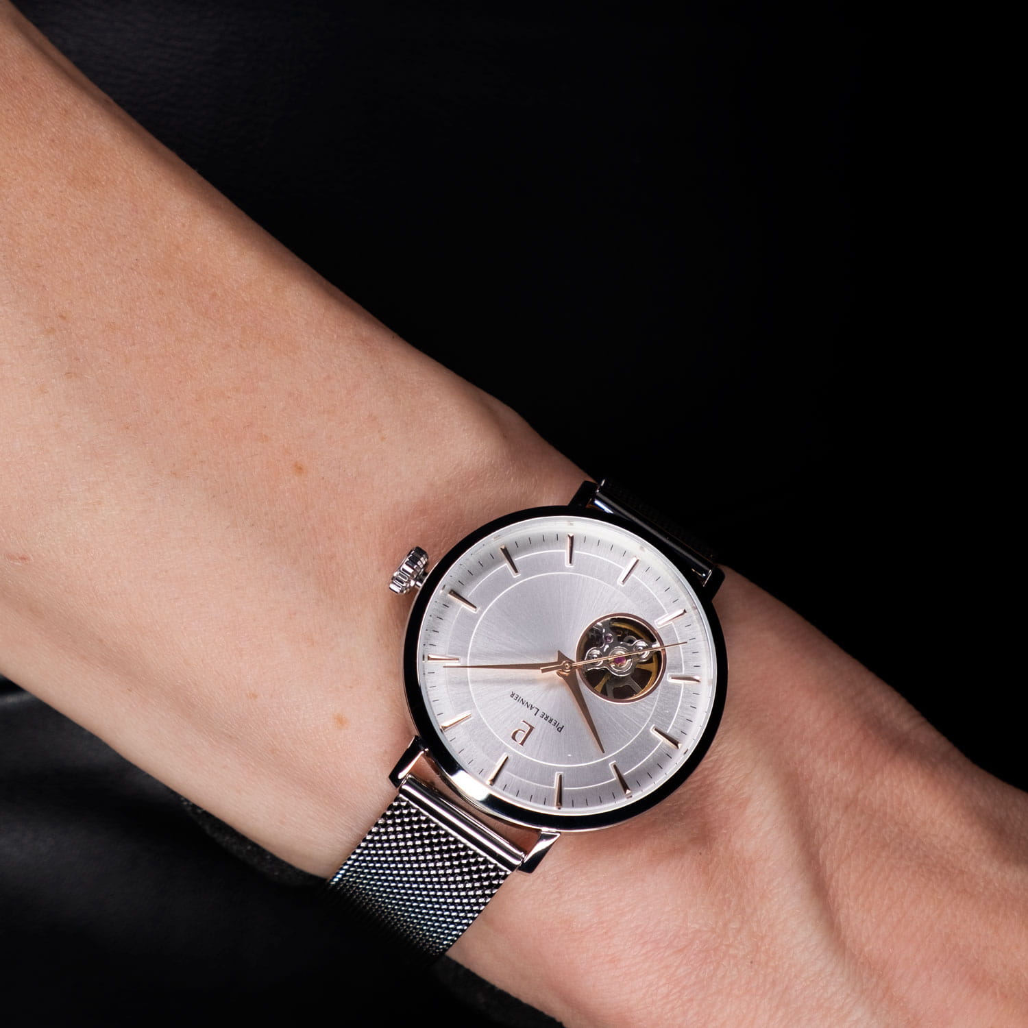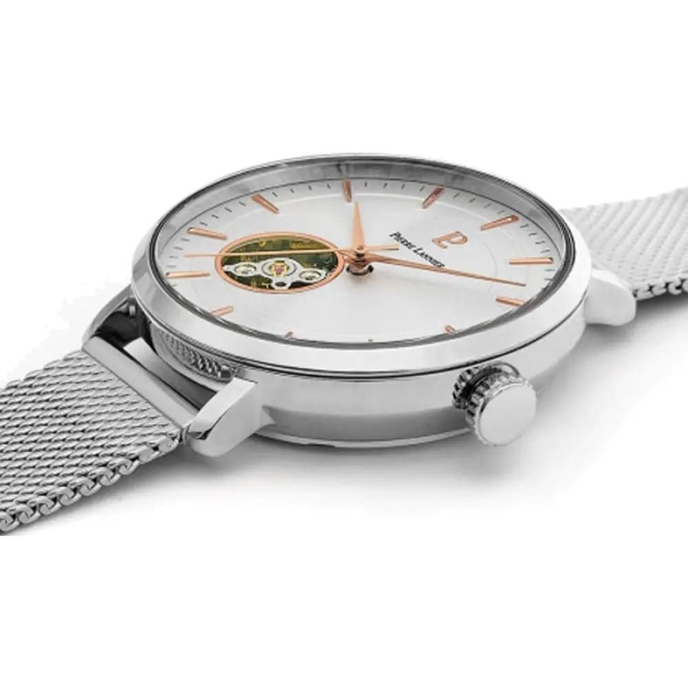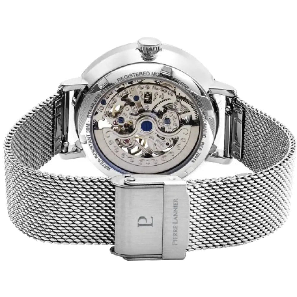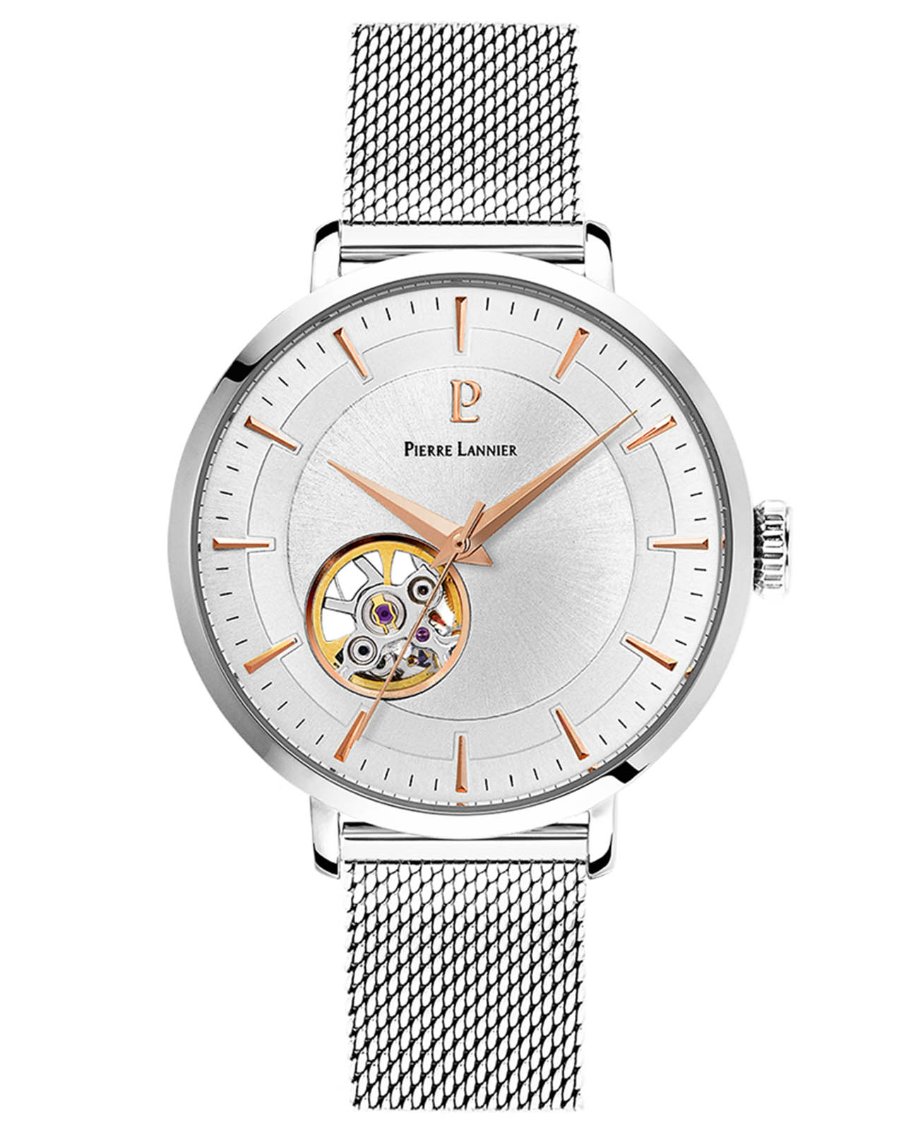 Женские механические часы с автоподзаводом Pierre Lannier Automatic 306F628. Минеральное стеклоМинеральное стеклоМинеральное стекло представляет собой искусственно выращенный минерал кварца. Такое стекло отличается особой устойчивостью к повреждениям и царапинам. Уступает по некоторым качествам сапфировому стеклу. устойчивое к мелким механическим повреждениям. Центральные часовая, минутная и секундная стрелки. Серебристый циферблат с часовыми индексами в виде штрихов. Корпус и браслет выполнен из нержавеющей стали. Водостойкость: 30 метров, позволит защитить корпус от случайных брызг или капель дождя. Прозрачная задняя крышка. Браслет миланского плетения с раскладной застёжкойРаскладная застёжкаТакой тип застёжки используется только на браслетах из металла. Она никогда не раскрывается полностью, происходит разделение на 2 и более частей. Раскладывающая застёжка снизит вероятность потери часов к минимуму..