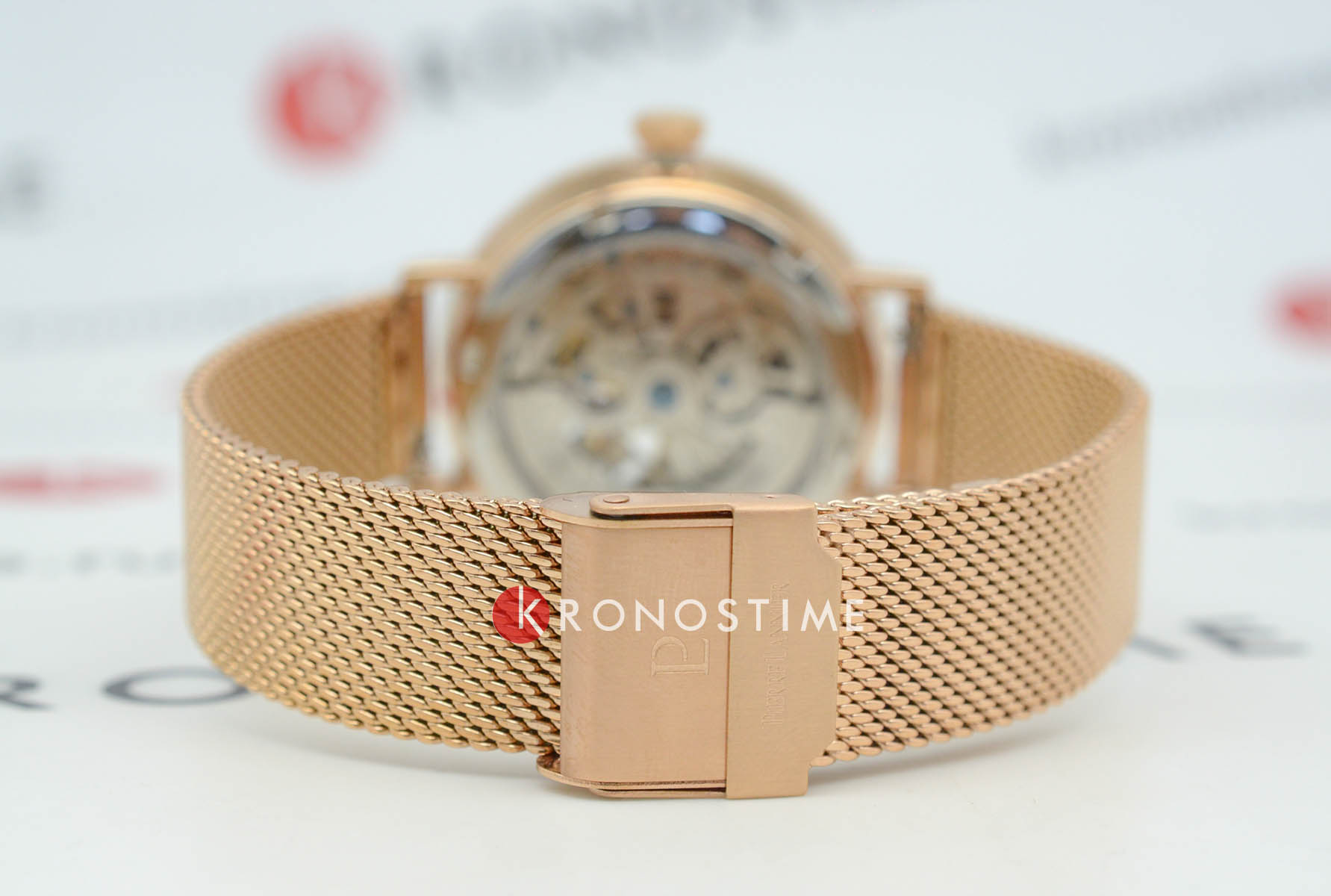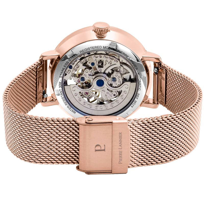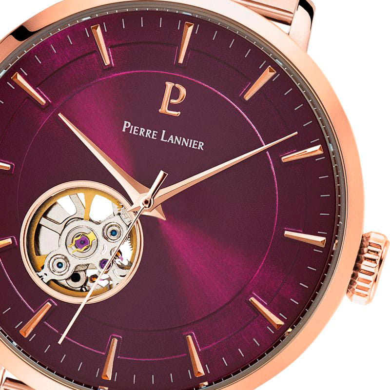 Женские механические часы с автоподзаводом Pierre Lannier Automatic 307F988. Минеральное стеклоМинеральное стеклоМинеральное стекло представляет собой искусственно выращенный минерал кварца. Такое стекло отличается особой устойчивостью к повреждениям и царапинам. Уступает по некоторым качествам сапфировому стеклу. устойчивое к мелким механическим повреждениям. Центральные часовая, минутная и секундная стрелки. Фиолетовый циферблат с часовыми индексами в виде штрихов. Корпус и браслет выполнен из нержавеющей стали с IP-покрытиемIP-покрытиеМетод ионного напыления. Демонстрирует повышенную устойчивость к истиранию, окислению и химическим веществам. Под воздействием высокого давления и температуры около 1500°C молекулы металла надёжно соединяются с частицами корпуса часов.. Водостойкость: 30 метров, позволит защитить корпус от случайных брызг или капель дождя. Прозрачная задняя крышка. Браслет миланского плетения с раскладной застёжкойРаскладная застёжкаТакой тип застёжки используется только на браслетах из металла. Она никогда не раскрывается полностью, происходит разделение на 2 и более частей. Раскладывающая застёжка снизит вероятность потери часов к минимуму..