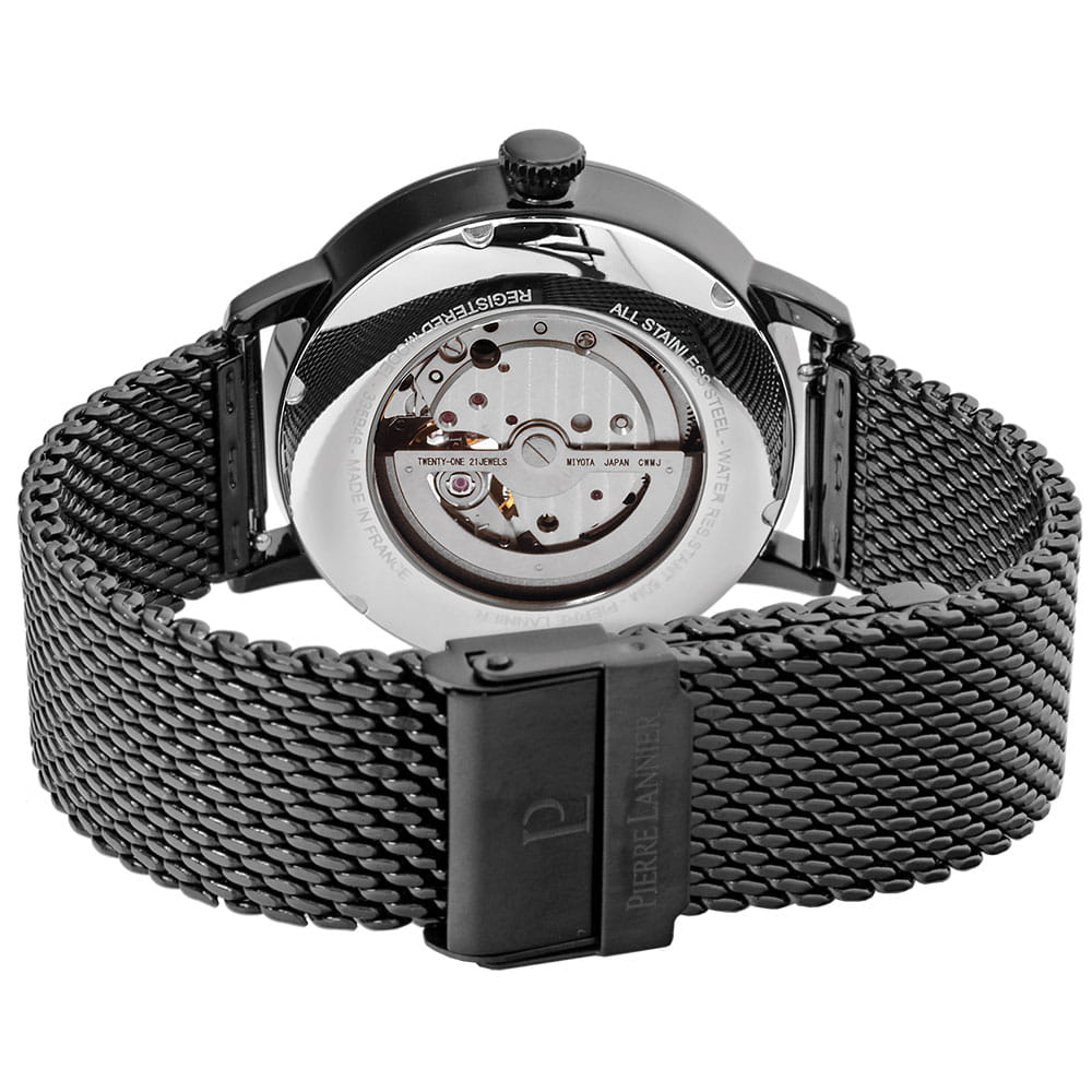 Мужские механические часы с автоподзаводом Pierre Lannier Trio 379D439. Минеральное стеклоМинеральное стеклоМинеральное стекло представляет собой искусственно выращенный минерал кварца. Такое стекло отличается особой устойчивостью к повреждениям и царапинам. Уступает по некоторым качествам сапфировому стеклу. устойчивое к мелким механическим повреждениям. 12/24х часовой формат времени. Центральные часовая и минутная стрелки, секундная стрелка вынесена на малый циферблат. Корпус выполнен из нержавеющей стали с IP-покрытиемIP-покрытиеМетод ионного напыления. Демонстрирует повышенную устойчивость к истиранию, окислению и химическим веществам. Под воздействием высокого давления и температуры около 1500°C молекулы металла надёжно соединяются с частицами корпуса часов.. Водостойкость: 50 метров, позволит защитить корпус от случайных брызг или капель дождя. Стальной браслет миланского плетения с раскладной застёжкойРаскладная застёжкаТакой тип застёжки используется только на браслетах из металла. Она никогда не раскрывается полностью, происходит разделение на 2 и более частей. Раскладывающая застёжка снизит вероятность потери часов к минимуму.. Черный циферблат с открытым балансом хода. В комплекте кожаный ремешок. Стрелки с люминесцентным покрытиемЛюминесцентное покрытиеПозволяет считывать показания времени в темноте. Производители наносят на стрелки, часовые индексы, безель или поверхность циферблата светонакопительный состав, дающий холодное свечение..