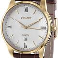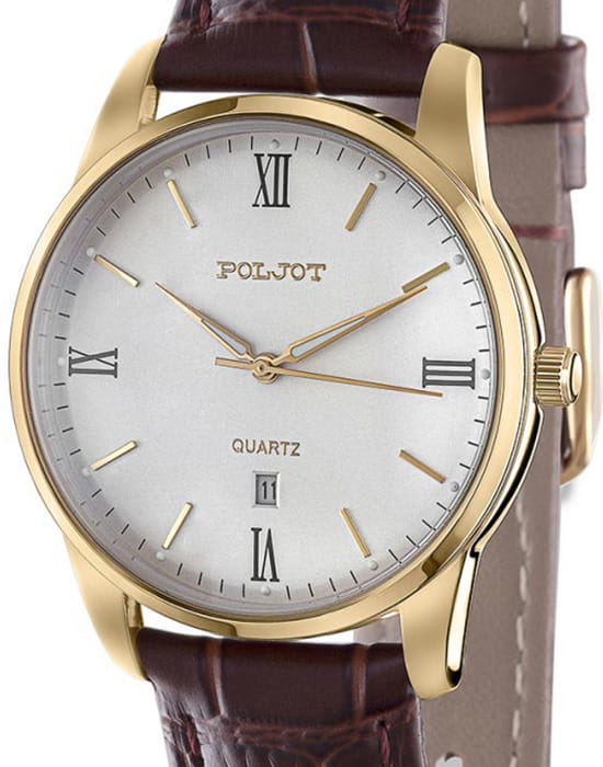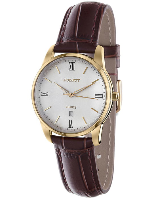 Poljot 2115.4866058 — утончённые женские часы, выполненные в минималистичном классическом стиле, где каждая деталь подчеркивает чистоту формы и изящество линий. Корпус из нержавеющей стали с PVD-покрытиемPVDУльтратонкое покрытие наносится в технике вакуумного напыления, сочетает в себе нитрид титана особой прочности со слоем золота или оксида хрома. Несёт в себе декоративную или защитную функцию. гармонично сочетается с циферблатом, украшенным аккуратными индексами и тонкими стрелками с люминесцентным покрытиемЛюминесцентное покрытиеПозволяет считывать показания времени в темноте. Производители наносят на стрелки, часовые индексы, безель или поверхность циферблата светонакопительный состав, дающий холодное свечение., создающими ощущение лёгкости и баланса. Надёжный кварцевый механизм обеспечивает стабильную точность, а окно даты на позиции «6 часов» добавляет функциональности без нарушения эстетики. Прочное минеральное стеклоМинеральное стеклоМинеральное стекло представляет собой искусственно выращенный минерал кварца. Такое стекло отличается особой устойчивостью к повреждениям и царапинам. Уступает по некоторым качествам сапфировому стеклу. защищает поверхность циферблата от царапин. Классический ремешок из натуральной кожи с фактурой под крокодила придаёт модели сдержанную элегантность. Poljot — это воплощение простоты, стиля и надёжности, идеальный выбор для женщины, предпочитающей чистую классику в современном исполнении.
