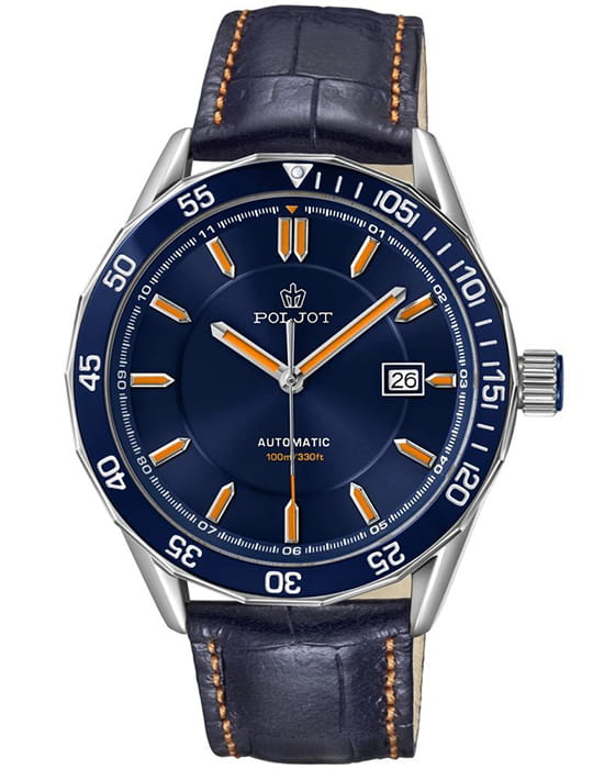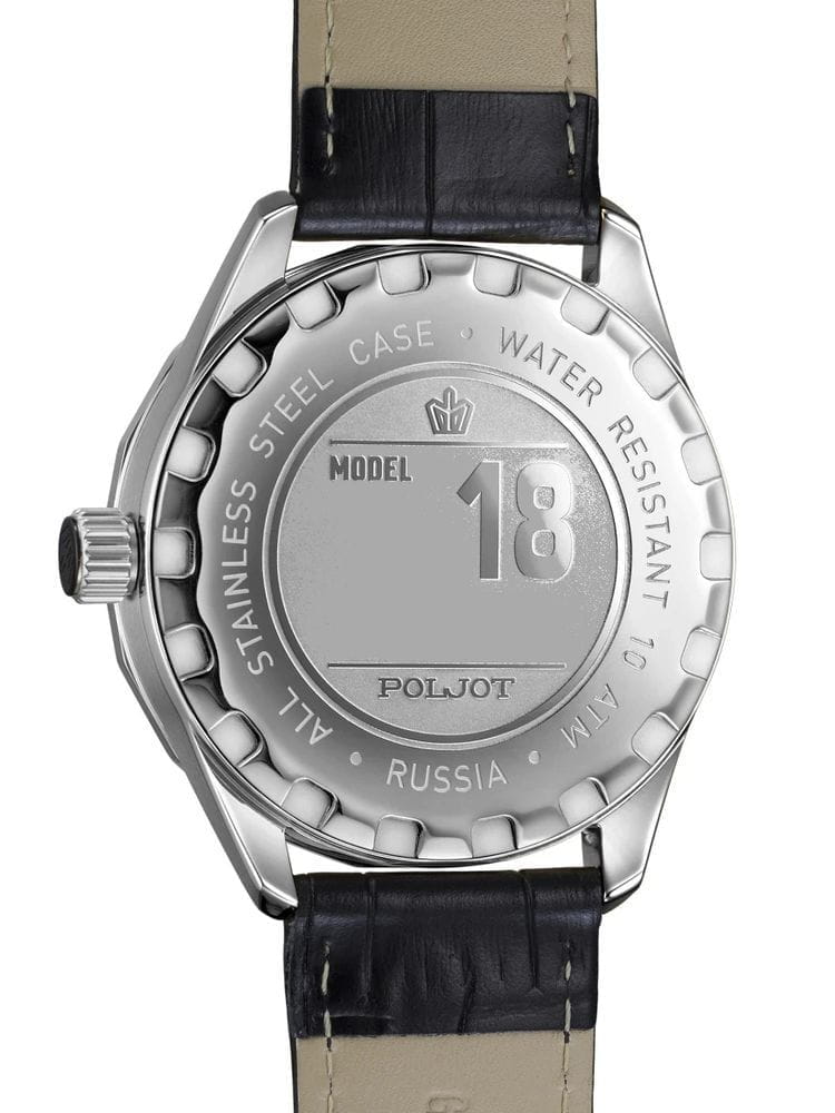 Poljot NH35A.181261 — надёжные механические мужские часы с автоподзаводом, сочетающие техническую точность и выразительный спортивный стиль. Корпус из нержавеющей стали подчёркивает прочность конструкции, а насыщенный циферблат с акцентами на стрелках и метках придаёт модели динамичный и современный облик. БезельБезельВнешний ободок, закрепляющий стекло. В спортивных часах так называется поворотное кольцо с делениями на циферблате, выполняет роль таймера – замеряет отрезки времени на шкале. Неподвижный безель – элемент декора. Однонаправленно вращающийся безель на дайверских часах позволяет фиксировать моменты погружения и выныривания на поверхность. с PVD-покрытиемPVDУльтратонкое покрытие наносится в технике вакуумного напыления, сочетает в себе нитрид титана особой прочности со слоем золота или оксида хрома. Несёт в себе декоративную или защитную функцию.. Внутри установлен проверенный японский механизм SEIKO NH35, обеспечивающий стабильную работу и плавный ход секундной стрелки. Окно даты добавляет функциональности, а широкие метки с люминесцентным покрытиемЛюминесцентное покрытиеПозволяет считывать показания времени в темноте. Производители наносят на стрелки, часовые индексы, безель или поверхность циферблата светонакопительный состав, дающий холодное свечение. обеспечивают отличную читаемость даже в темноте. Прочное минеральное стеклоМинеральное стеклоМинеральное стекло представляет собой искусственно выращенный минерал кварца. Такое стекло отличается особой устойчивостью к повреждениям и царапинам. Уступает по некоторым качествам сапфировому стеклу. защищает циферблат от царапин, а ремешок из натуральной кожи с контрастной прострочкой гарантирует комфорт и надёжную посадку. Poljot NH35A/181261 — часы с характером, созданные для тех, кто ценит точность, качество и спортивную уверенность в каждой детали.
