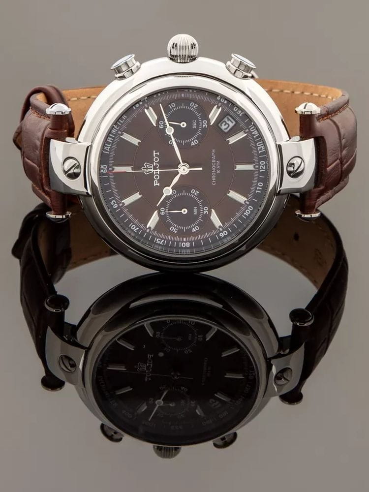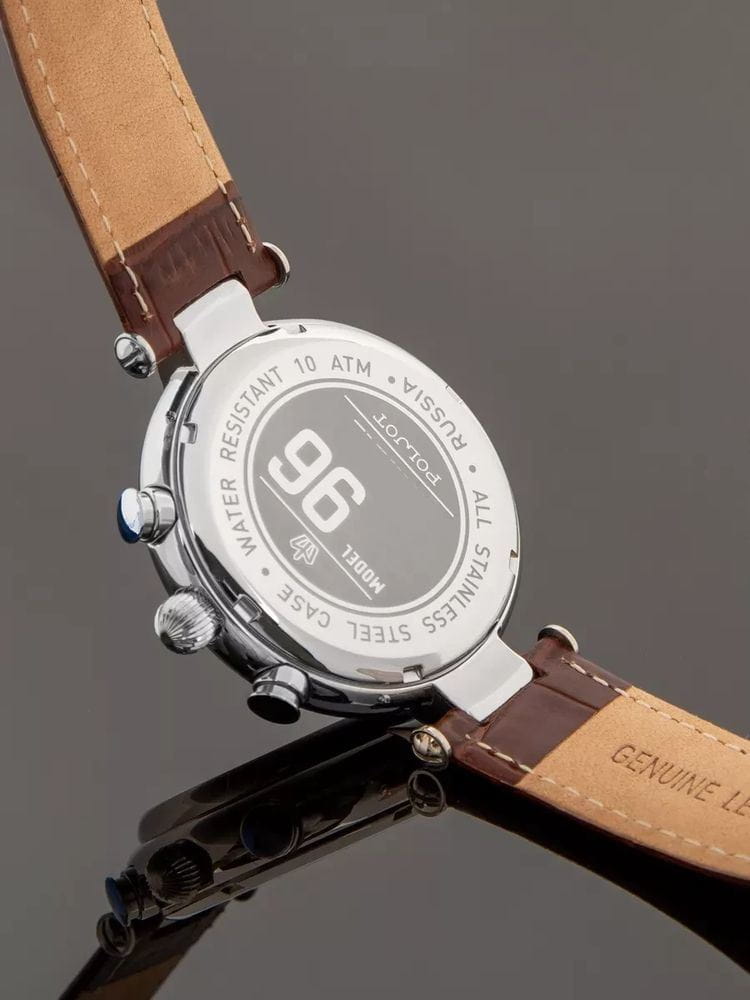 Poljot 6S21.961225 “Baikal” — элегантные кварцевые мужские часы, в которых классическая строгость сочетается с выразительным российским характером. Корпус из нержавеющей стали с крупными декоративными ушками придаёт модели солидность и узнаваемость, а глубокий циферблат с контрастными стрелками и индексами с люминесцентным покрытиемЛюминесцентное покрытиеПозволяет считывать показания времени в темноте. Производители наносят на стрелки, часовые индексы, безель или поверхность циферблата светонакопительный состав, дающий холодное свечение. подчёркивает точность и функциональность. Два дополнительных счётчика хронографаХронографФункция позволяет измерять отрезки времени с особой точностью: часы, минуты, секунды. Верным признаком хронографа является наличие на циферблате 3 дополнительных окошек-счётчиков. обеспечивают измерение времени с высокой точностью, а окно даты добавляет практичности. Прочное минеральное стеклоМинеральное стеклоМинеральное стекло представляет собой искусственно выращенный минерал кварца. Такое стекло отличается особой устойчивостью к повреждениям и царапинам. Уступает по некоторым качествам сапфировому стеклу. защищает циферблат от царапин, а ремешок из натуральной кожи с классической пряжкой гарантирует комфорт и надёжную фиксацию на запястье. Poljot “Baikal” — это сочетание традиций, надёжности и уверенного стиля, созданное для мужчин, ценящих точность и благородную сдержанность.
