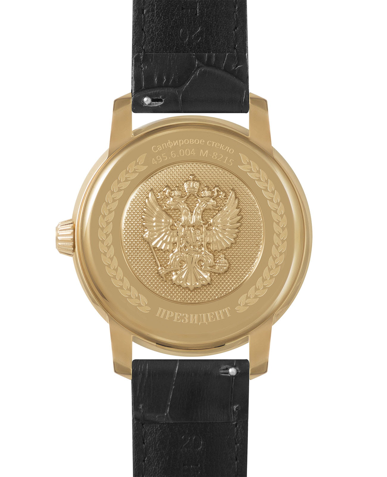 Мужские часы из коллекции «Президент» — это стильный аксессуар, выполненный в желтом золоте и сочетающий в себе элегантность и точность. Модель имеет круглый корпус диаметром 42,9 мм и толщиной 13,7 мм, защищённый сапфировым стекломСапфировое стеклоПрочный и надёжный материал из кристалла сапфира синтетического происхождения, характеризующийся особой твёрдостью и устойчивостью к царапинам и повреждениям., устойчивым к царапинам и механическим повреждениям. Циферблат украшен контуром русской матрешки и инкрустирован кристаллами Swarovski, что придаёт модели особую привлекательность и изысканность. Часы оснащены механизмом с автоподзаводом, обеспечивающим надёжную работу без необходимости частой подзаводки. Задняя крышка с чеканкой Герба России подчёркивает национальную принадлежность и уникальность модели. Кожаный ремешок шириной 20 мм дополнен классической застёжкой, обеспечивая комфорт и элегантный образ. Часы водонепроницаемы до 30 метров (), что позволяет использовать их в повседневных условиях — при мытье рук или под лёгким дождём. Эти часы станут универсальным аксессуаром для тех, кто ценит сочетание стиля, качества и символики — идеальный выбор для уверенных в себе мужчин, следящих за своим имиджем и предпочитающих выделяться.