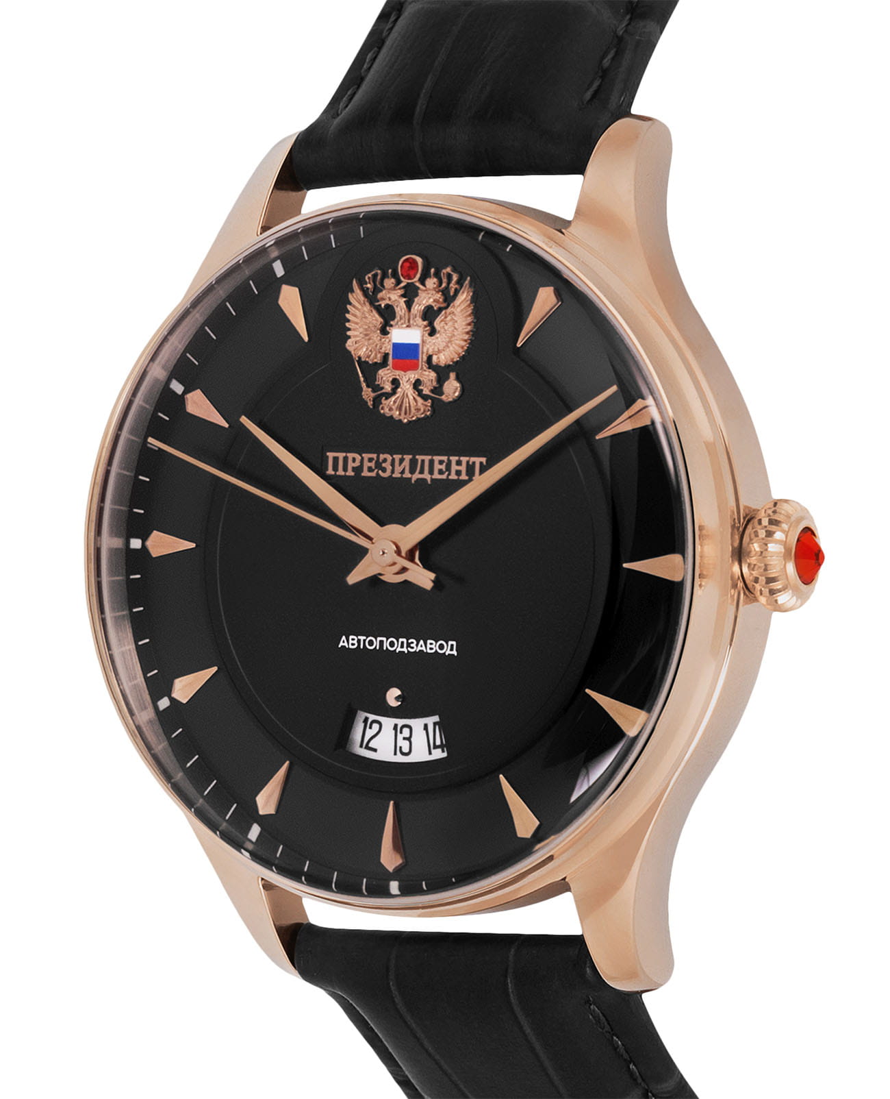 Мужские часы из коллекции «Президент» — это воплощение респектабельности и классического стиля. Модель выполнена в круглой форме с корпусом диаметром 42,2 мм и толщиной 13,8 мм, защищённым минеральным стекломМинеральное стеклоМинеральное стекло представляет собой искусственно выращенный минерал кварца. Такое стекло отличается особой устойчивостью к повреждениям и царапинам. Уступает по некоторым качествам сапфировому стеклу., устойчивым к мелким механическим повреждениям. Цвет корпуса — розовое золото, что придаёт модели благородный внешний вид и подчёркивает её уникальность. Часы оснащены функцией отображения даты и прозрачной задней крышкой, через которую можно наблюдать за работой механизма. На циферблате инкрустированы кристаллы Swarovski, добавляющие модели изысканности и блеска. Браслет чёрного цвета выполнен из натуральной кожи, а его ширина составляет 20 мм, что делает модель удобной и элегантной на запястье. Механизм с автоподзаводом обеспечивает надёжную работу и точность хода. Часы водонепроницаемы до 30 метров (), что позволяет использовать их в повседневных условиях — при мытье рук или под лёгким дождём. Эти часы станут универсальным аксессуаром для тех, кто ценит сочетание стиля, качества и эстетики — идеальный выбор для уверенных в себе мужчин, следящих за своим имиджем и предпочитающих выделяться.