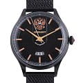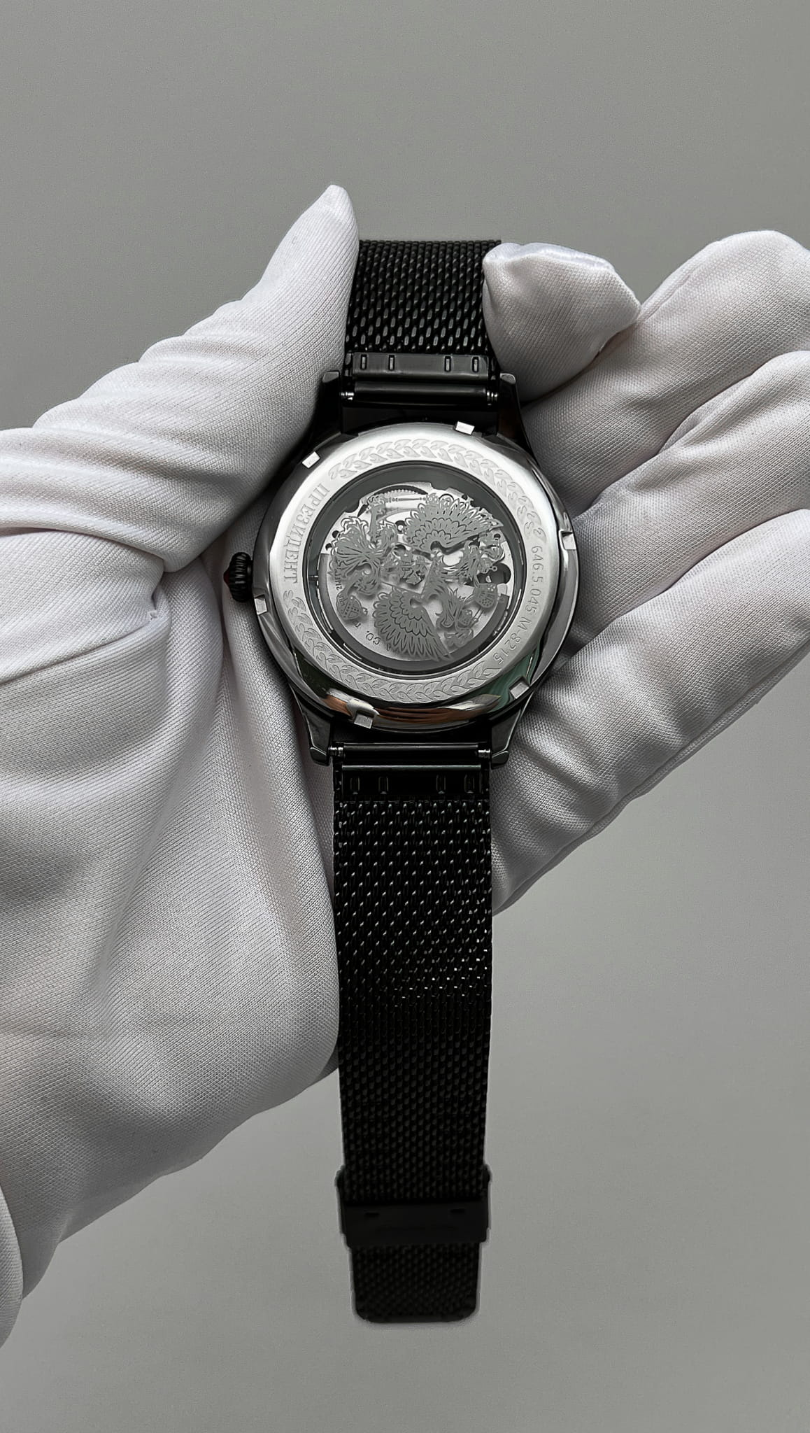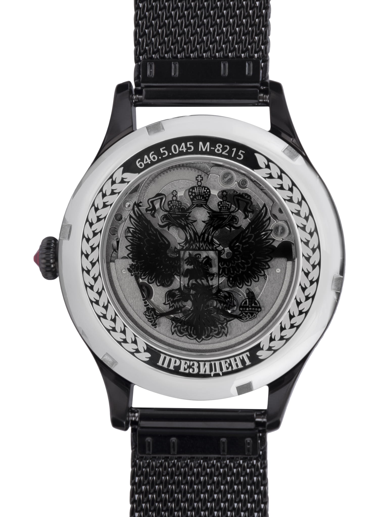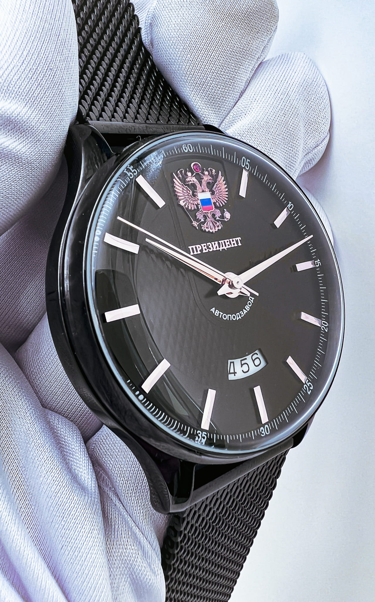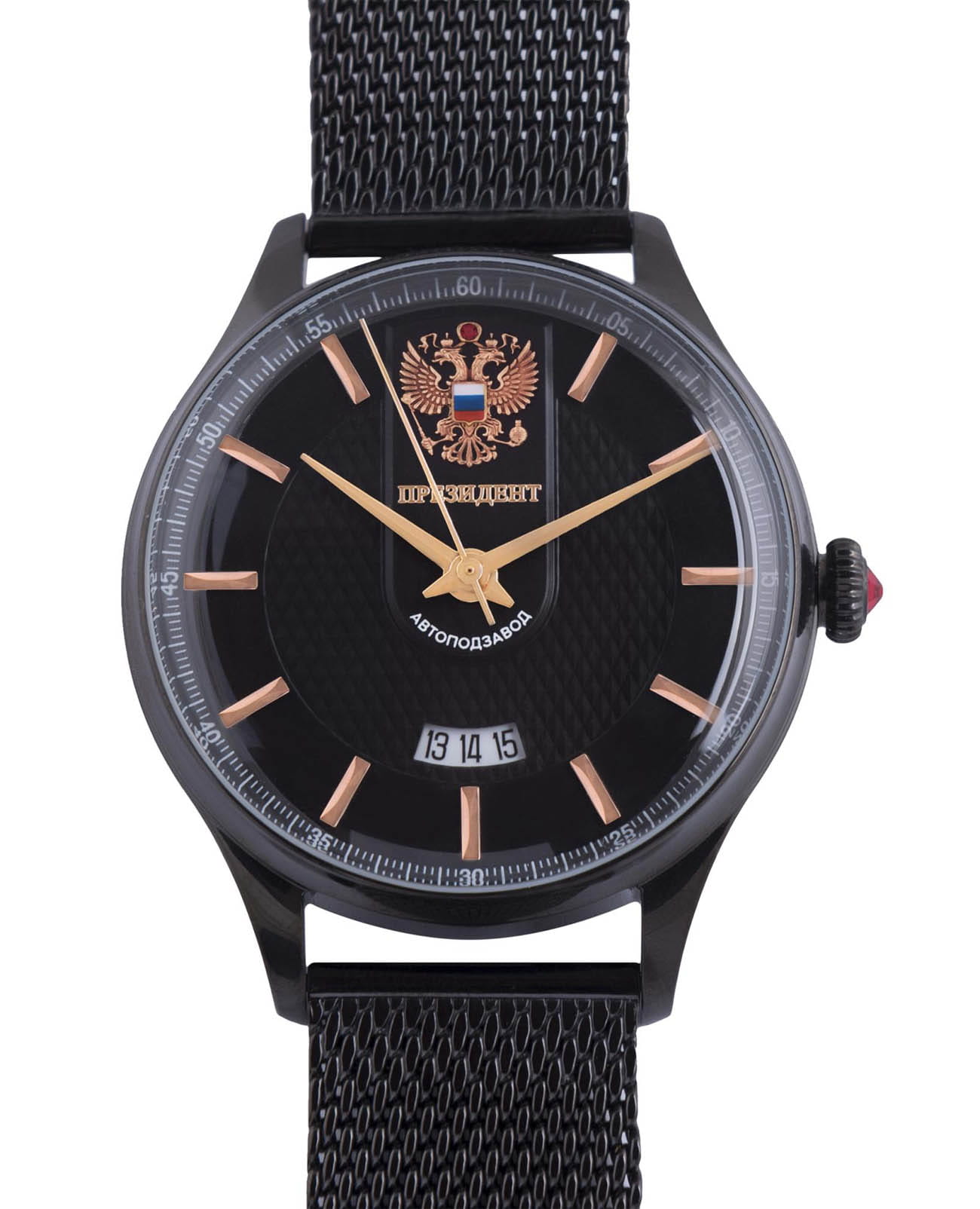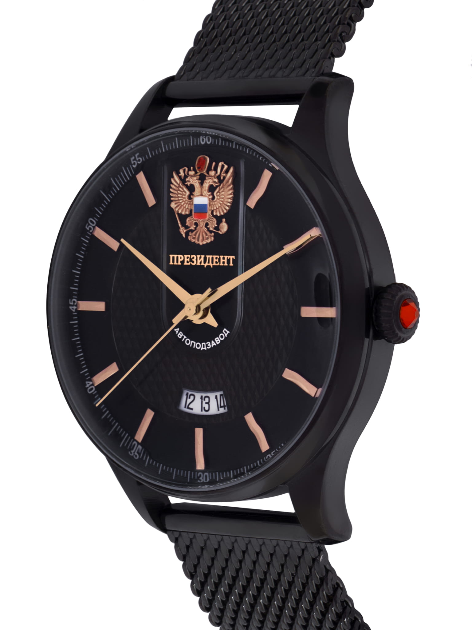 Часы «Президент» модели 6465045 — это мужские механические наручные часы с автоподзаводом, сочетающие изысканный дизайн и высокую функциональность. Механизм: японский механизм Miyota 8215 с автоподзаводом, обеспечивающий точность и долговечность. Функции: часы, минуты, секунды, дата. Корпус: из нержавеющей стали с PVD-покрытиемPVDУльтратонкое покрытие наносится в технике вакуумного напыления, сочетает в себе нитрид титана особой прочности со слоем золота или оксида хрома. Несёт в себе декоративную или защитную функцию., диаметром 42 мм. Циферблат: с изображением государственного герба России, подчёркивающий статусность модели. Стекло: минеральноеМинеральное стеклоМинеральное стекло представляет собой искусственно выращенный минерал кварца. Такое стекло отличается особой устойчивостью к повреждениям и царапинам. Уступает по некоторым качествам сапфировому стеклу., устойчивое к царапинам. Водонепроницаемость: 3 ATM (30 метров), защищает от случайных брызг и дождя. Стальной браслет миланского плетения на раскладном замкеРаскладной замокДанный вариант застежки используется только на часах с металлическим браслетом. Отличительная особенность такого крепления в том, что длина браслета становится универсальной и вы можете самостоятельно отрегулировать нужный вам размер – застежка просто двигается по браслету часов. с PVD-покрытиемPVDУльтратонкое покрытие наносится в технике вакуумного напыления, сочетает в себе нитрид титана особой прочности со слоем золота или оксида хрома. Несёт в себе декоративную или защитную функцию.. Эти часы идеально подойдут для деловых людей, ценящих стиль, надёжность и точность механического хода.